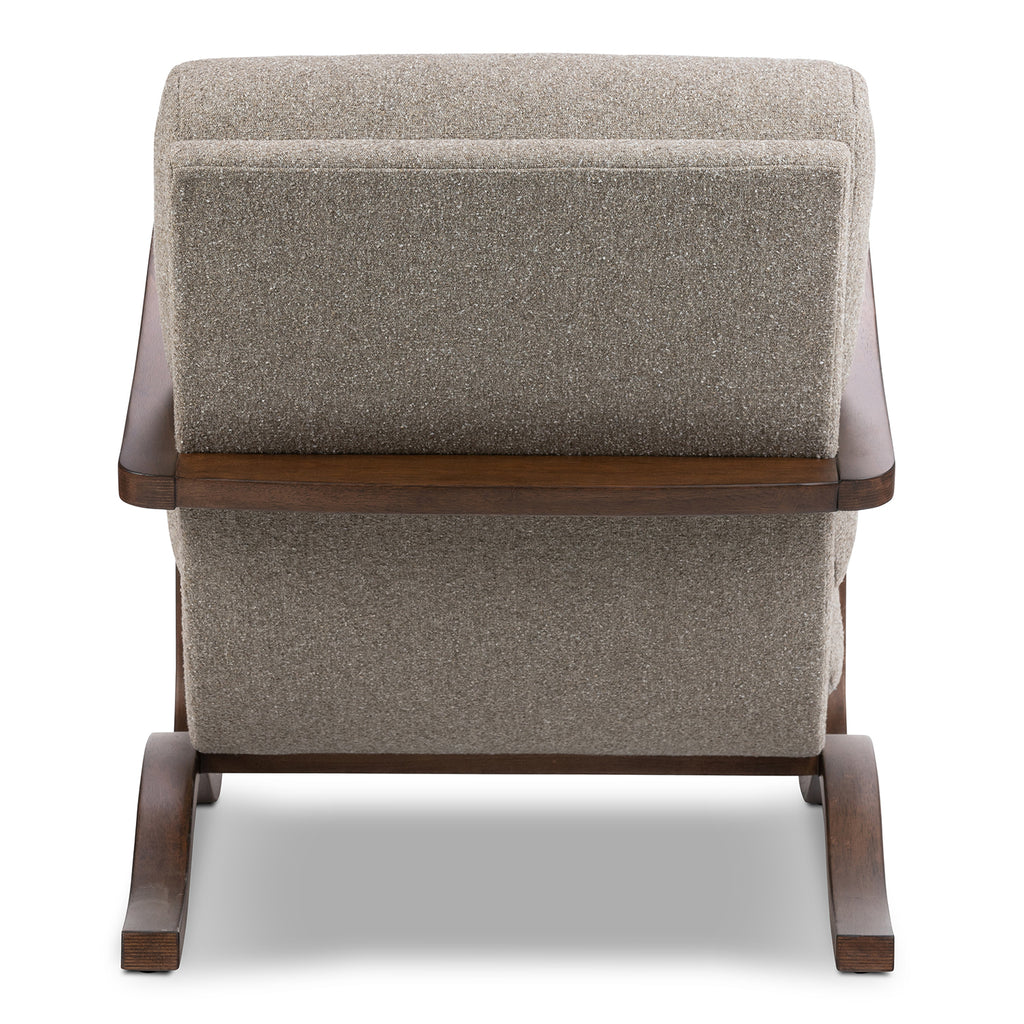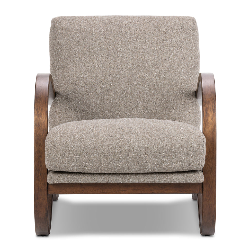 Inspired by vintage rocking chairs, the whimsical frame of this accent chair hugs removable plush feather foam-blend cushions on a webbed suspension style construction for true sink-in comfort. Cushions are upholstered in a new Turkish-made fabric made from 100% recycled olefin yarns with a tweed-like texture and feel.