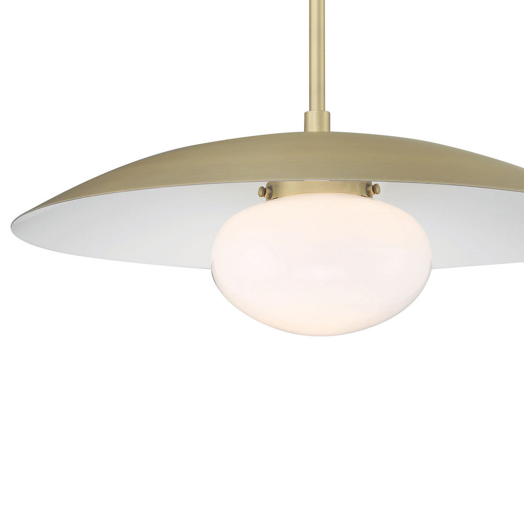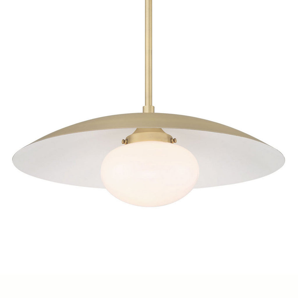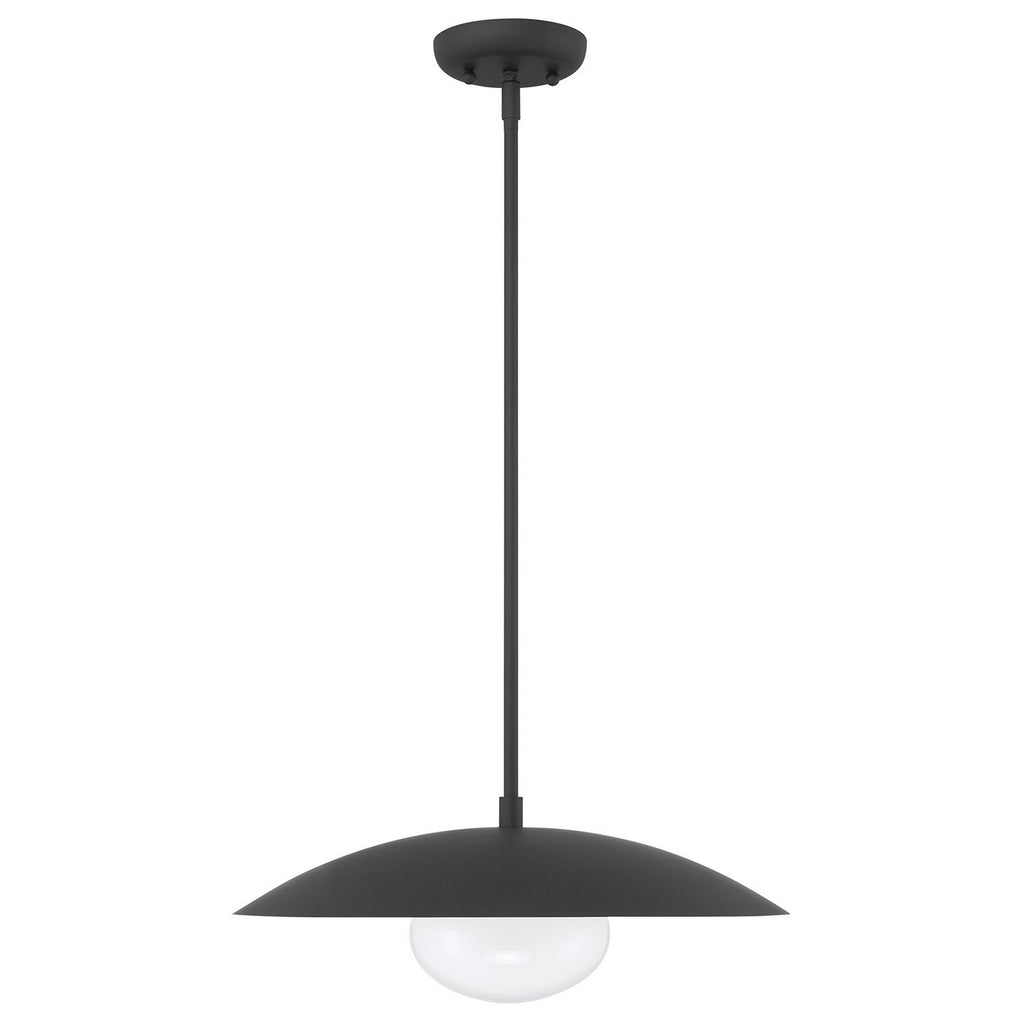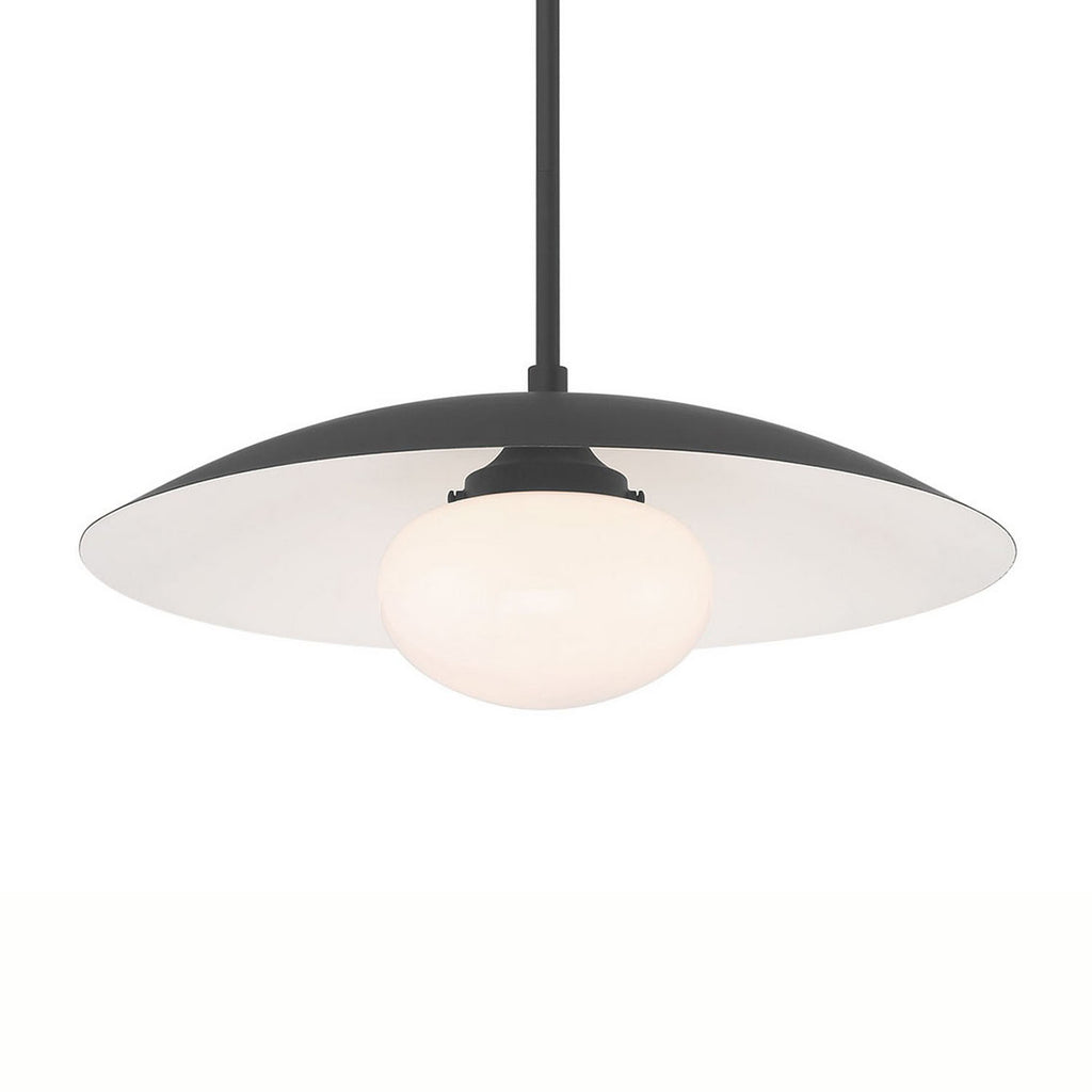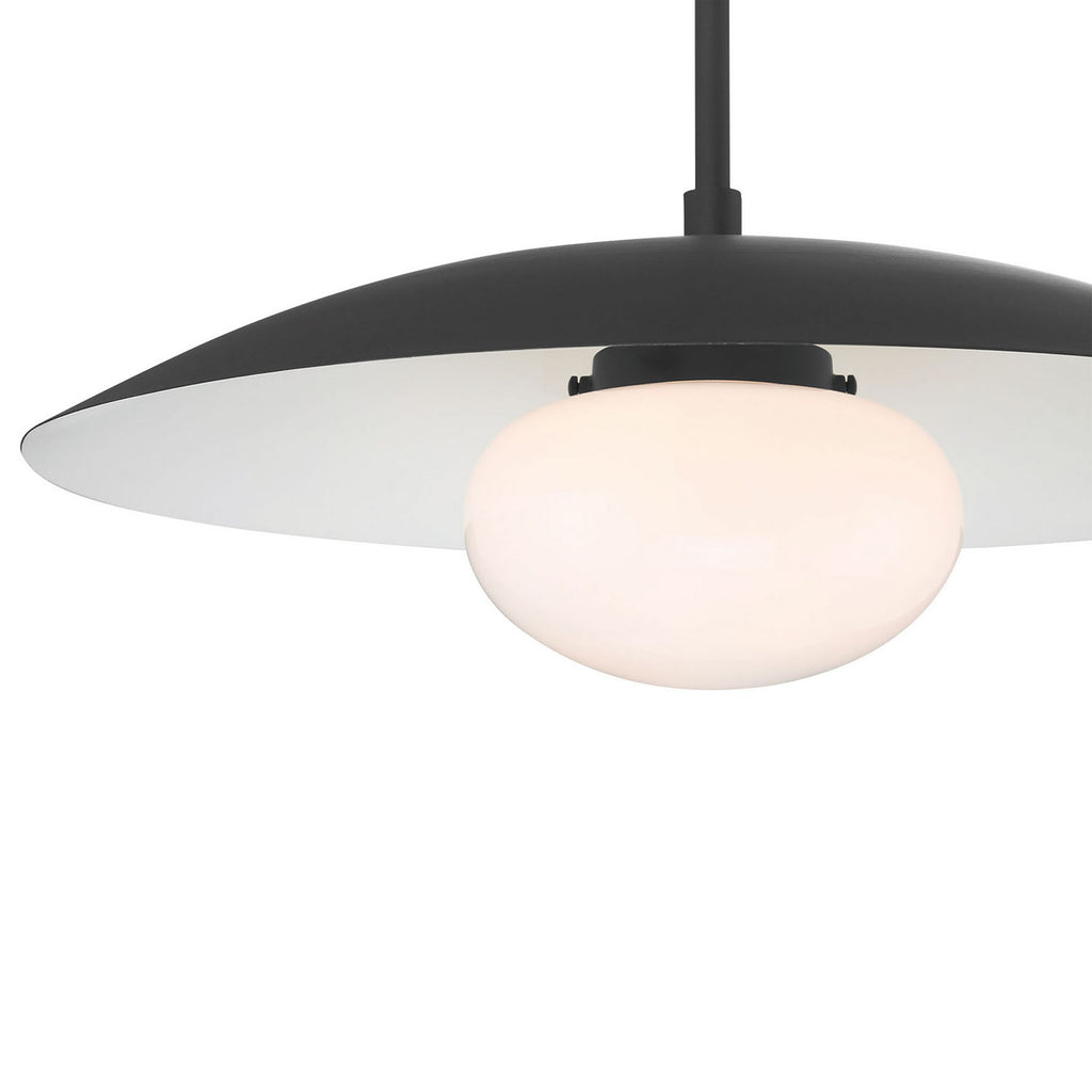 We love the Declan 18-inch Modern Disc Pendant as shown here in a striking matte black exterior with subtle white enamel interior. The addition of a frosted glass globe softly reflects light off of the inner dome. Maintain a clutter-free, modern aesthetic by replacing table lamps with a pair of suspended pendants. This frees up your side table or nightstand space while adding a unique visual element to your room.