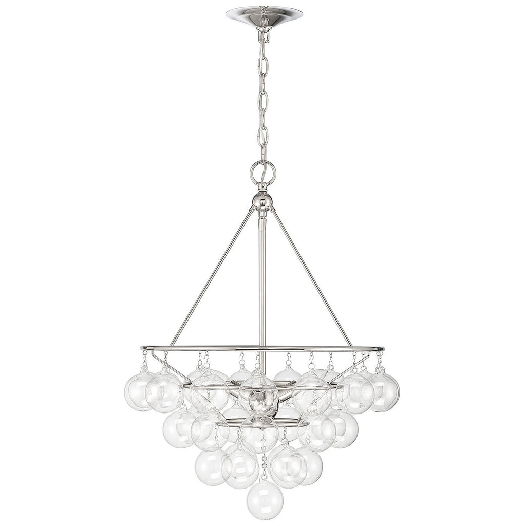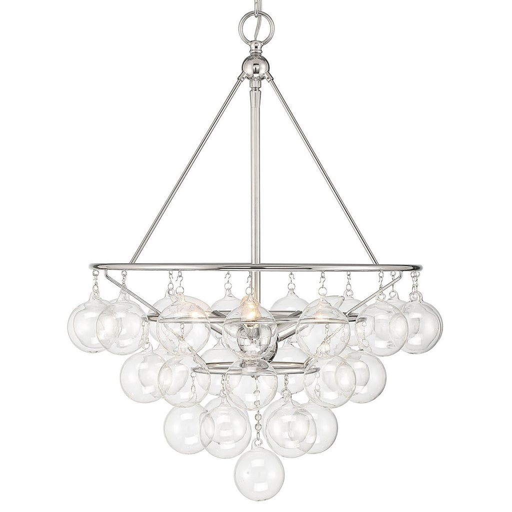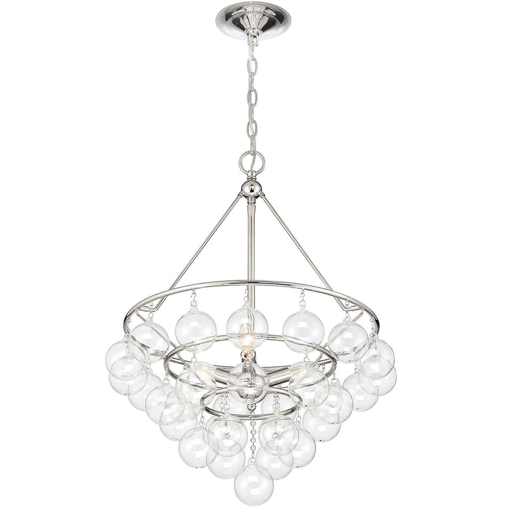 Thirty-one blown glass balls form a beautiful cloud of light on the contemporary Isla 3-Light Chandelier. Three tiers of shiny polished nickel-finished iron make up the frame, accented with fine metalwork details to amp up the luxe factor. At once elegant and ethereal, Isla may find itself at home in a sophisticated dining room, a stunning master bathroom, or over a table in a modern white kitchen. Includes a 6-foot chain and two replacement glass balls.