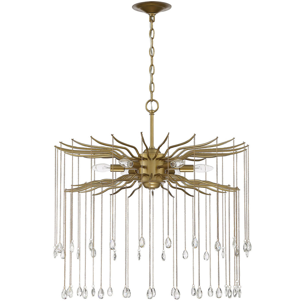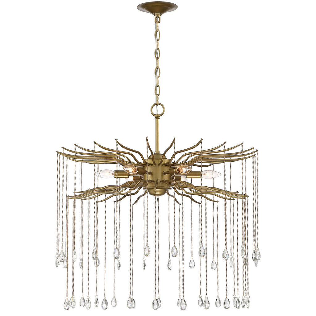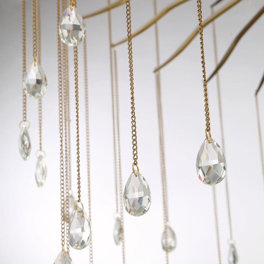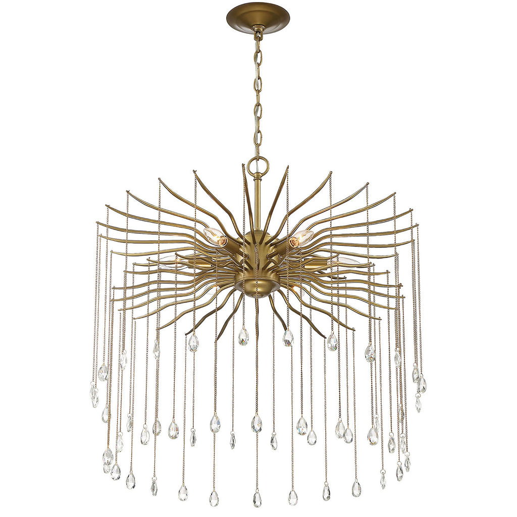 An airy waterfall of cut crystal charms imbues the Lark 6-Light ceiling light with a dramatic and whimsical aura. Two tiers of starburst arms surround the center body, made of iron with a hand-applied brass finish. The faceted crystals are hung from delicate brass chains at the end of each arm, creating a jewelry-like effect. The Lark offers a fresh contemporary take on formal design and, at 28 inches in diameter, is scaled to suit living room and dining room installations where an upscale elegance is called for.