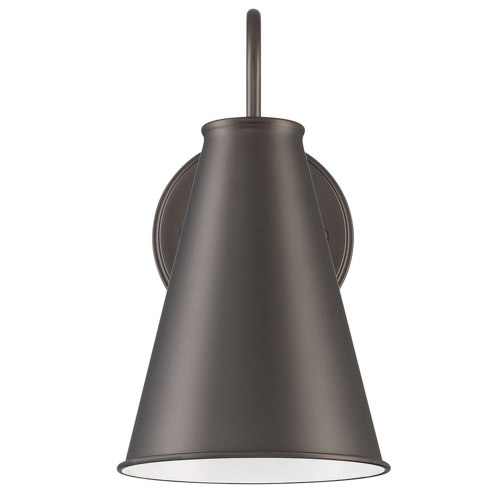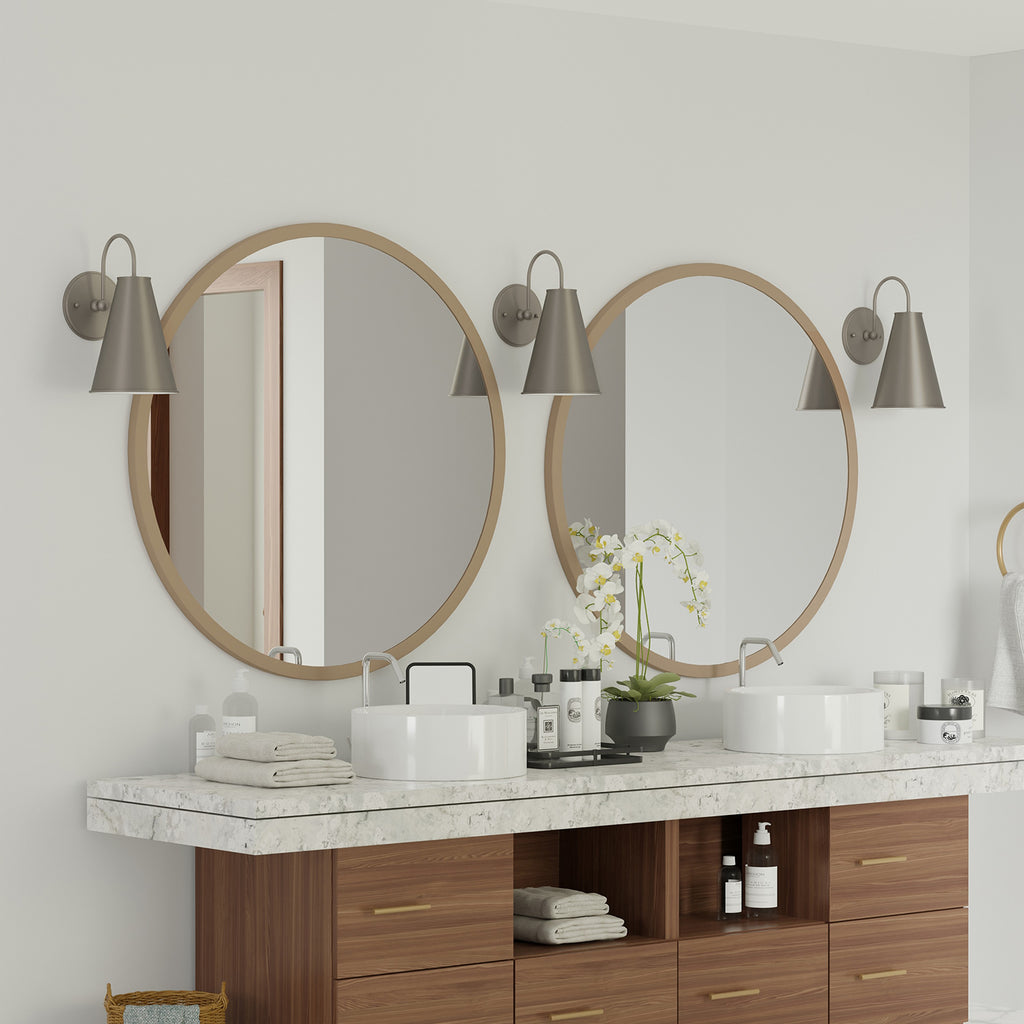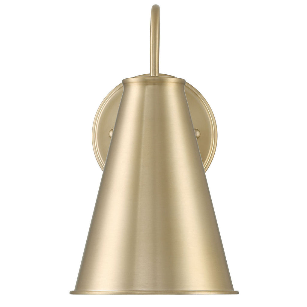 The Lincoln Tapered Metal 1-Light Sconce in plated Antique Brass is a delightful combination of lines and angles. The exaggerated curvature of the arm, elongated taper of the 9-inch high dome, and circular backplate meld classic and contemporary styling. Position a pair or trio of sconces over vanity mirrors or over a mudroom bench. A single sconce looks divine over a doorway.