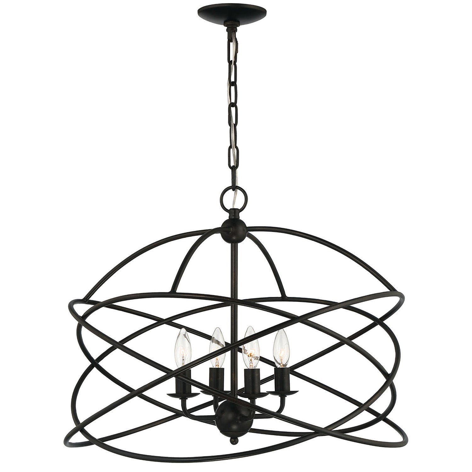 Swirling bands of iron in an oil-rubbed bronze finish surround the center of this four-light ceiling fixture. The Anson Chandelier slender bands convey an airy, geometric vibe. Use this dimmable chandelier to make a style statement in a modern farmhouse or industrial-style home, or in a dramatic contemporary space.