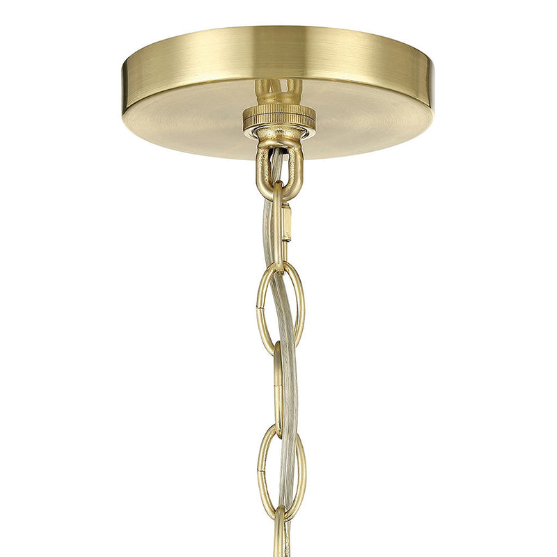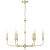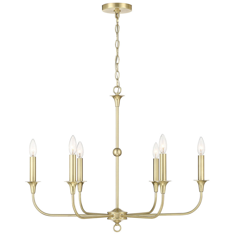 Timeless in style, the satin-brass Charlotte Chandelier is a study in classic design. Simple in form, but elegant in statement, this ceiling light measures 30 inches wide, so is large enough to use over most dining tables or in living rooms or foyers, but its slender arms keep it from dominating a space. Charlotte is dimmable and features six candle-style lights. Includes 6-foot chain to adjust height.