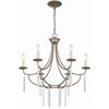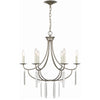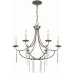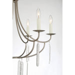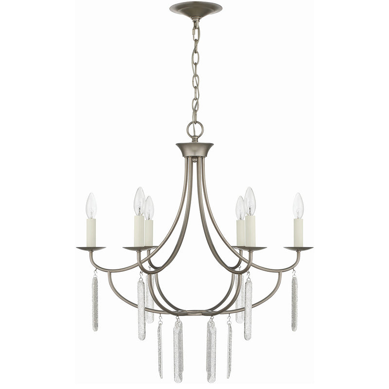 A study in feminine refinement, this classically inspired ceiling fixture is finished in hand-painted silver and completed with oblong crystal droplets. These crystals add elegance, but the modern shape keep them from being too traditional. The elegant Arwen Chandelier would be lovely in a dining room or foyer, and at 26 inches in diameter, has the scale to make a beautiful statement. The six lights are dimmable for added versatility. Includes a 6-foot chain to adjust height and an extra crystal drop.
