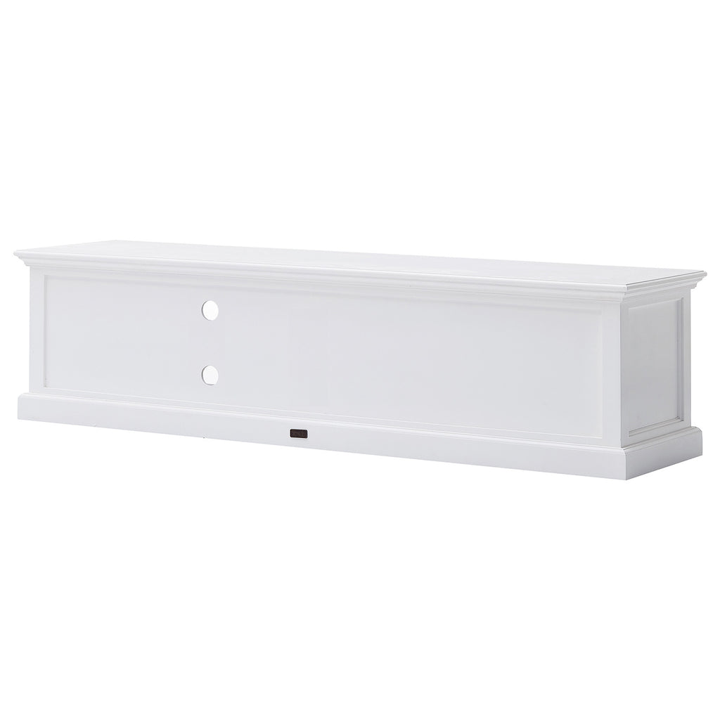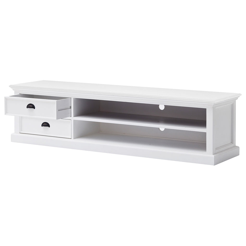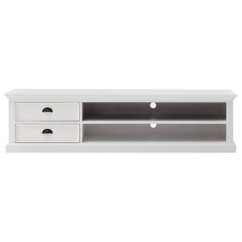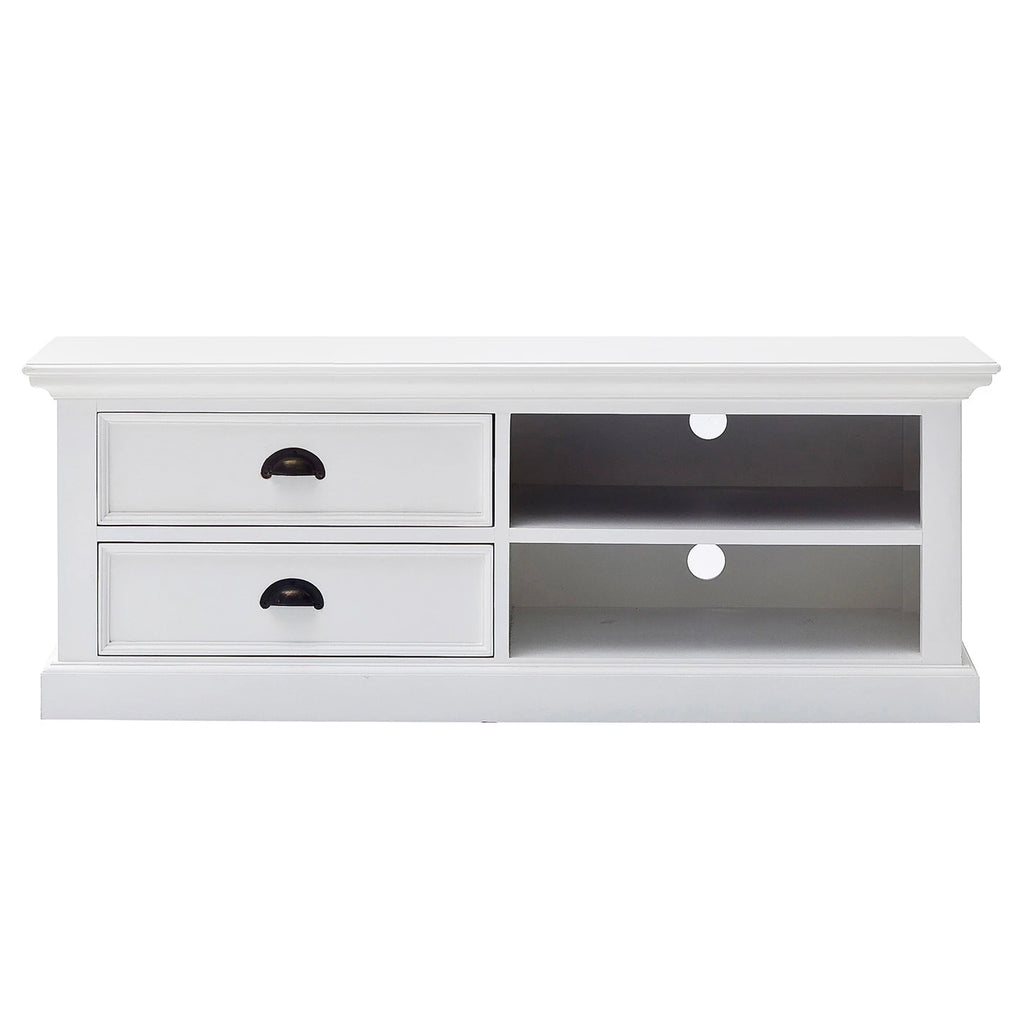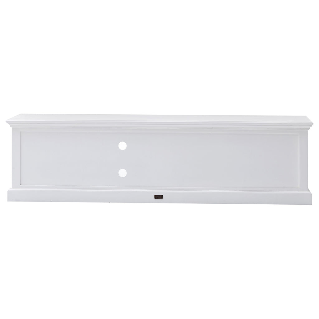 Beckton combines the quaint charm of the French Countryside with the coastal flair of the Eastern Seaboard to form a comprehensive range befitting the dining area, living space or bedroom. Detailed profiling on each piece, together with the warm finishing and antique brass hardware, provides a classic collection for the contemporary home. The low profile of this entertainment center offers the perfect platform for showcasing all your media components. Television viewing is at the perfect height and shelving provides ample allowance for additional electronic devices. Cord cutouts are in place for ease of connectability. Drawers can house smaller accessories and instruction manuals. The solid wood construction with detailed molding, is highlighted with a semigloss painted finish. Flared crown molding and detailed trim add simple elegance to the piece. Antique brass hardware completes the look.
