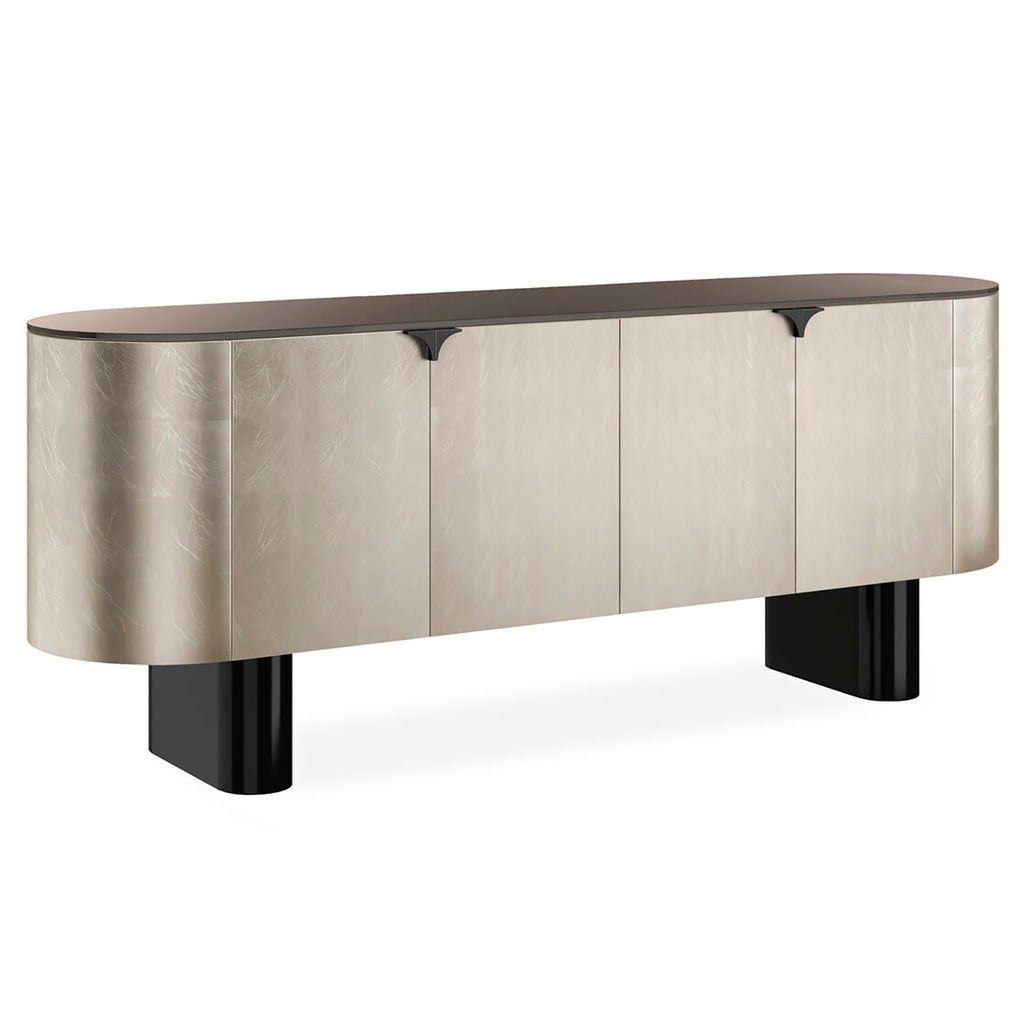 If you are looking for a slim media console with dramatic appeal, meet Gustav. The elongated oval chest sits atop Deep Bronze elongated cylindrical legs. Finished in Charcoal Leaf, four doors with triangular Deep Bronze pulls open to an Almost Black interior with four adjustable shelves and wire management access. The piece’s top is Smoked Bronze glass