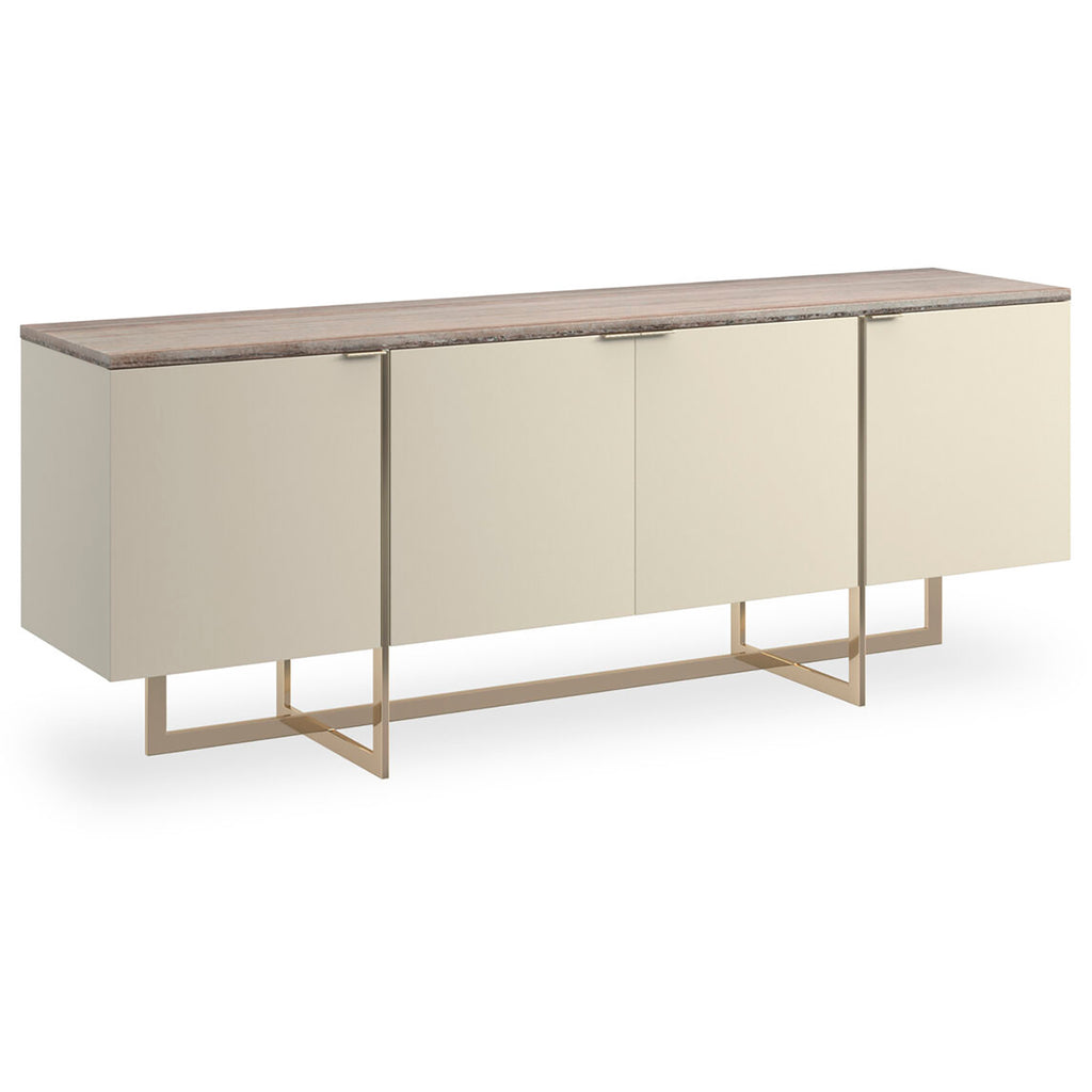 Stone, mirror-polished metal and hardwoods crisscross in this sleek media cabinet with linear appeal. Flowing Sandstone graces the 84” top of the Pearl-painted cabinet and four doors. The paint gives off just enough luster to make the piece intriguing. The doors have slim Whisper of Gold pulls. Adjustable shelving and wire access graces the inside of the cabinet. The base is the real stunner of the piece with thin intersecting bars in mirror-polished Whisper of gold that overlap each other and extend up the cabinet to add interest.