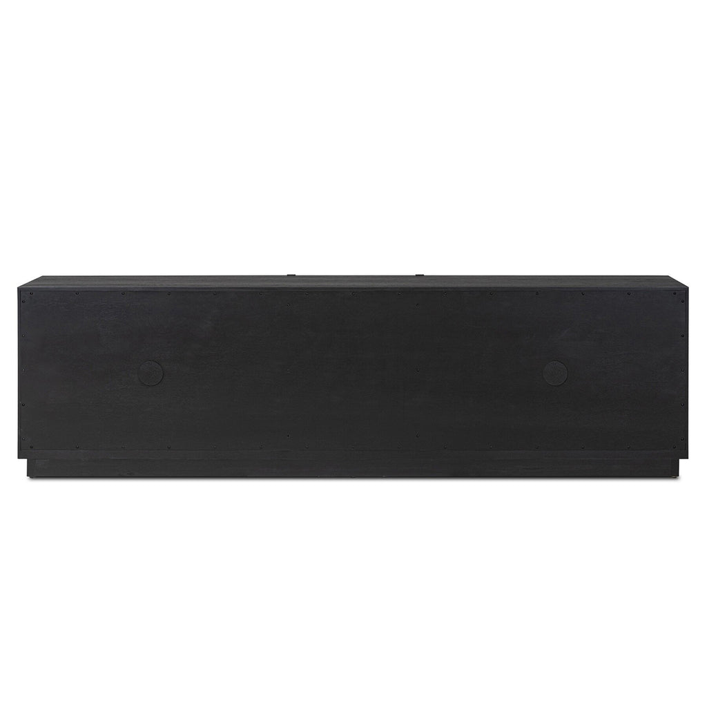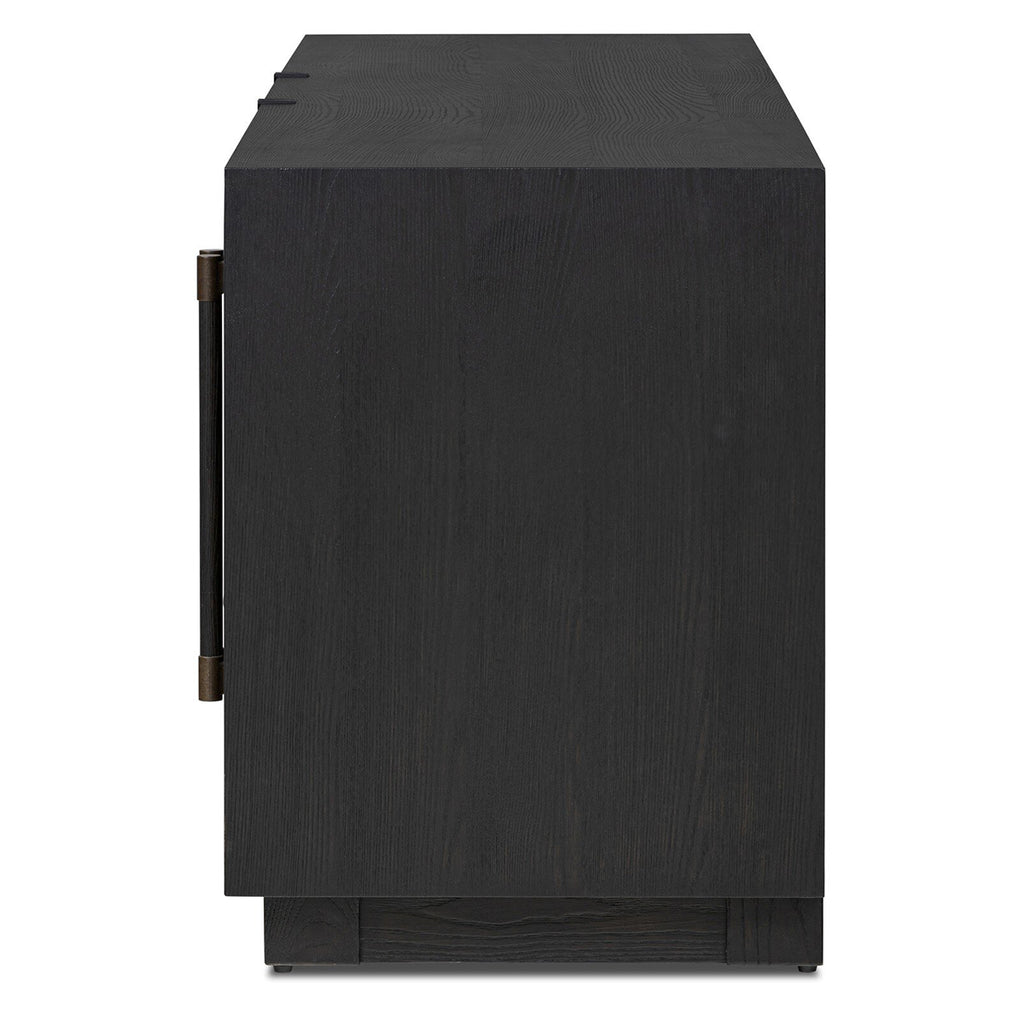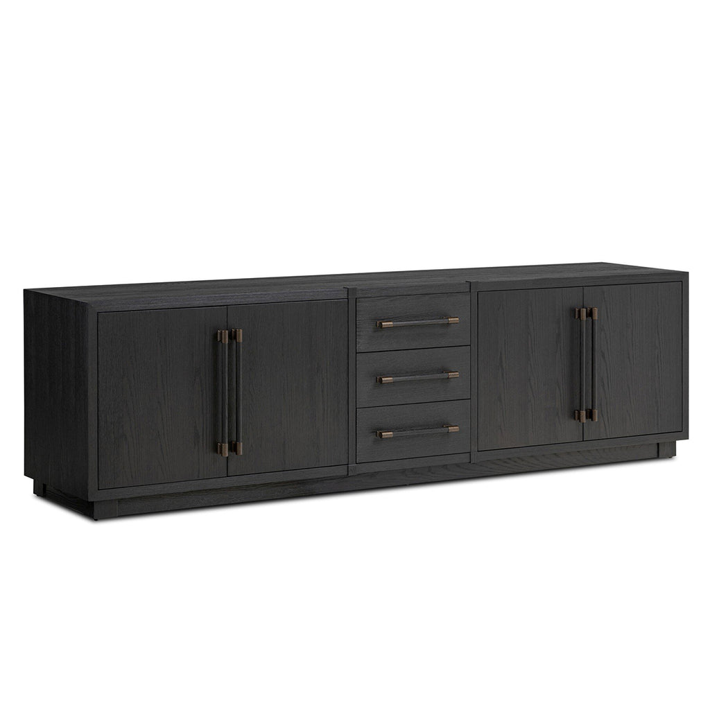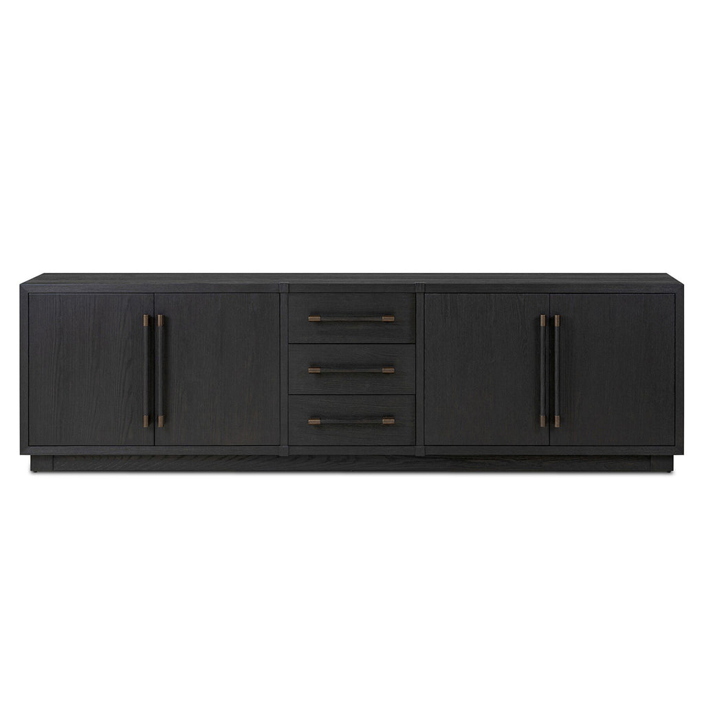 Beautifully minimalist. A storage-driven media console made from black-finished ash features long, linear bronzed hardware for a smooth, clean look. Side cabinetry on both sides plus center drawers offer generous space for media storage and more. Rear cutouts for cord management.