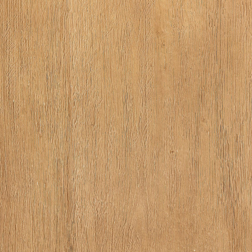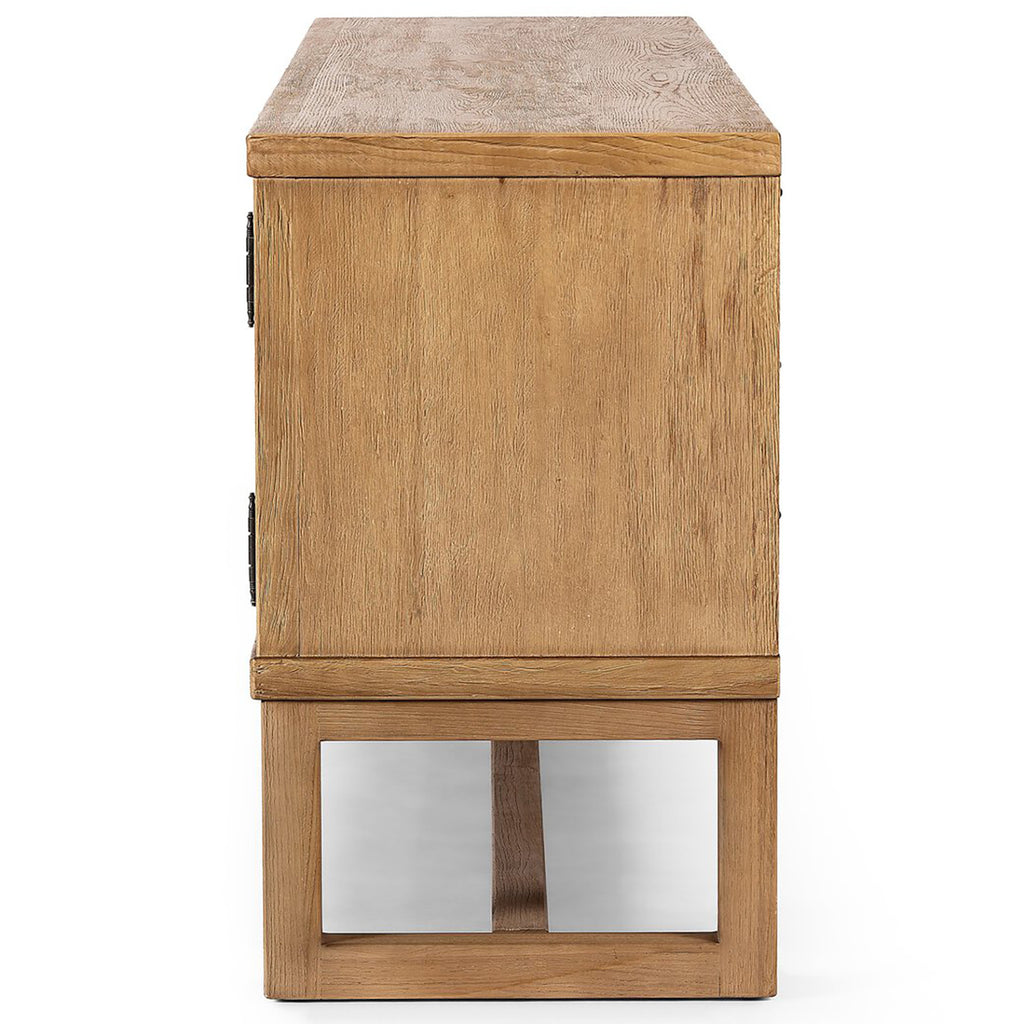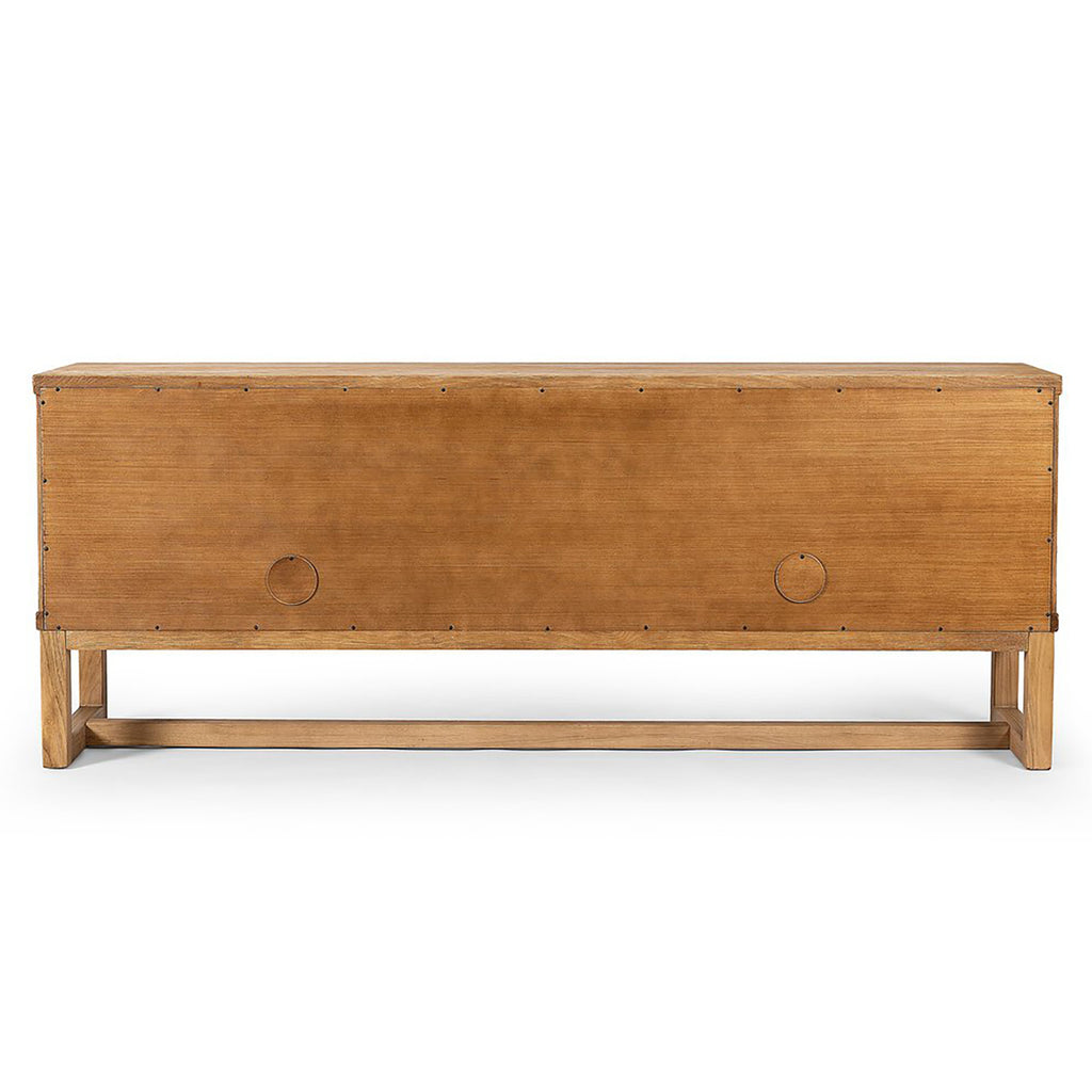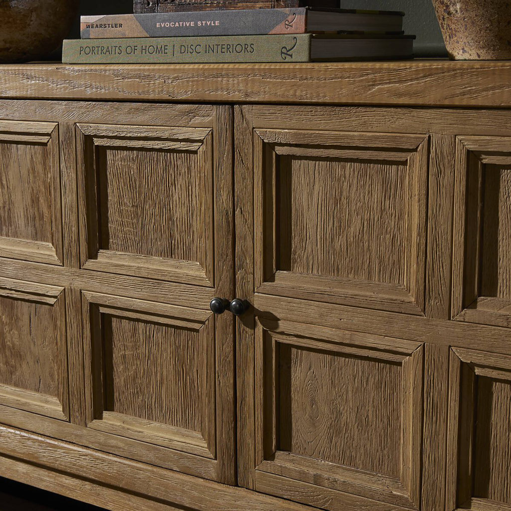 A spacious console of worn oak features paneled doors, lending texture to a clean-lined design.