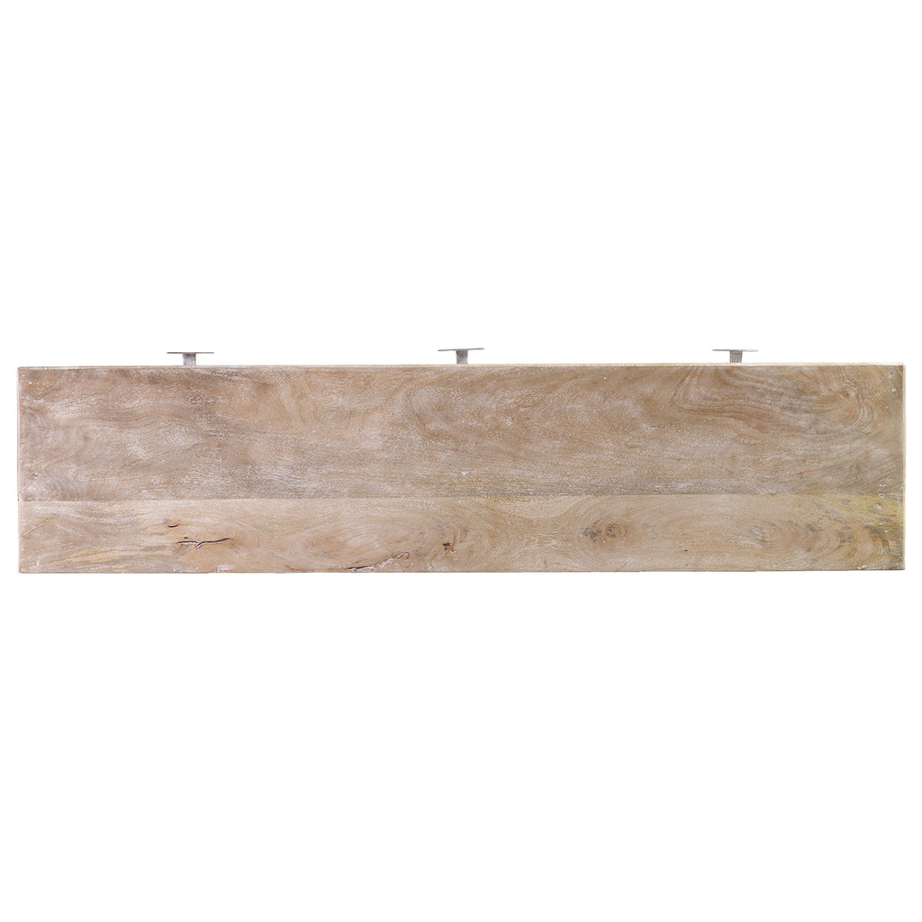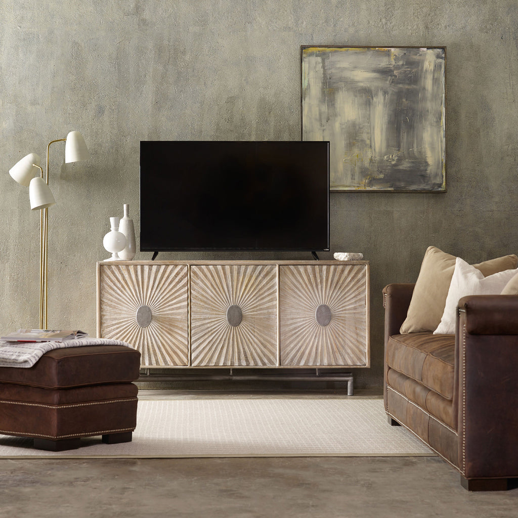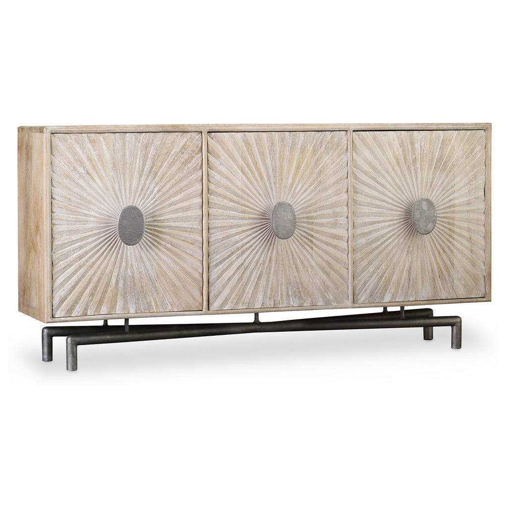With the dazzling look of sunbursts in natural stone, this stylish console exudes modern elegance and is TV-ready. The piece is crafted of Mango Solids with a neutral-colored, sandblasted whitewash finish and an interlocking iron base.