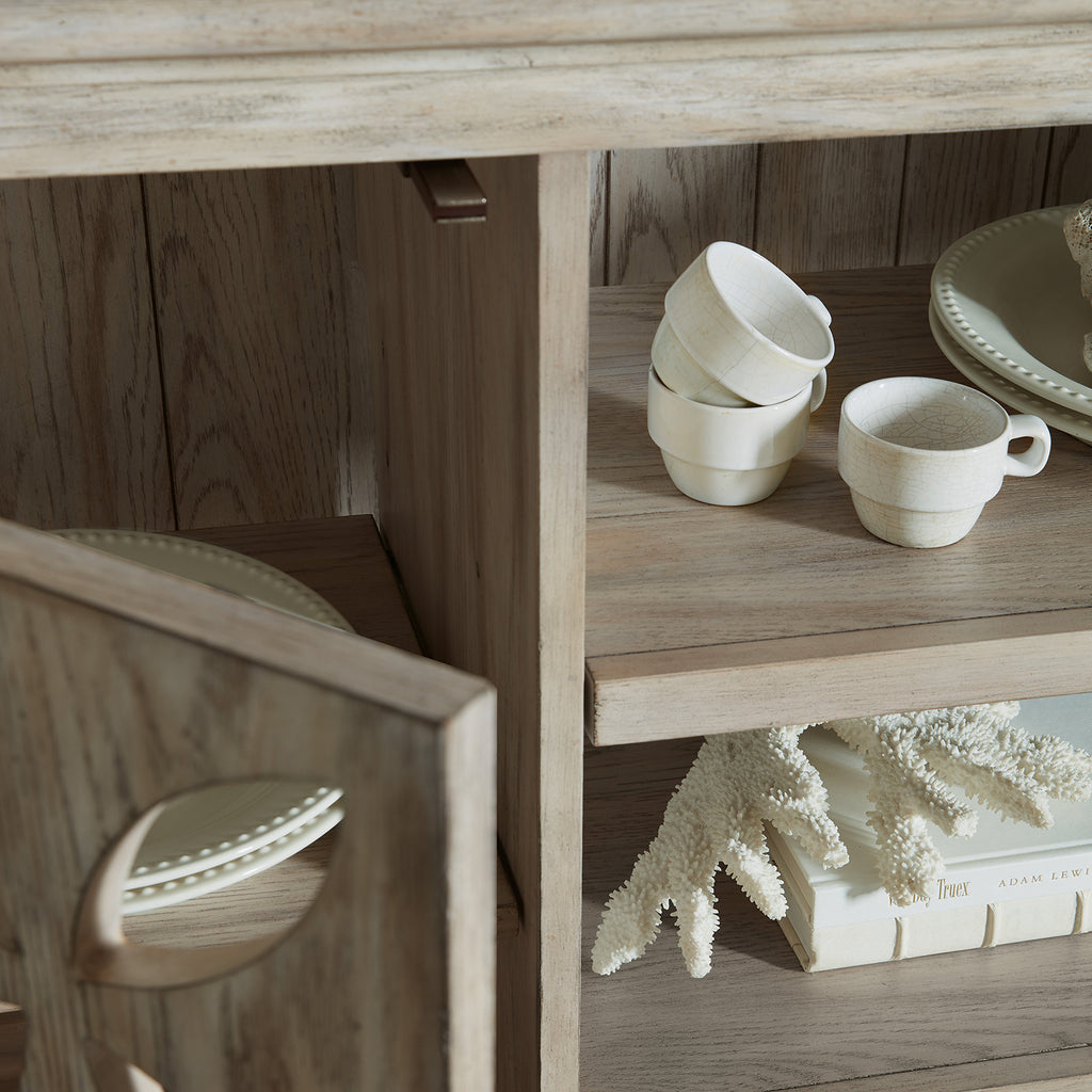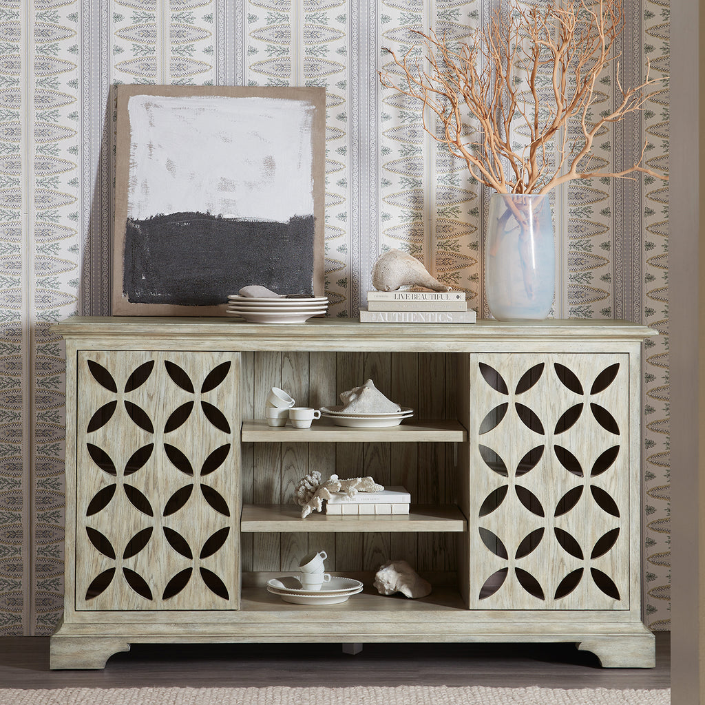 A whimsical floral cutout motif on each of the doors gives a charming cottage farmhouse appeal to the Underhill Entertainment Center. The Oak Veneers are finished in a light gray color with distressing and a planked design on the back panel. The two doors have soft-close hinges and magnetic catches, and there’s one adjustable shelf each door. The open middle section has two adjustable shelves. The interior finish matches the exterior finish.