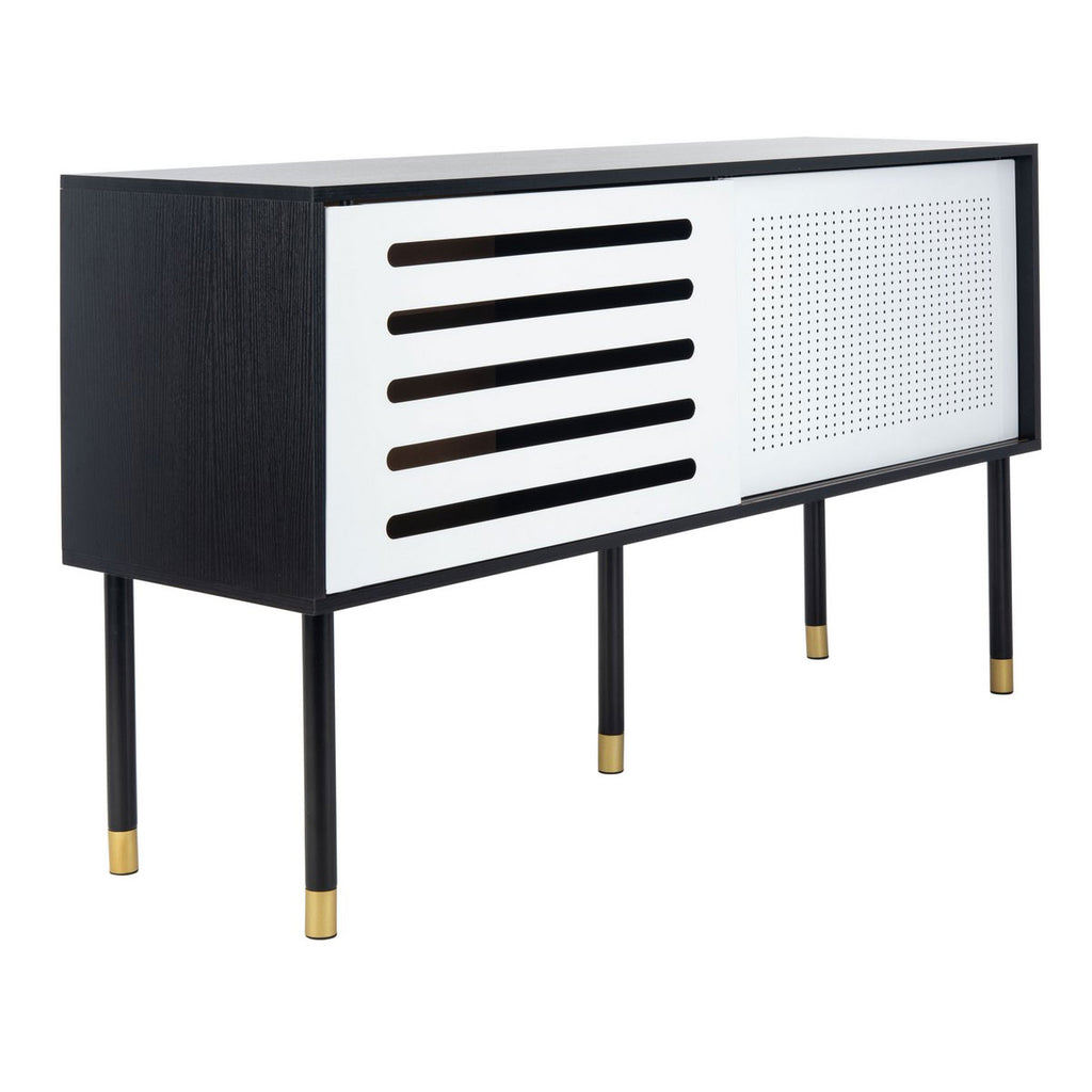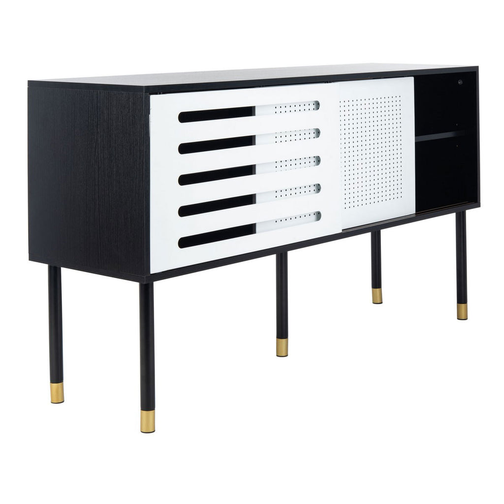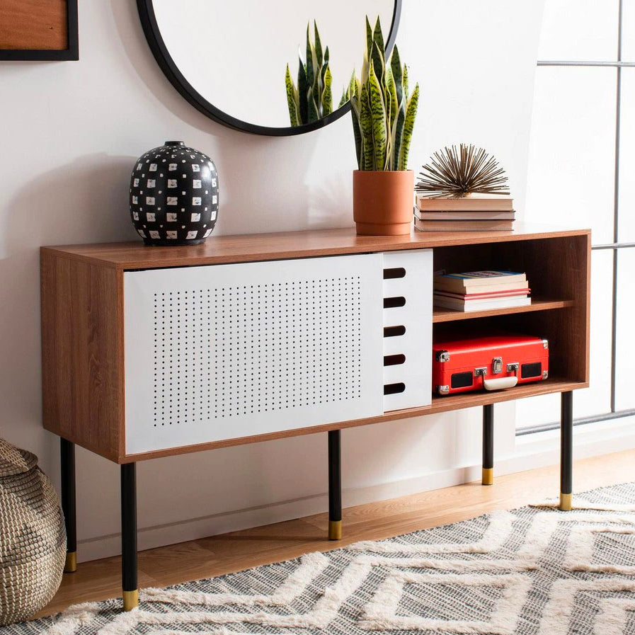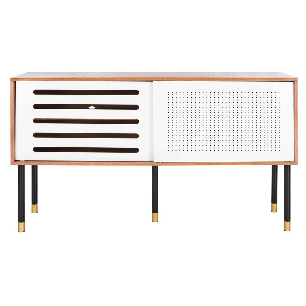 Bring the character and warmth of retro style to any living room with this mod TV stand. Finely crafted with luxurious details, the beauty of its natural and white wood design and vintage-inspired black metal gold capped legs make it a designer must-have.