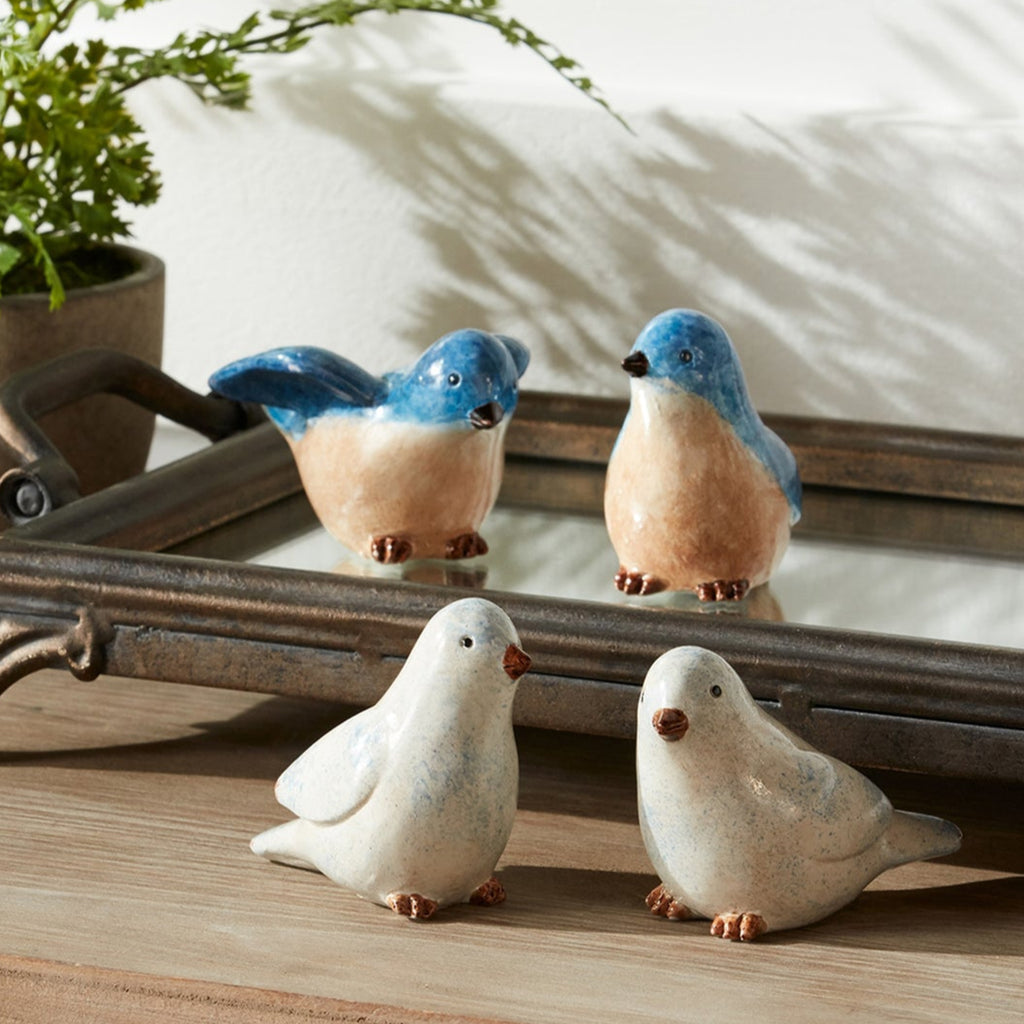 Add a touch of nature to your home with this beautiful set of Bird Figurines. Featuring four assorted designs, this set is the perfect addition to your spring home decor. The glazed finish paired with the quality polyresin and lime powder composition is the perfect combination to create a beautiful spring display. Arrange the pieces sporadically around your home to accent other spring decor, or display them altogether in a centerpiece or table display to make a statement.