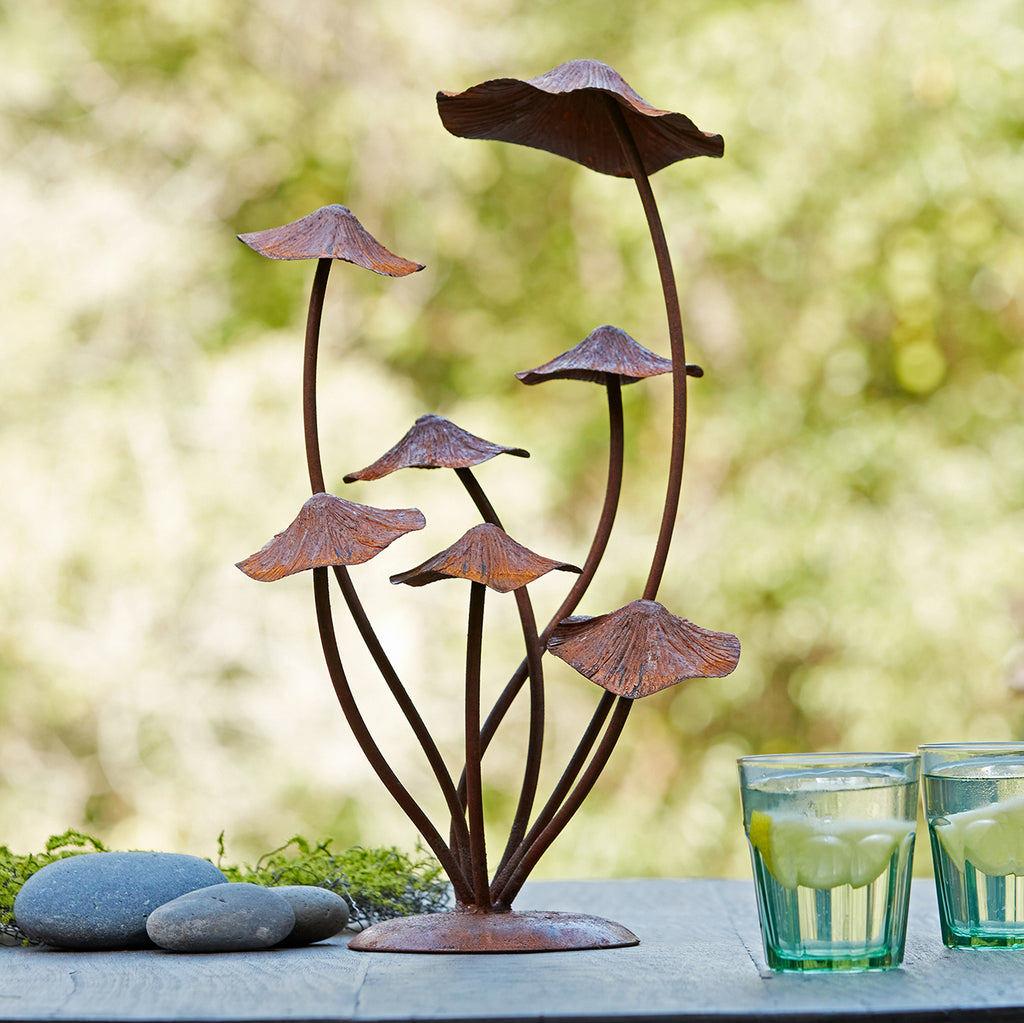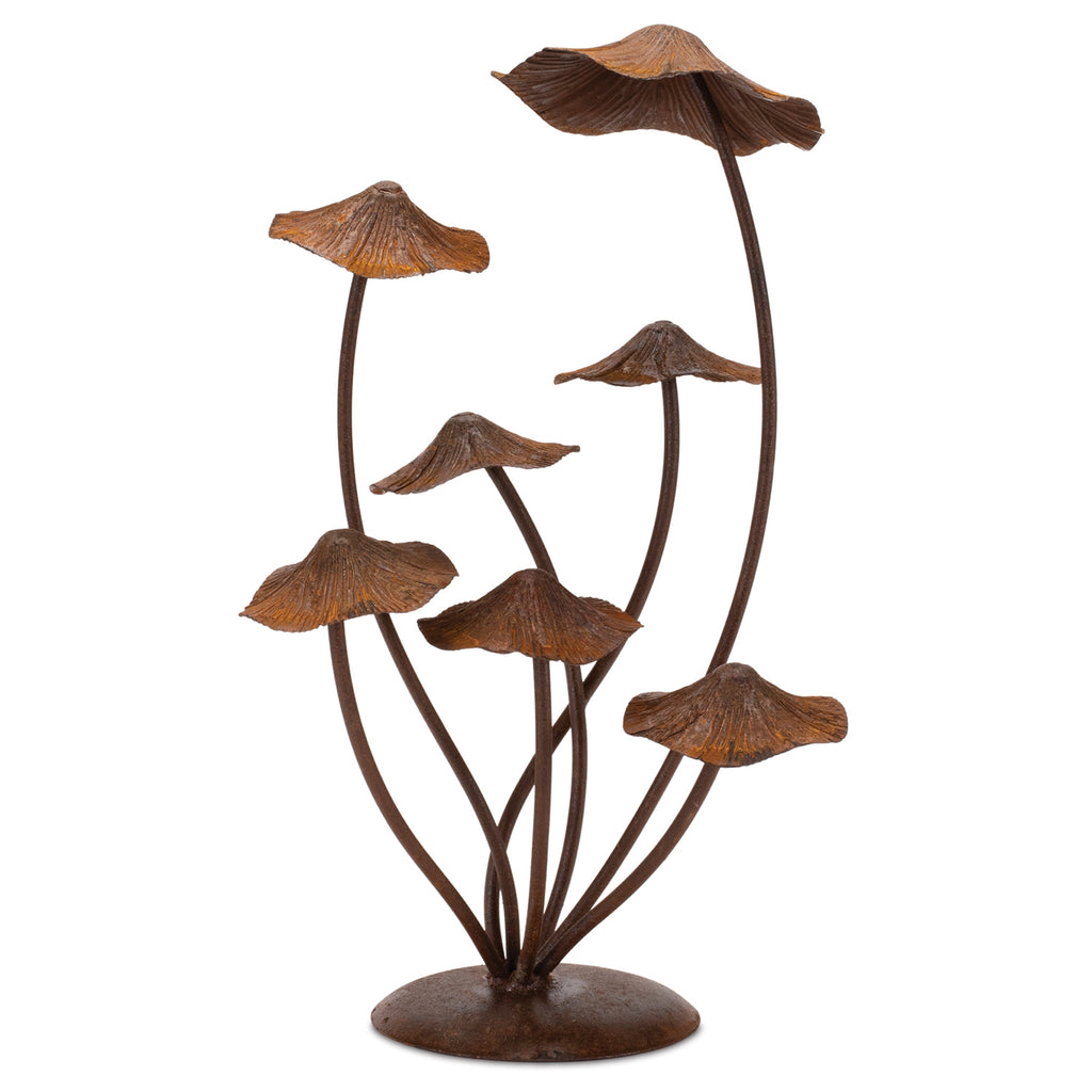 Enhance your garden and lawn decor with this whimsical Metal Mushroom Garden Accents. Measuring 17" tall, this piece is sure to bring an elegant touch of nature to your outdoor decor. The distressed bronze finish paired with the clustered mushroom design and quality iron metal composition is sure to create a stunning display. Display this piece on your porch or patio, or arrange them among your garden flowers to share the beauty with all who visit!
