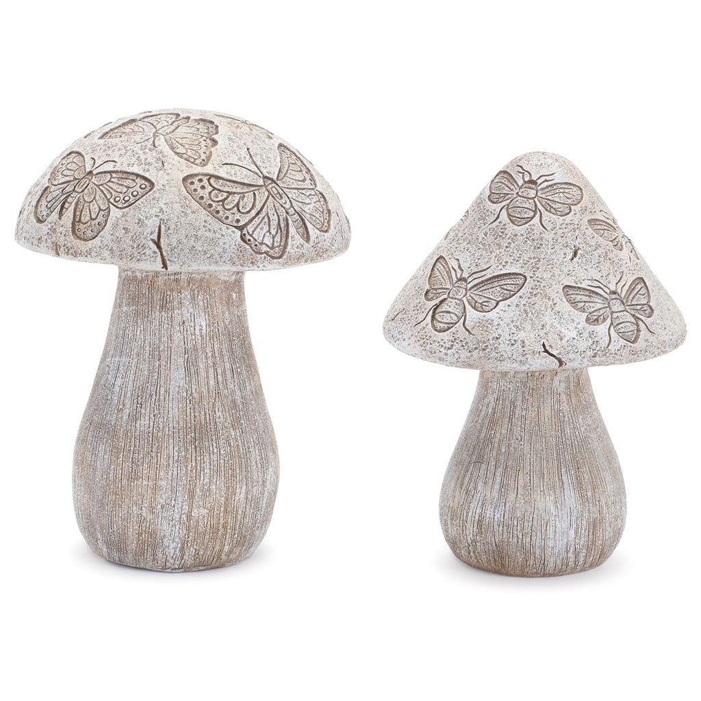 Add a whimsical touch of nature to your home this spring season with a beautiful set of Insect Mushrooms. Featuring two assorted designs, this set is a great fit for your country cottage style of decor. The cool beige and grey tones paired with the etched butterfly and bumble bee mushroom tops and the wood grain stems are perfect to create a memorable display. The quality polyresin composition is sure to endure for seasons to come. Display the pieces on a covered porch or patio, or arrange them alongside your indoor floral arrangements to make a statement in your home!