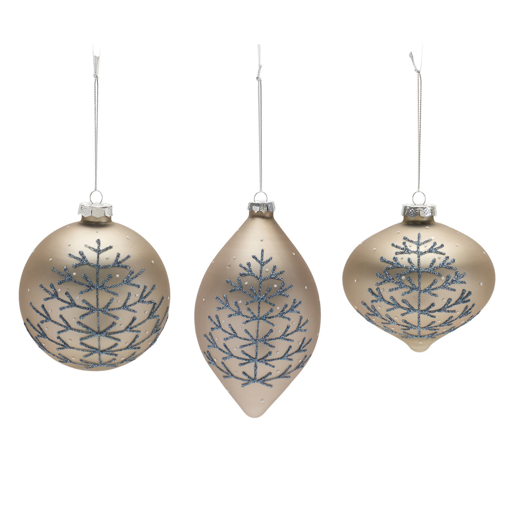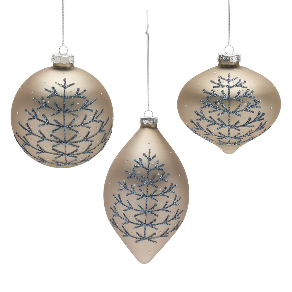 Adorn your Christmas tree and holiday decor with this stunning set of Champagne Glittered Ball Ornaments. Featuring 6 pieces, the wintry chic silver and wintry blue tones paired with the glittered design is the perfect combination to create a memorable display. The quality glass composition and delicate silver string hanging accent is sure to endure for seasons to come. Whether you're adding a touch of cheer to your home or gifting to a loved one, these ornaments will definitely bring smiles.
