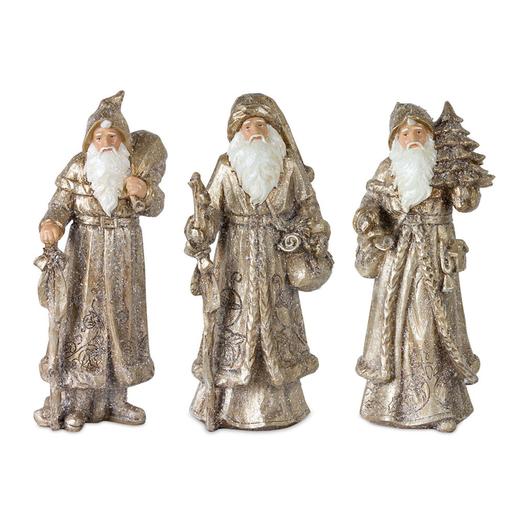 Ring in the holiday season with this chic set of Santa Figurines. Featuring three assorted designs, the set includes santas holding a pine tree, walking stick, and toy bag. The traditional santa design paired with the metallic gold painted finish is the perfect combination to create a timeless Christmas piece. The quality polyresin and stone powder composition is sure to last for seasons to come. Display the pieces together to make a statement, or display along with other decor to spread the holiday cheer.