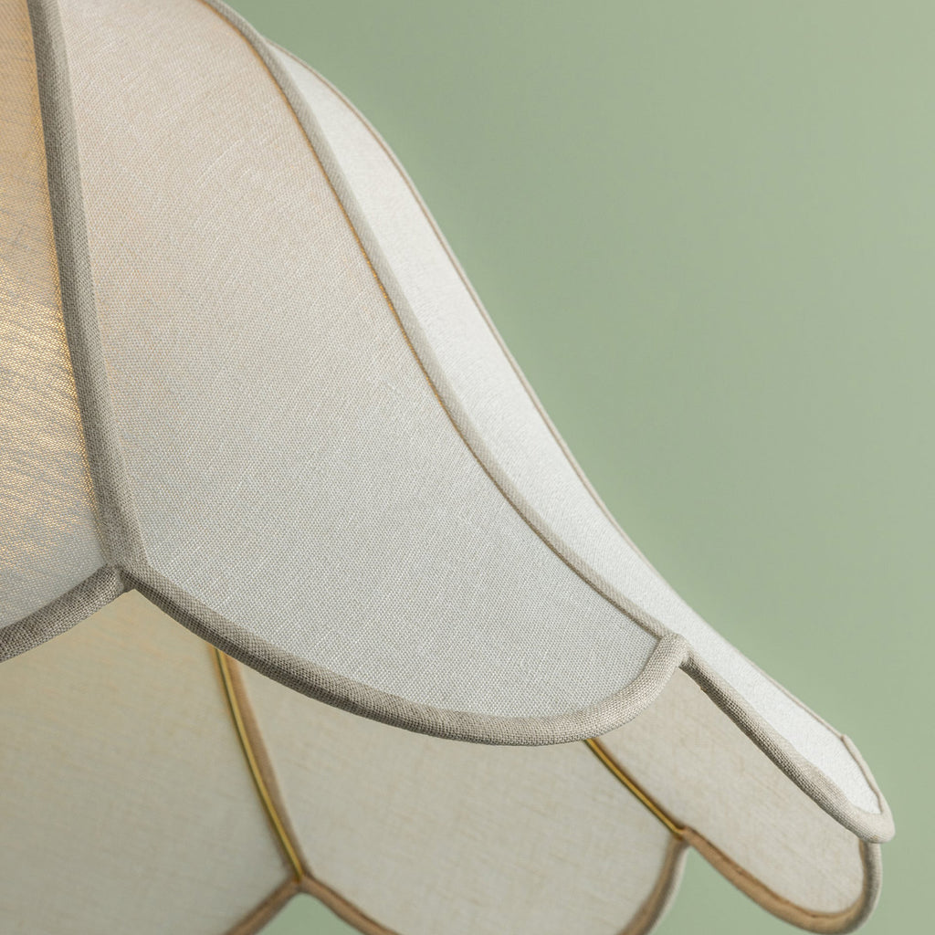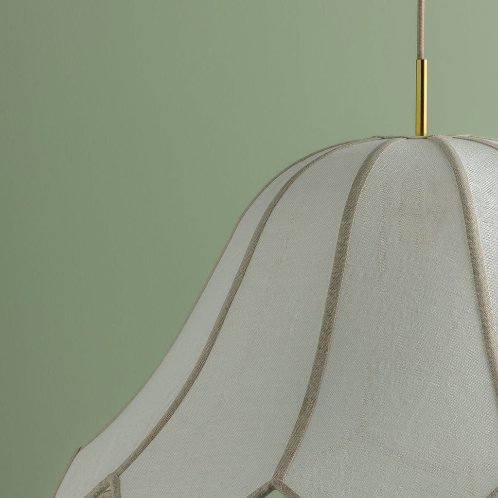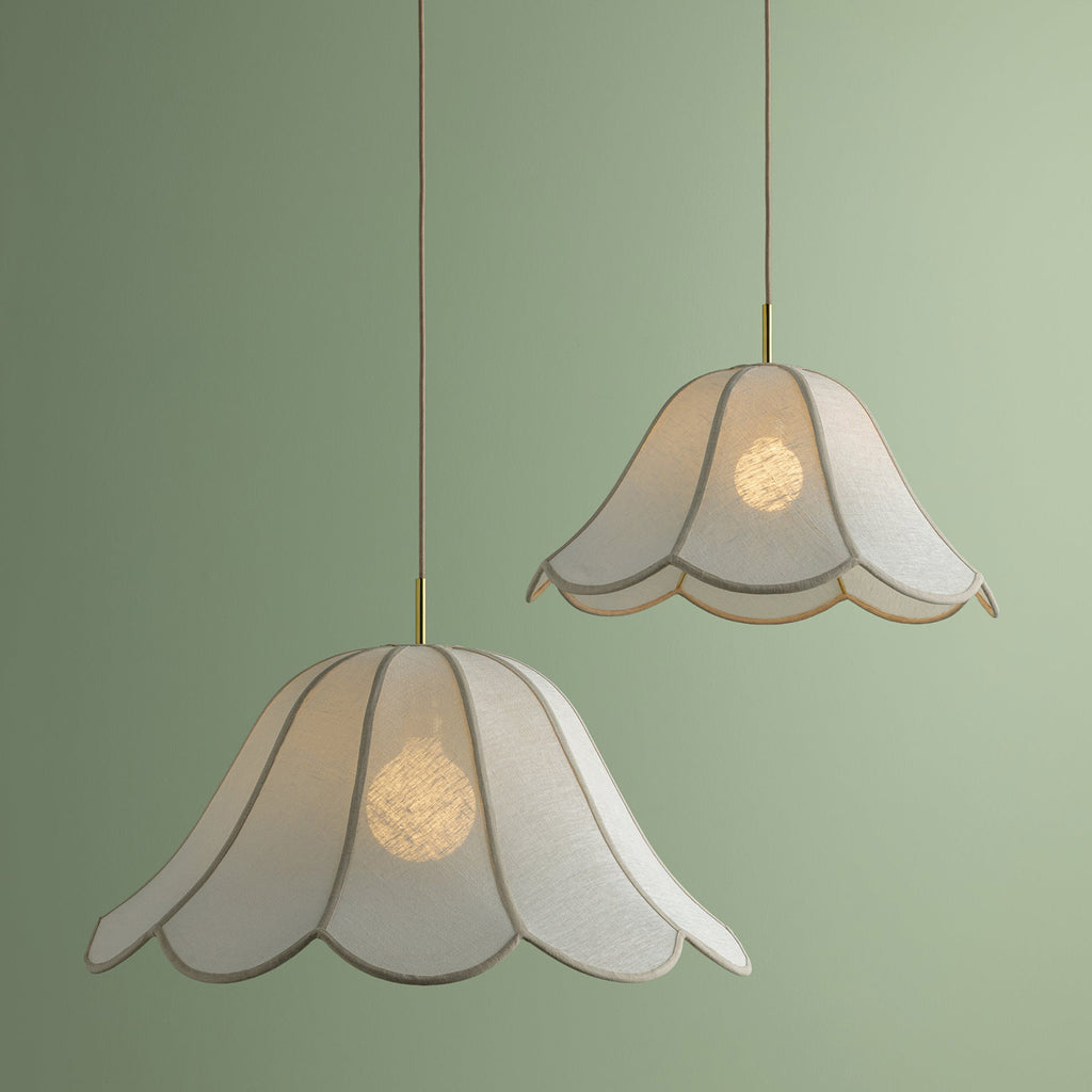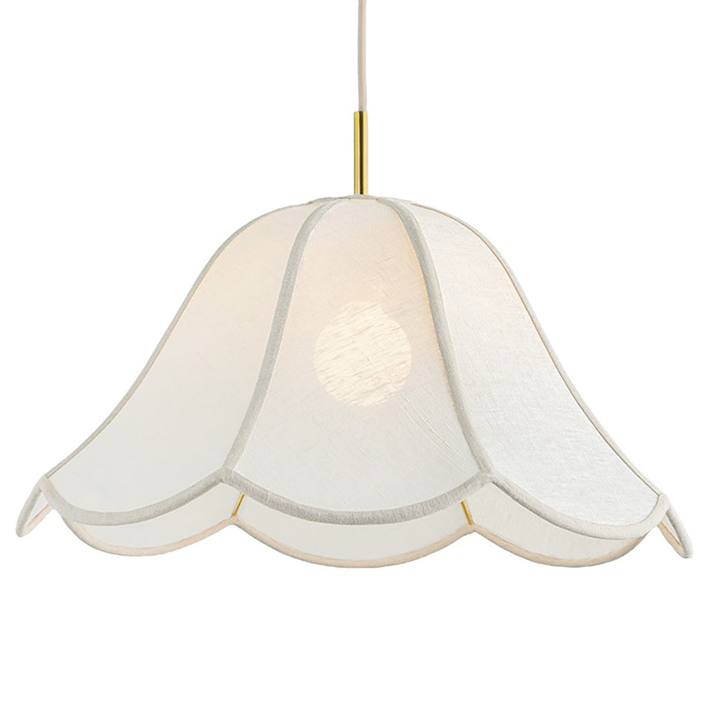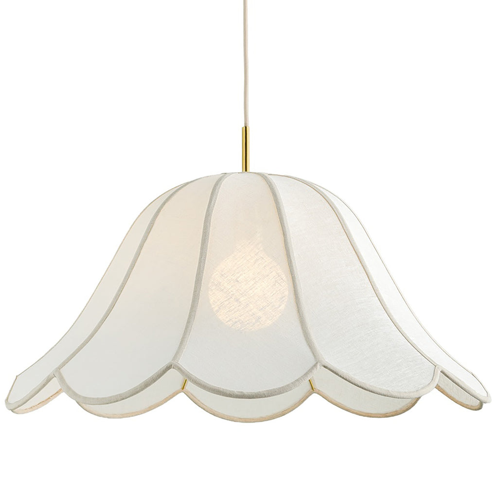 Softly floral, the Mitzi Dara pendant floats overhead with its pillowy, scalloped silhouette. The voluminous inverted edges that make up the ‘petals’ spread light dynamically around the piece. Natural trim, shade tape, and cord wrap add tonal interest and texture to the crisp white linen. An Aged Brass accent adds a luxurious finishing touch to the romantic form. Available in two sizes.