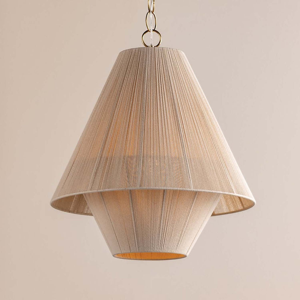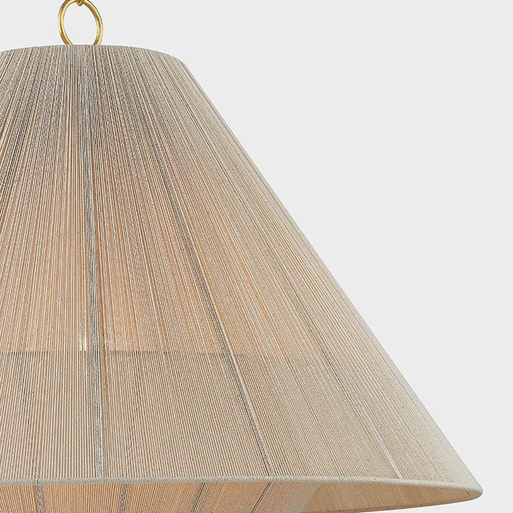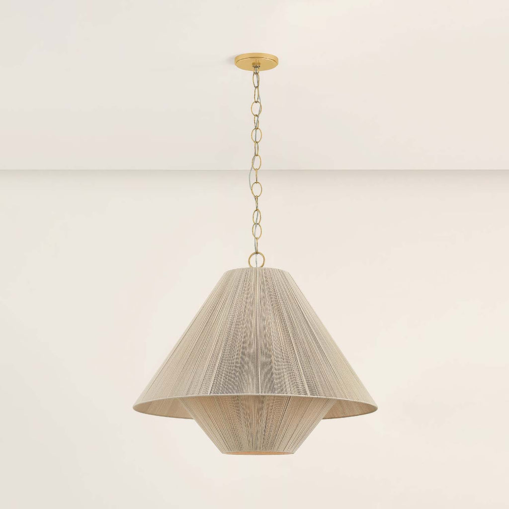 To create the casual elegance of the Mitzi Eleanor pendant, two light and airy string shades are nested around a central light source. The overlapping of the conical shades creates a subtle moire effect, adding depth to the dynamic silhouette. Suspended by a simple, yet refined Aged Brass chain, Eleanor is perfect over a dining table or in a bedroom.