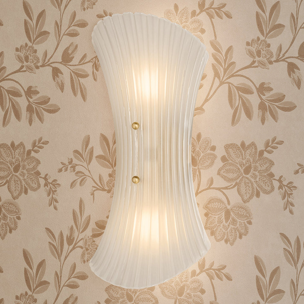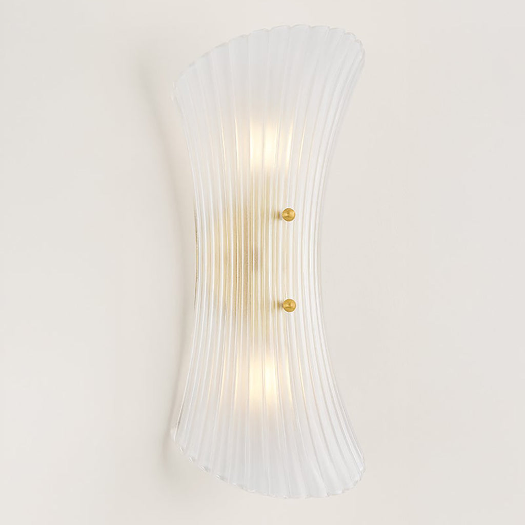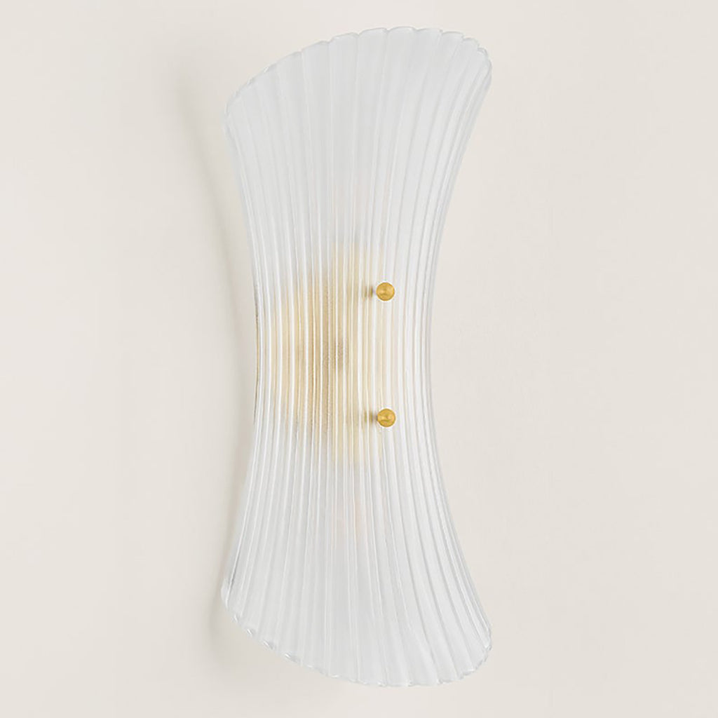 In the vein of mid-century Murano sconces, Mitzi Esmae’s shell-shaped silhouette is a thing of beauty. The etched clear glass shade features fine-resolution ribbing that runs parallel to the form, curving inwards at the center. Two small spherical thumbscrews provide a glimpse of the Aged Brass hardware while keeping the focus on the translucent glass.