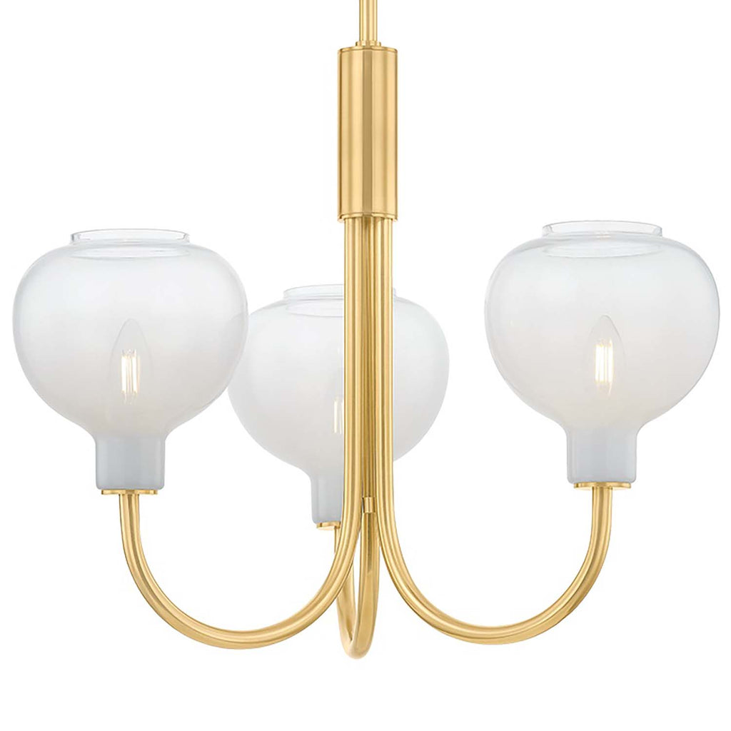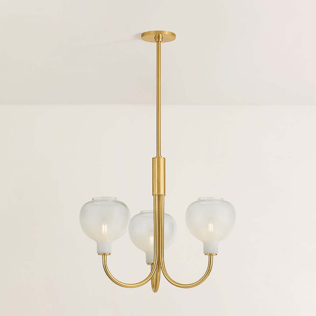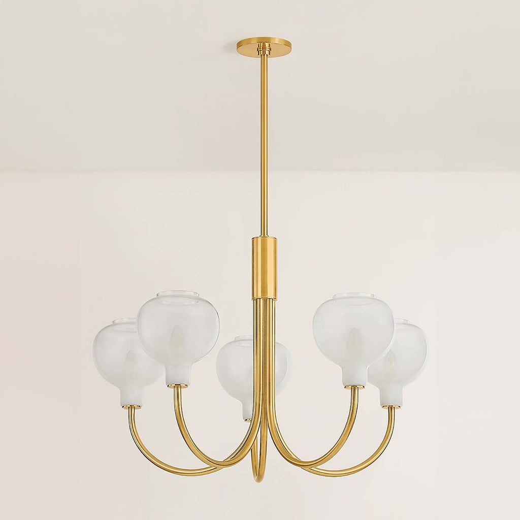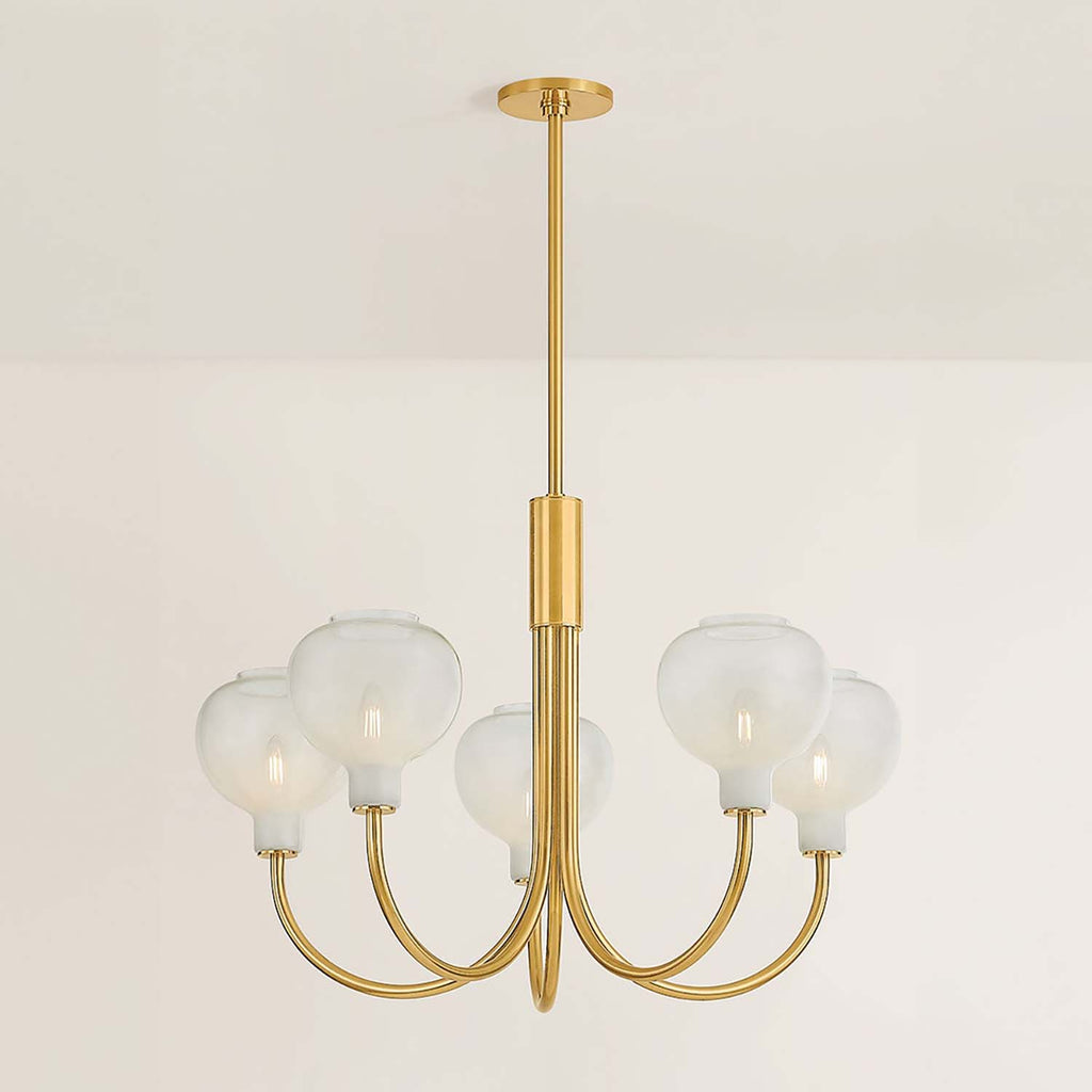 At the intersection of transitional and modern design, the Mitzi Estelle family features relatable silhouettes with striking glasswork. The elongated J-arms arc upwards to support naturally rounded glass shades. Combining the cloudy Sfumato glass with classic Aged Brass metalwork results in a warm, inviting lighting experience. Available as a 1-light sconce and a 3 or 5-light chandelier, Estelle lends a sense of soft elegance to any space.