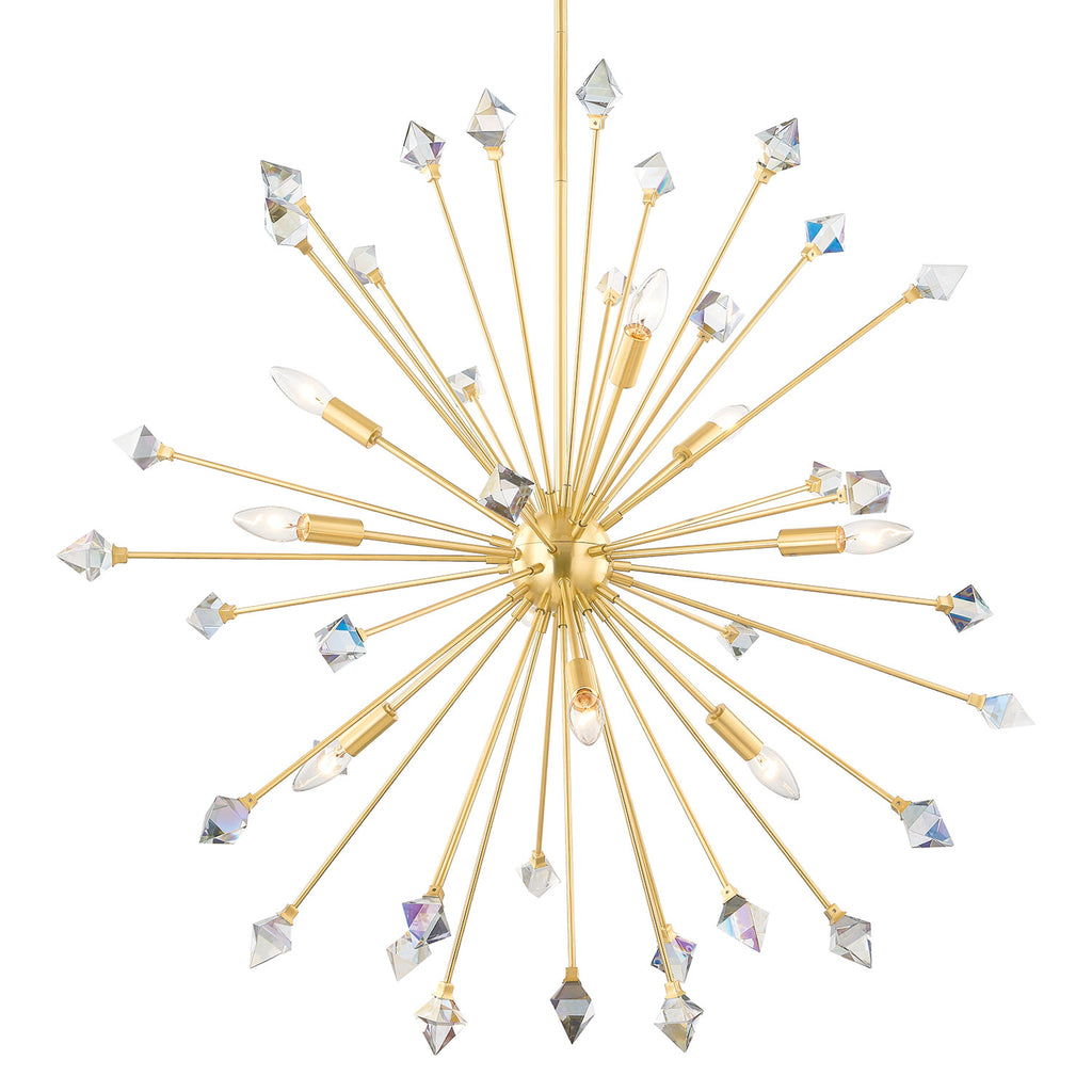 High-quality and exceedingly creative, Mitzi delivers a semi-nostalgic classic lighting collection with streamlined contemporary elements that instantly upgrade your space. A Mid-century marvel, the sputnik style has captivated design fiends for decades. Genesis reimagines this icon, bringing celestial glamour in starburst form. Dancing between each light source are iridescent crystals, creating prisms of light throughout the room. Finished in aged brass, the Mitzi Genesis Wall Sconce, Flush Mount, and Chandelier is the statement-making piece you need.