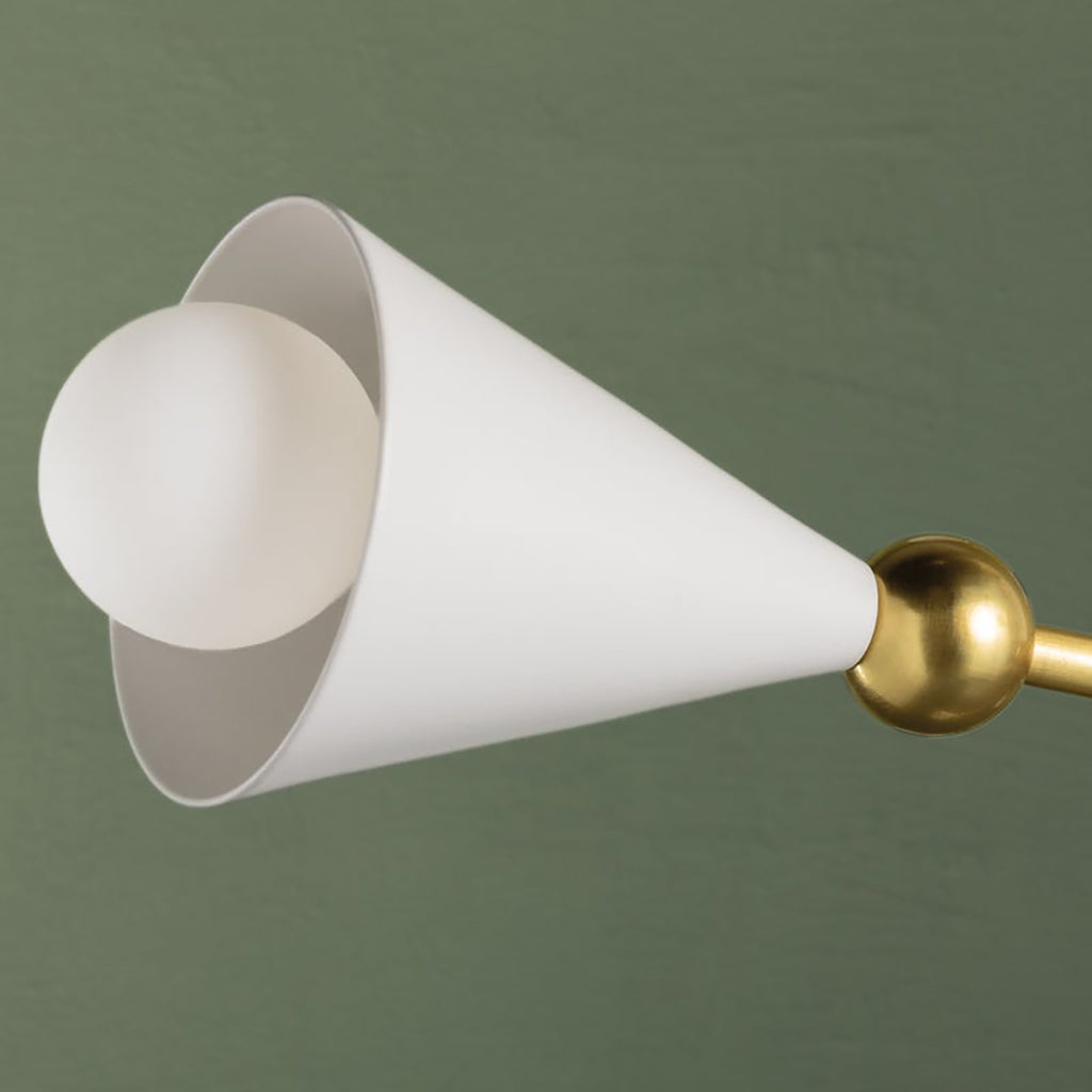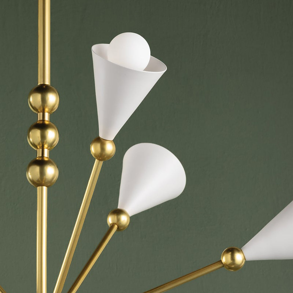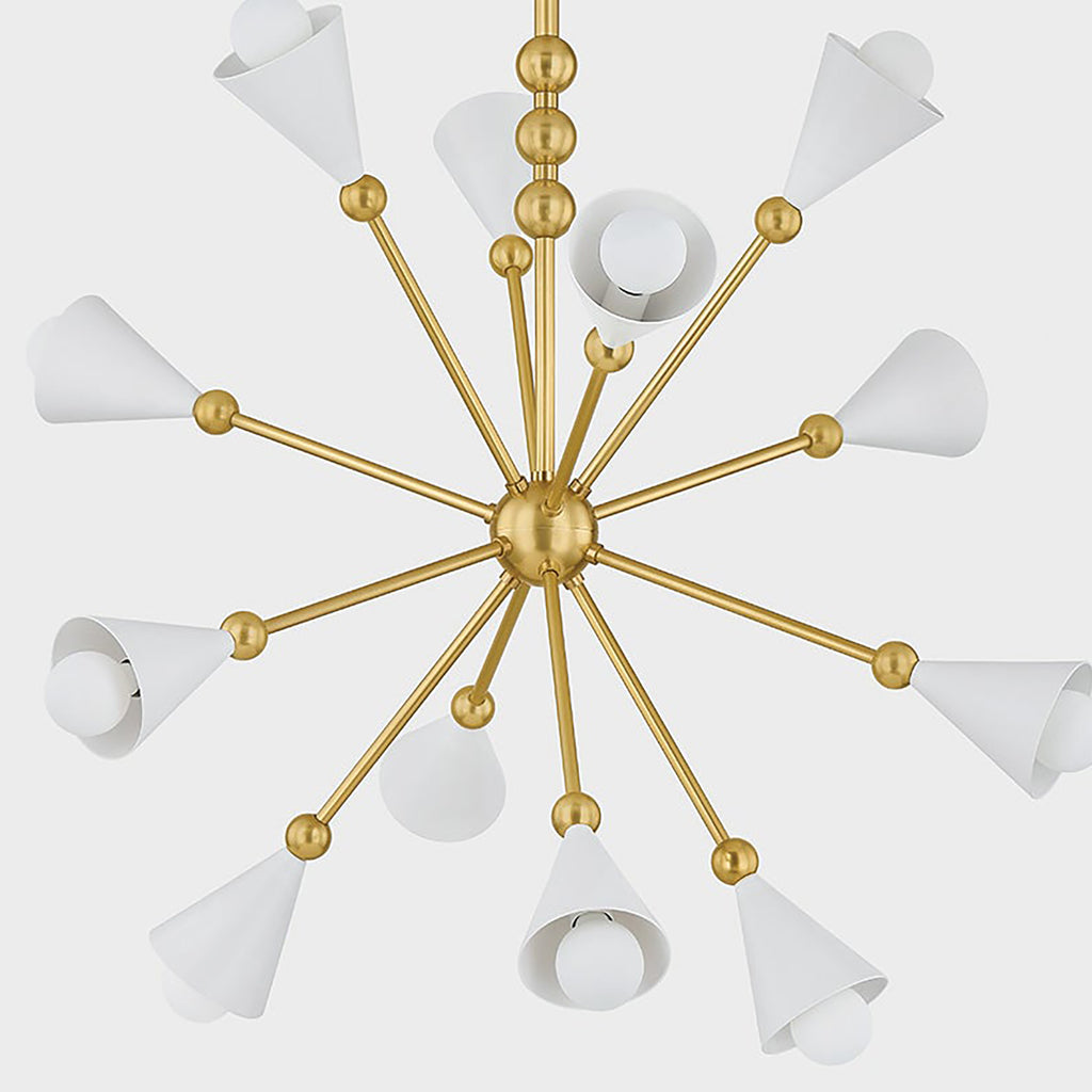 The flamboyant sputnik design of the Mitzi Hikari chandelier bursts with confidence. Casting light in all directions, twelve soft white conical shades complete the Aged Brass satellite structure. Small spheres dot each arm like jewels, adding a decorative note to this mid-century modern revival. Part of our Dabito x Mitzi Tastemakers collection.