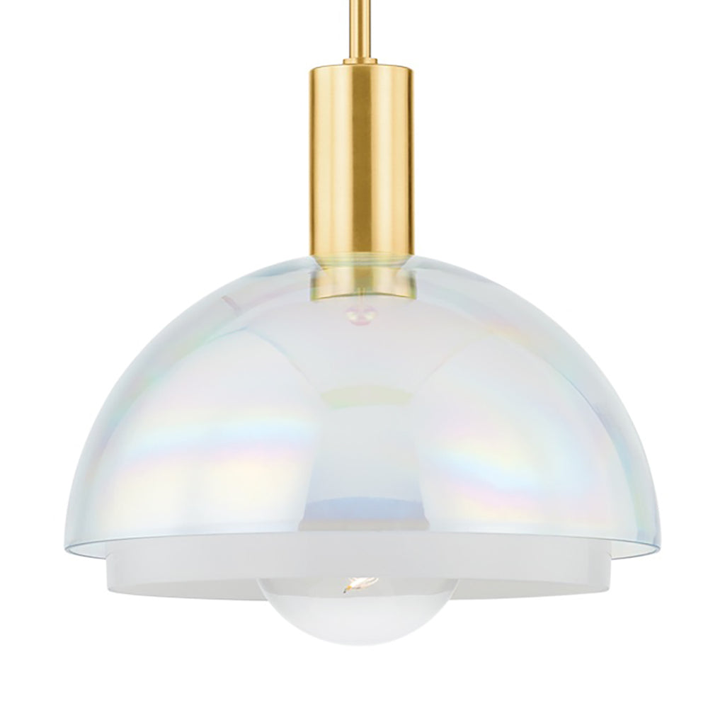 Playing with the layering of glass, Mitzi Modena Pendant features two spherical shades that encircle the light source, creating a bubble-like halo. An opal interior shade is paired with an iridescent exterior shade, creating an ethereal interplay of light and shapes. The Aged Brass metalwork adds to the luxurious feel of the fixture as it reflects the light.