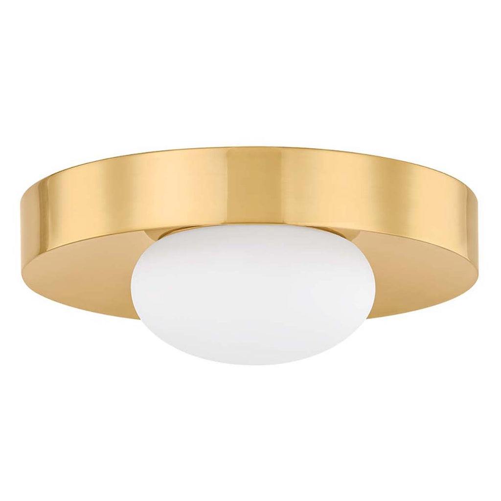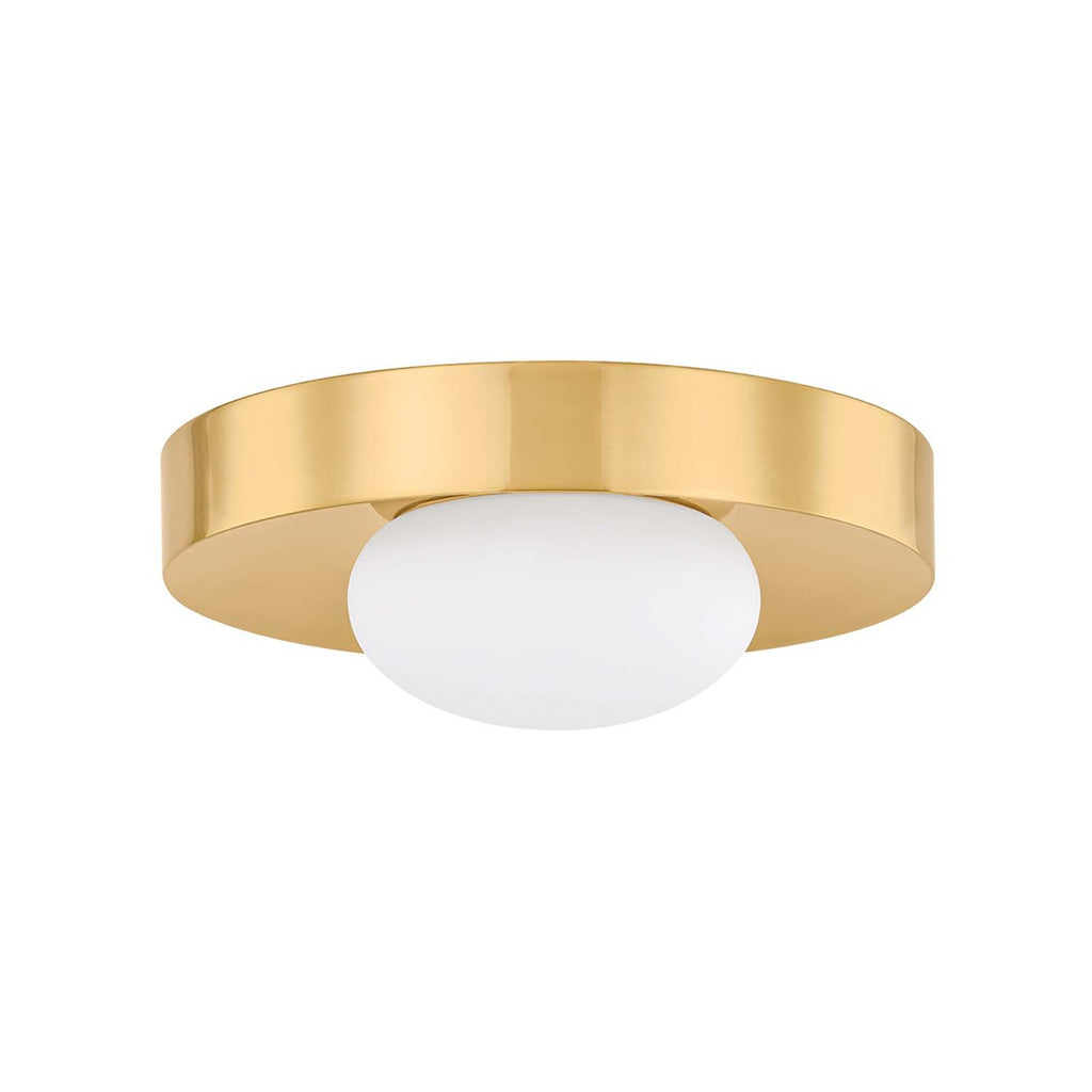 The embodiment of modern simplicity, Mitzi Pepa uses pared-down Art Deco design motifs to create an accessible close-to-ceiling mount. Serving as a sleek reflector, the slightly concave Aged Brass canopy embraces a soft opal glass shade like a halo. The organic shaping of the matte glass shade offers a counterpoint to the gleaming metal, creating enough visual tension to catch the eye without overwhelming a space.