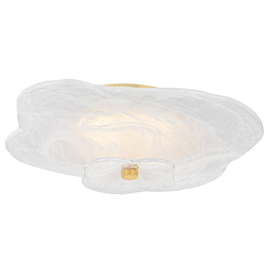 Soft, organic, floral. The petal-like layers of the Mitzi Starlie flush mount create a stunning cloud-like bloom from below. Made of beautiful swirled Piastra glass, this ethereal fixture diffuses light through its layered curves. An ornamental finial in Aged Brass adds a luxurious accent to the floaty silhouette.