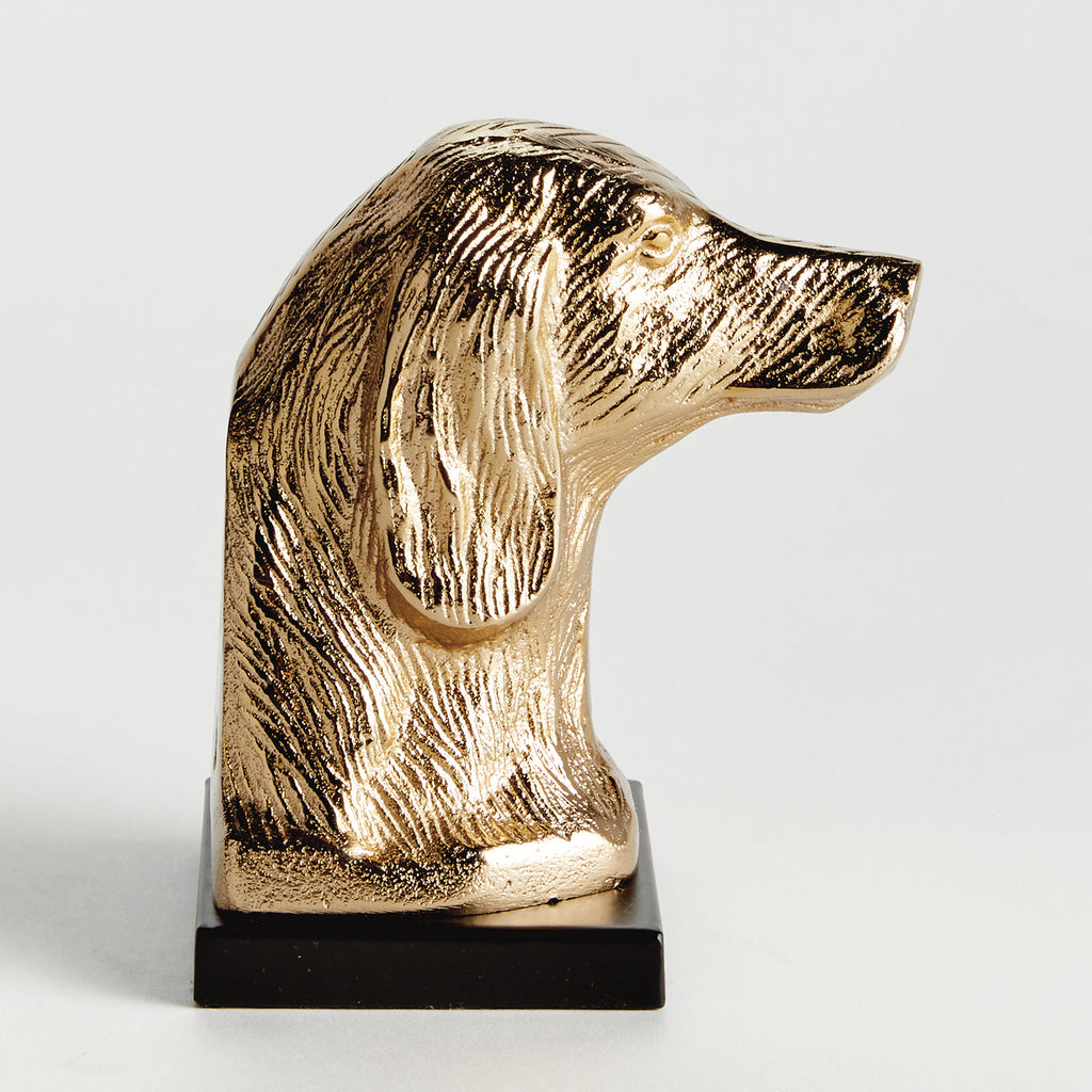 This dog bust is rather regal, don't you think? With all the signature characteristics of a springer spaniel, alert & ready for the hunt, we're captivated by it's gaze. Hand crafted using a centuries old sand cast method, it is then finished with a rich golden hue. Great tucked in a bookshelf as a stand-alone sculpture, or can also be used as a bookend.