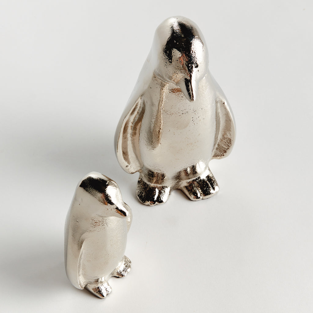Hand crafted using a centuries-old sand cast method, this set of 2 adorable upright penguin sculptures is a charming little accent. Made of cast aluminum, it is then finished with a reflective silver hue. On coffee table, console or countertop, this precious duo will steal the show.
