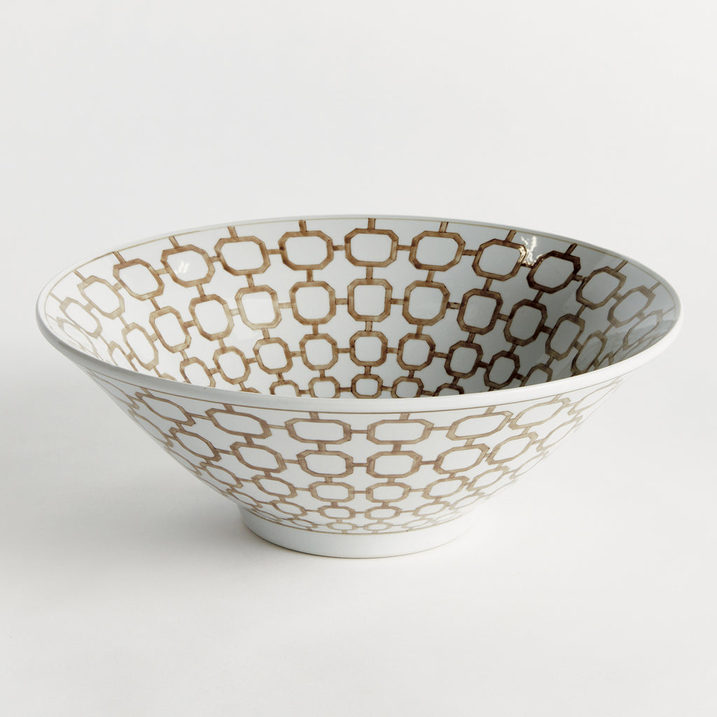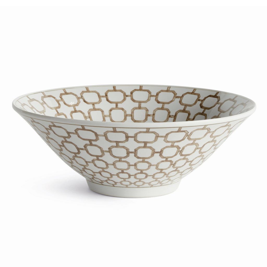A classic chinoiserie pattern in taupe and white. In design, taupe is often associated with muted, sophisticated qualities. It evokes balance and timelessness. A tone that plays well in any palette, and is an inspired design choice for this elegant decorative footed bowl. A welcome addition to kitchen island, coffee table or mantel.