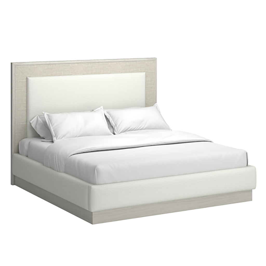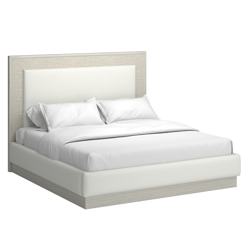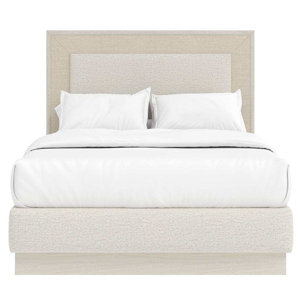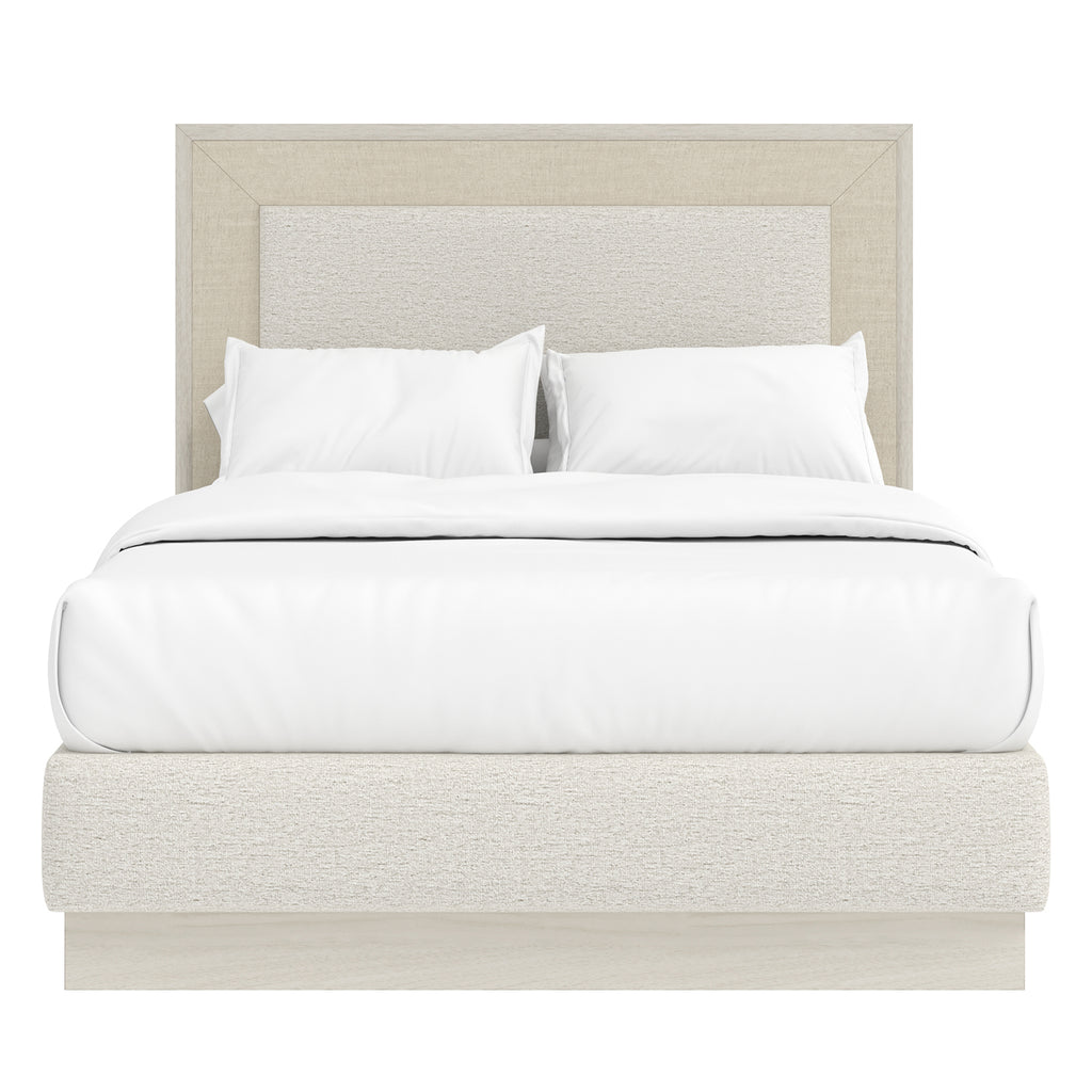 Form complements function beautifully in this modern panel bed, showcasing a solid base frame in a warm neutral finish highlighted by woven fabric wrap and an inset cream upholstered headboard. Reminiscent of strikingly geometric mid century architecture, the headboard and frame present vintage-inspired style with modern appeal.