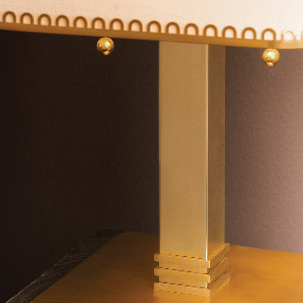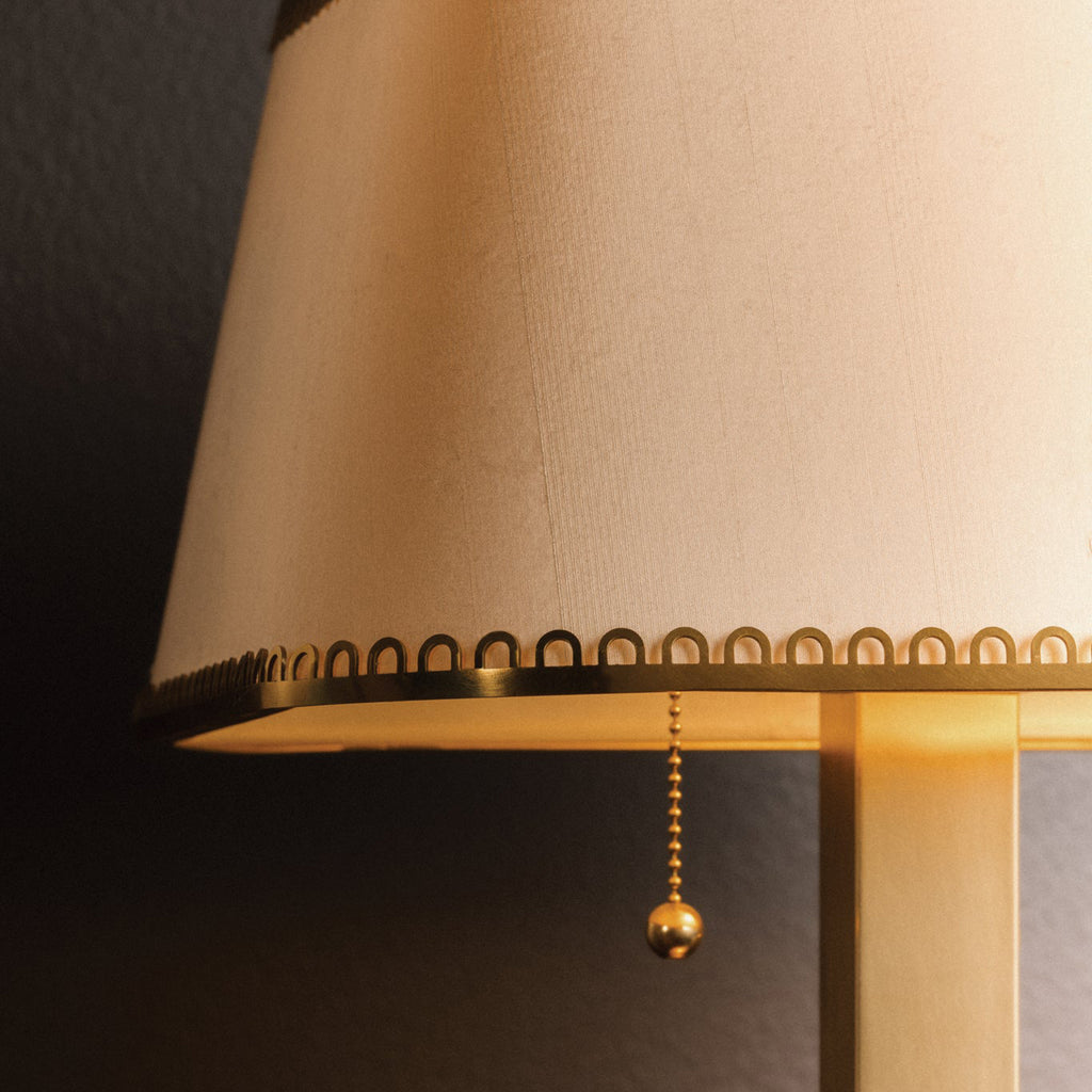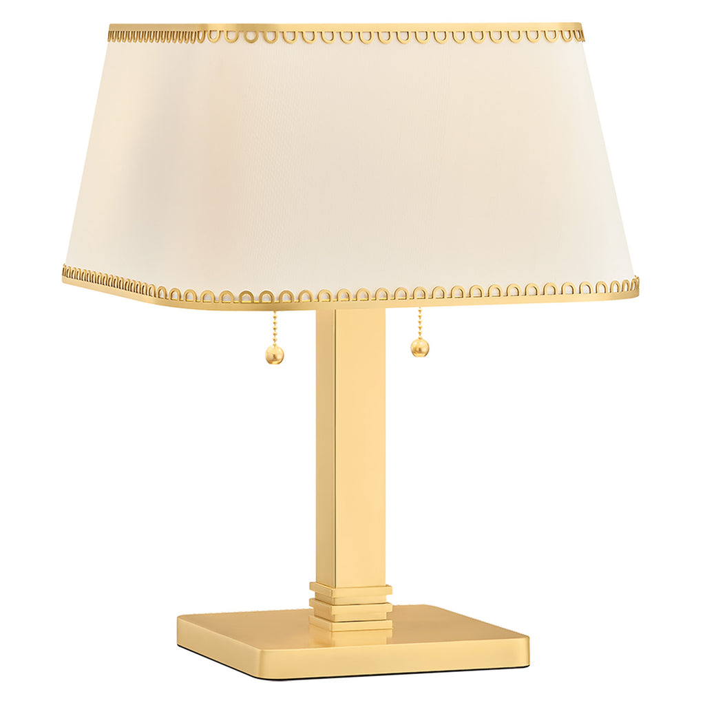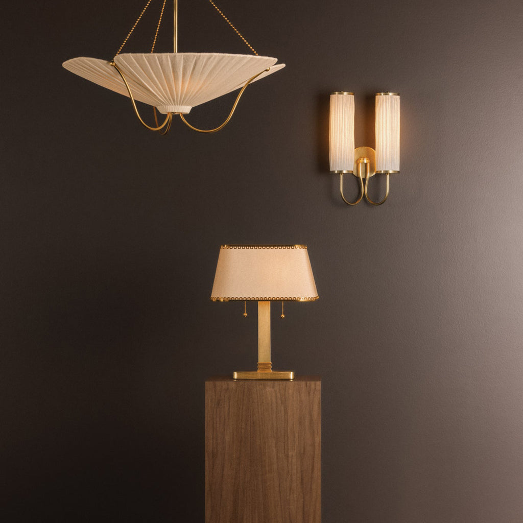 Hudson Valley Lighting Claude brings sculptural presence to a compact form, pairing a crisp, tailored silhouette with refined, vintage-inspired detailing. A square raw silk shade is delicately edged with lace-like metal perforations—an unexpected interplay of softness and structure. The Aged Brass finish, decorative pull chain, and twisted fabric cord evoke a sense of nostalgic charm with a modern sensibility.