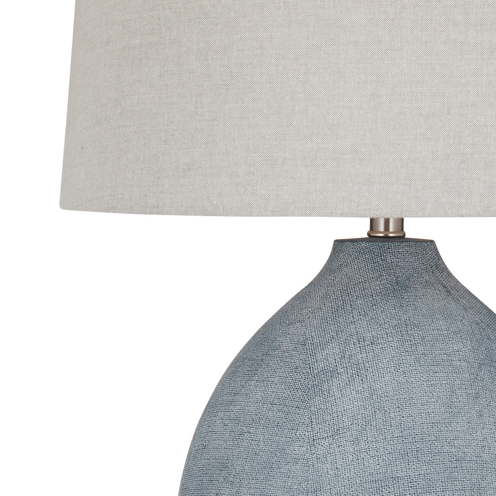 The Leith Table Lamp brings a relaxed coastal feel with its denim-inspired base, featuring a textured surface in a soft, dusty blue finish. Topped with a cream-colored tapered drum shade, this lamp balances casual charm with subtle sophistication, making it a versatile accent for any serene, beach-inspired space.