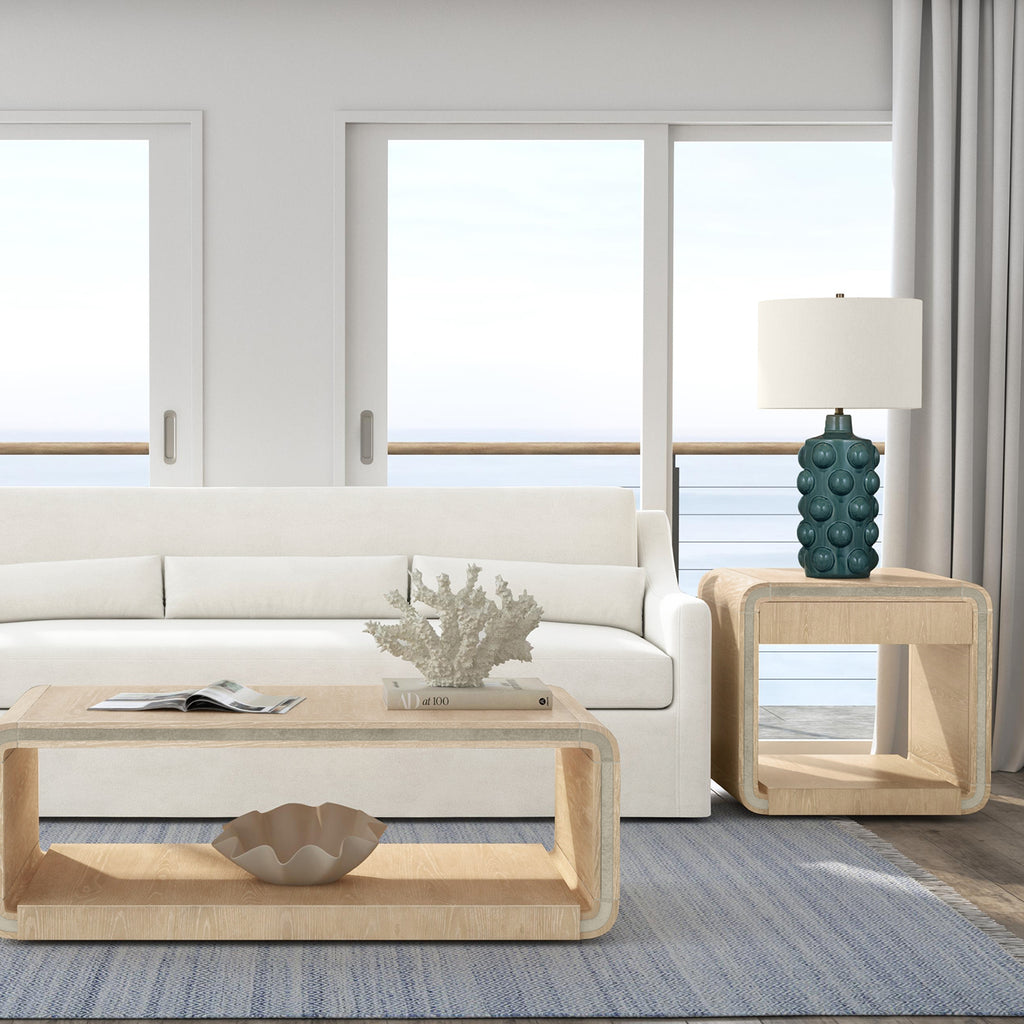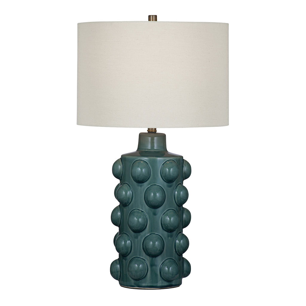 The Lynn Table Lamp features a blue-green ceramic base with intricate knob details, adding a touch of artistry and character to any space. The soft, neutral linen shade creates a warm, inviting glow, perfect for enhancing the ambiance of your room. Its unique design combines vibrant color with subtle craftsmanship, making it a versatile addition to a variety of decor styles. The Lynn Table Lamp offers both style and functionality, bringing a refined and welcoming touch to your home.