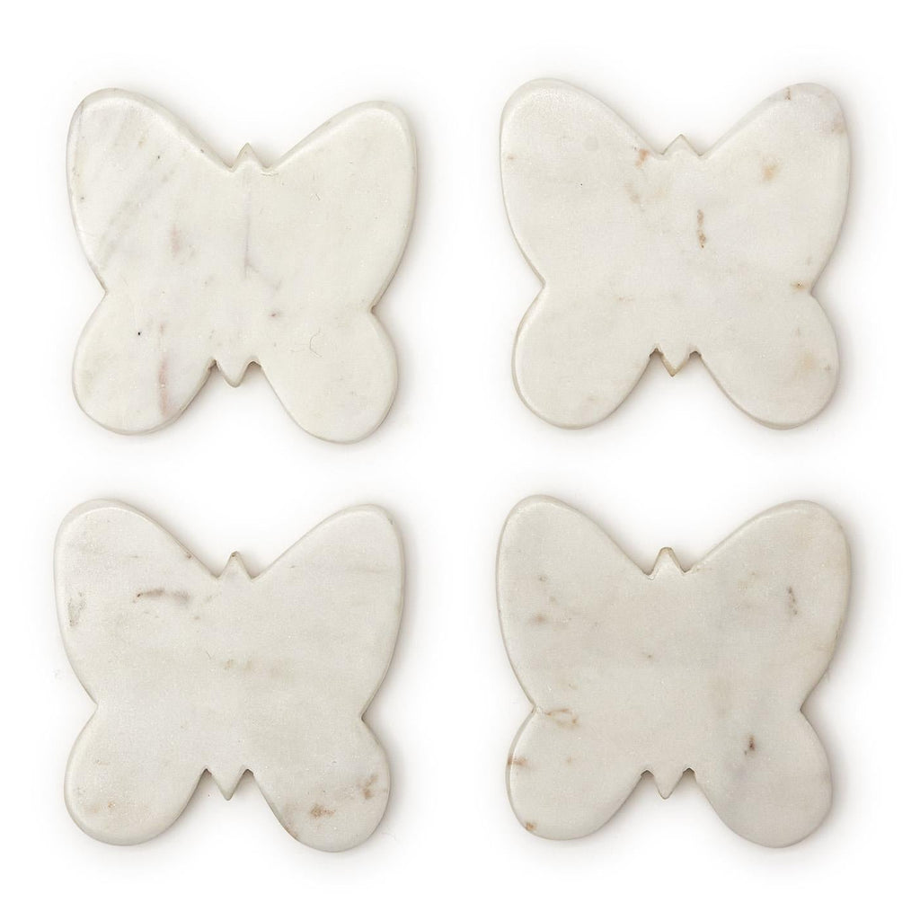 Slices of white marble shaped as butterflies makes this coaster set so special. Made by skilled craftspeople, these coasters protect surfaces from heat and condensation. Tied together with twine, the quartet is ready for gift giving.