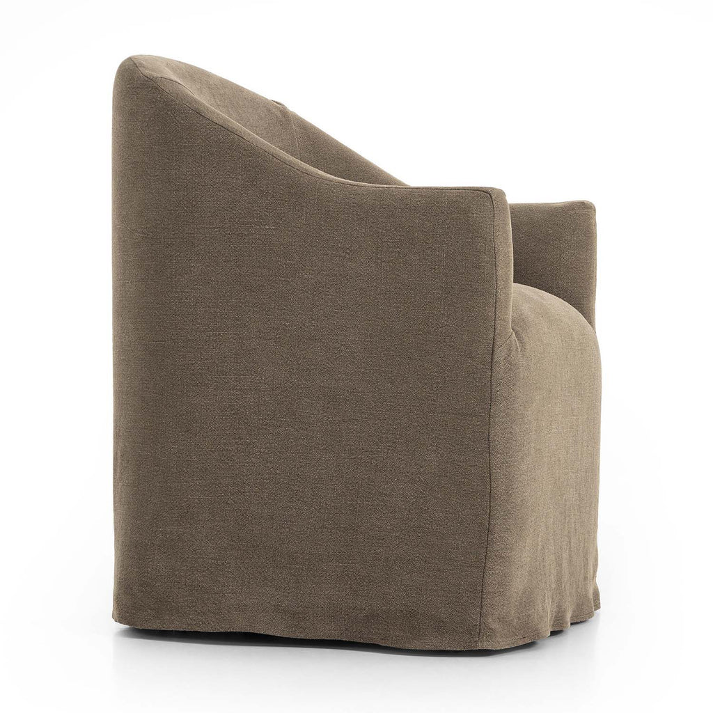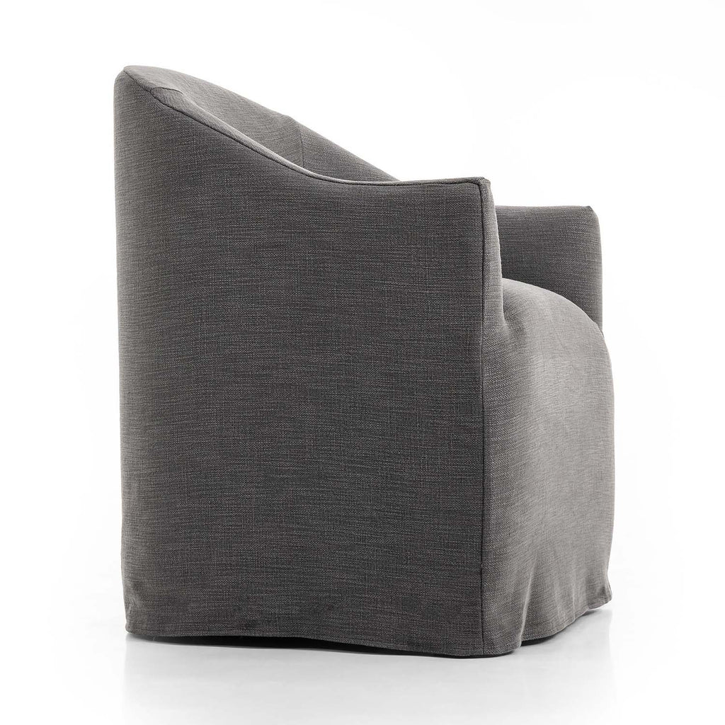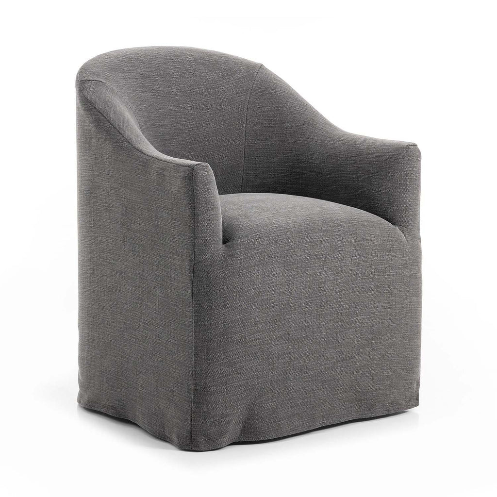 A polished form with curved lines and upholstered, this chair brings quiet luxury to the dining room. Functional casters allow easy movement.