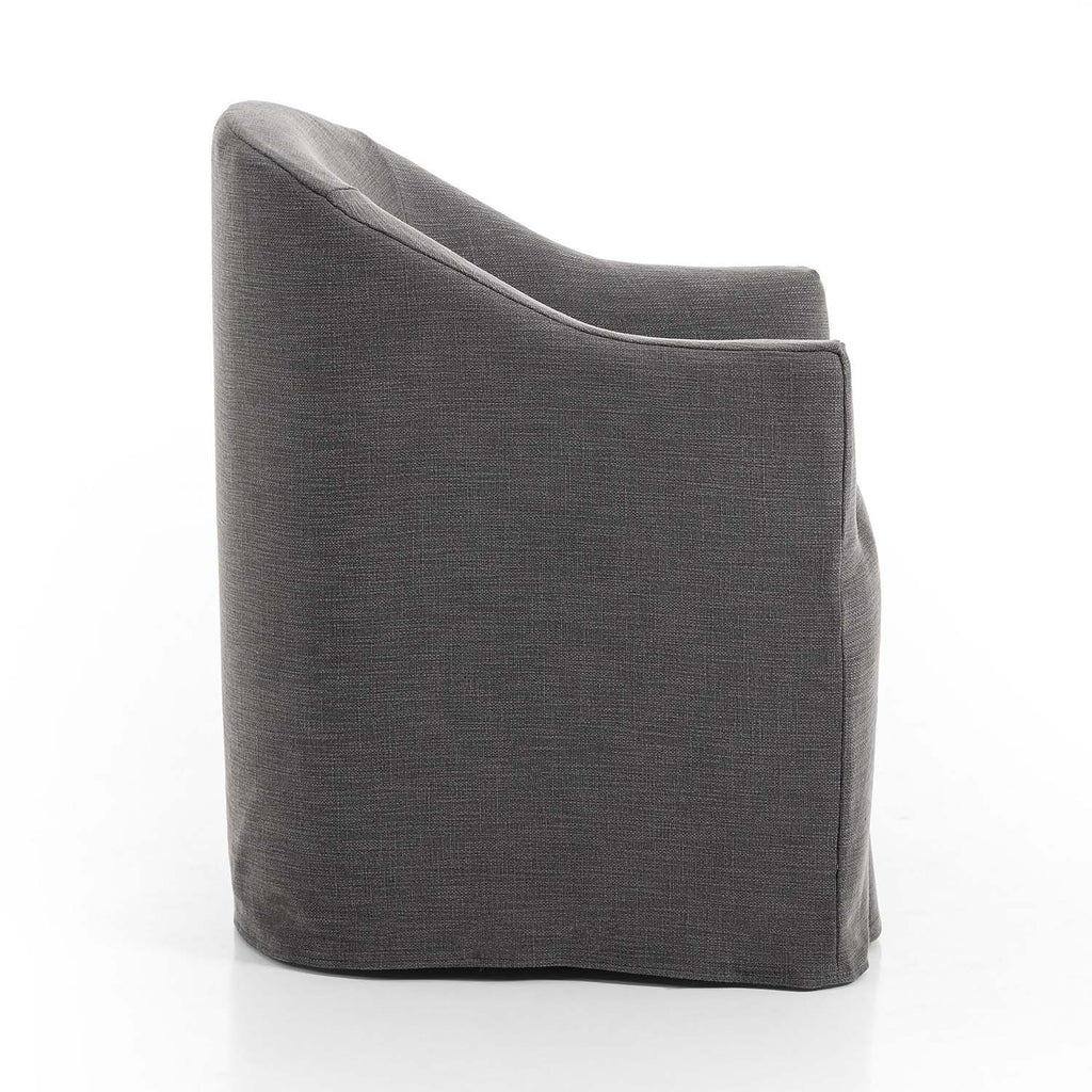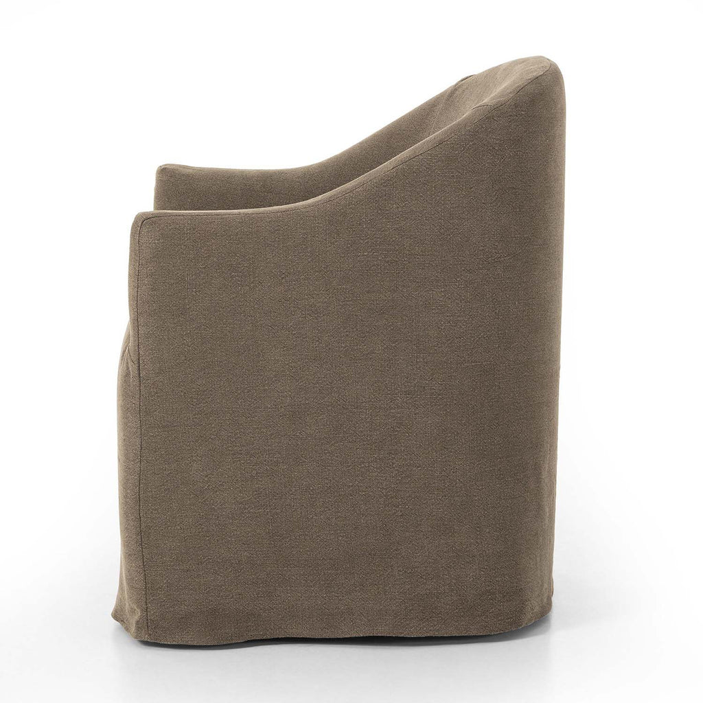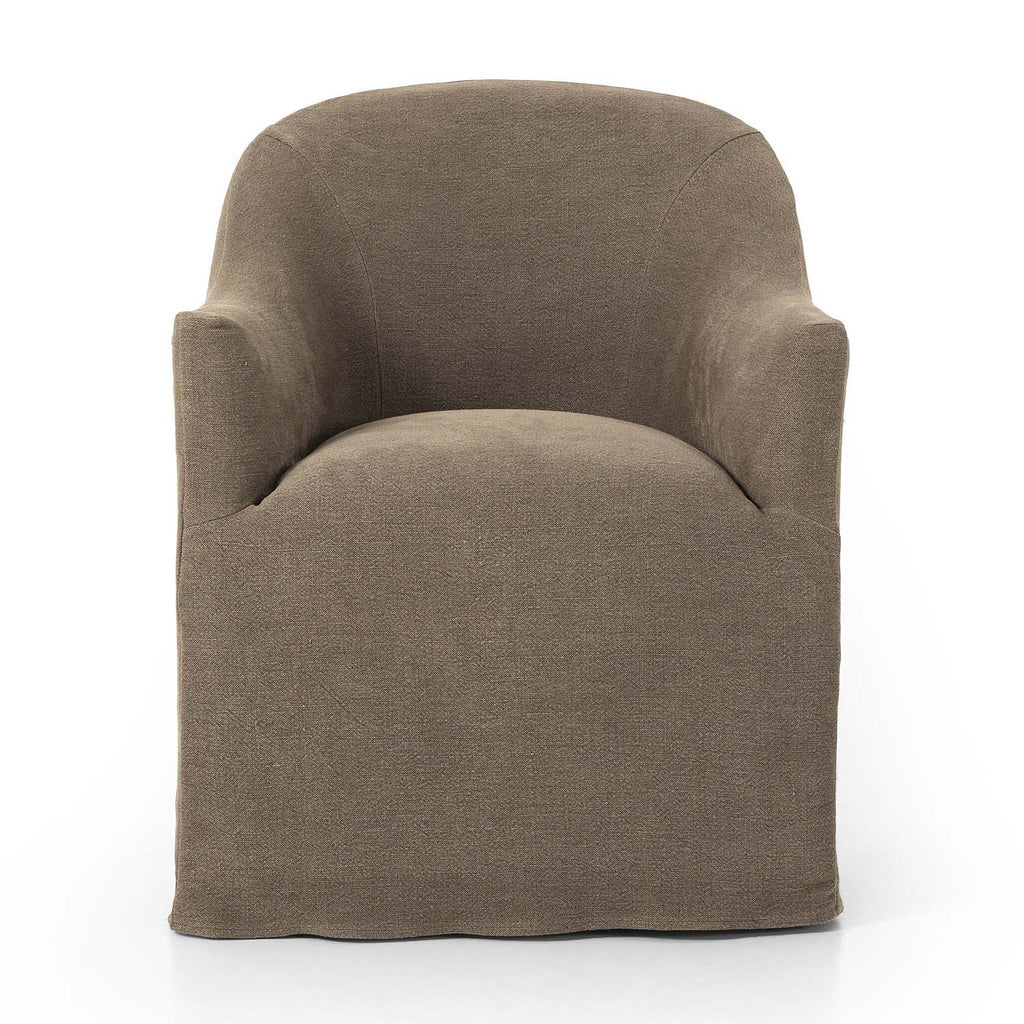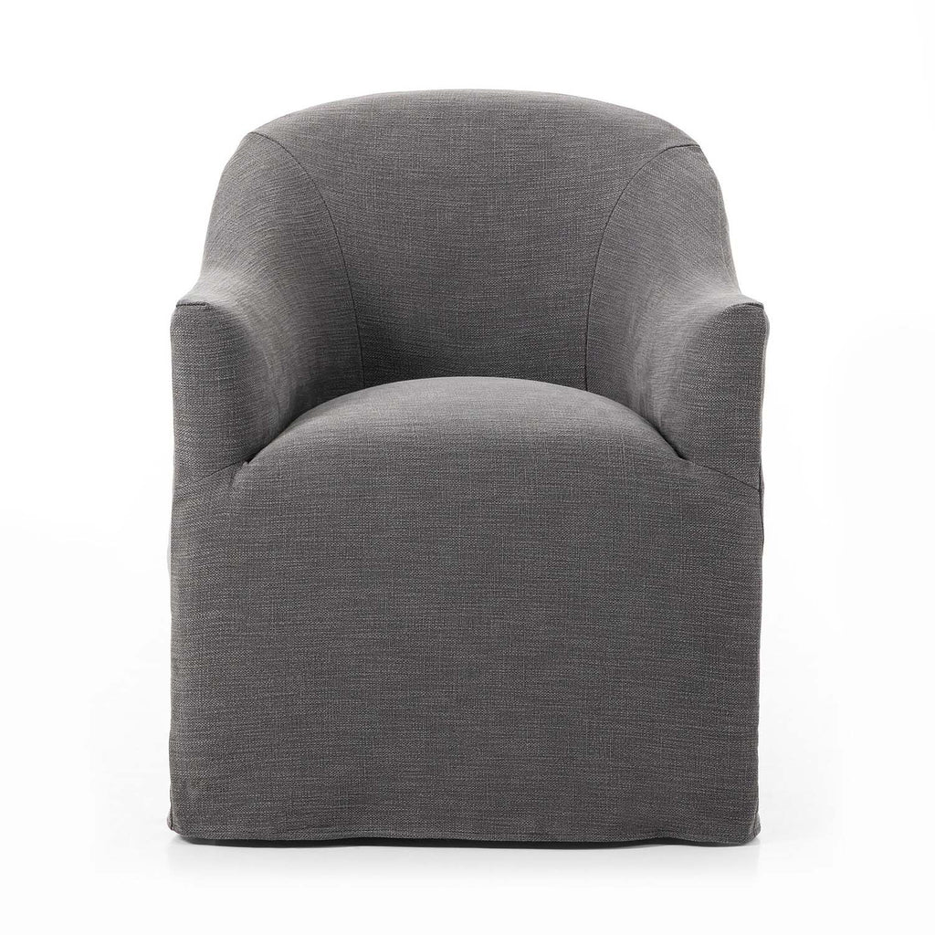 A polished form with curved lines and upholstered, this chair brings quiet luxury to the dining room. Functional casters allow easy movement.