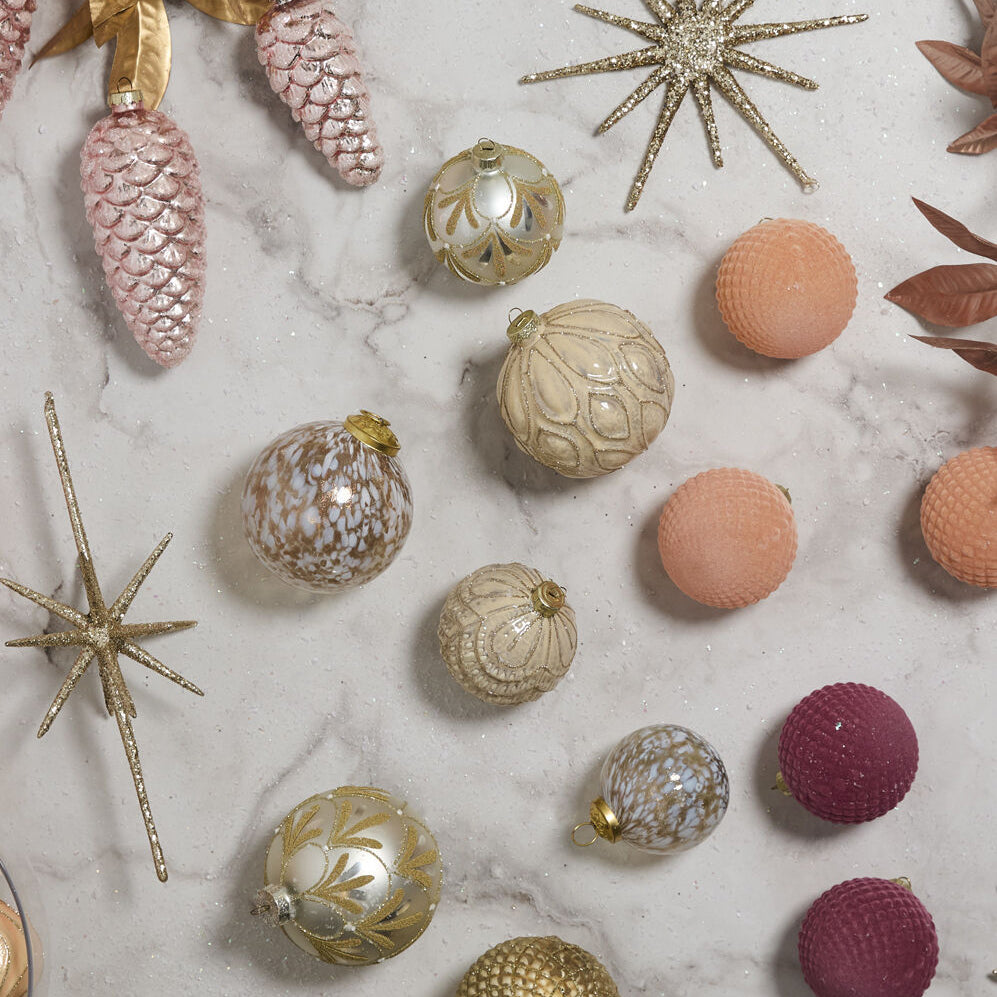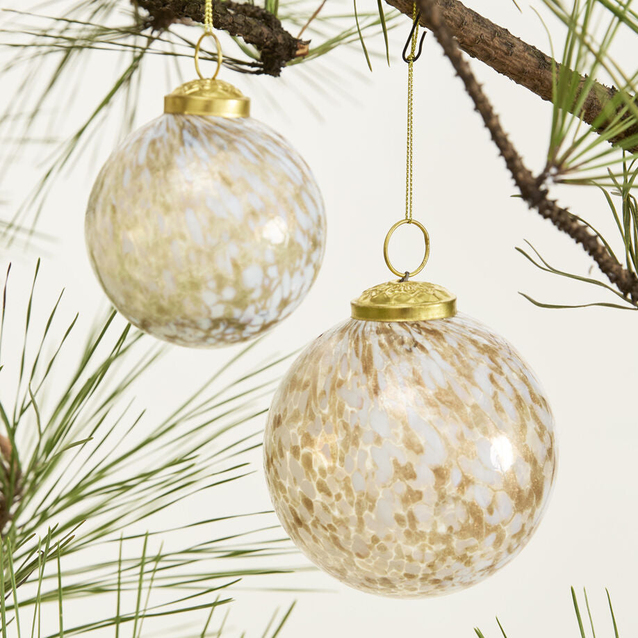 Create a classic, cozy Christmas tree with the Glimmerveil Ornament Collection. Available in two sizes, each globe shaped ornament has a sturdy metal cap, and features a blend of metallic gold and cool white flecks that wrap around the whole ornament. Each is a unique mouth blown work of art that adds a festive shine when layered in amongst string lights.