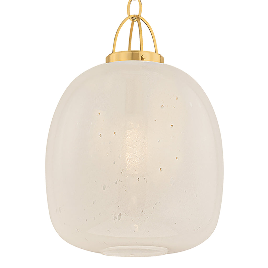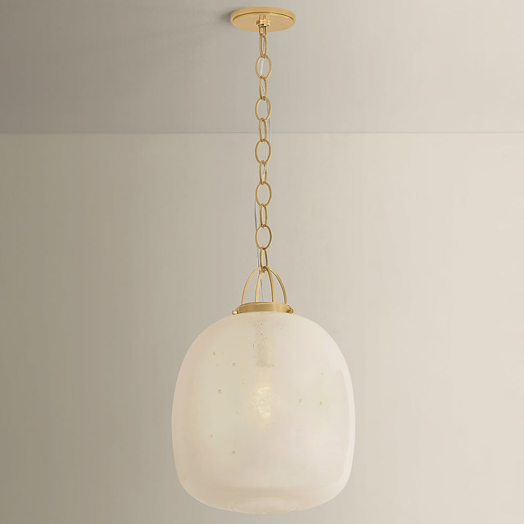 The Hudson Valley Lighting Enosburg pendant pairs a soft organic shape with novelty metalwork. An oblong cloud seedy glass shade is supported by a cage-like suspension and chain finished in Aged Brass. The bubbling of the glass attracts the eye with its subtle, energetic texture. Available in two sizes, Enosburg makes a compelling statement over a dining table or when grouped above a kitchen island.