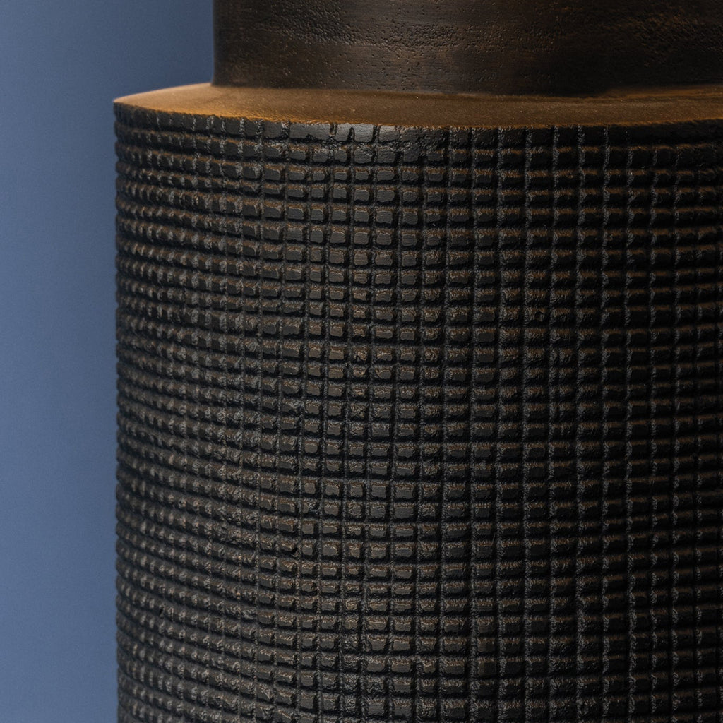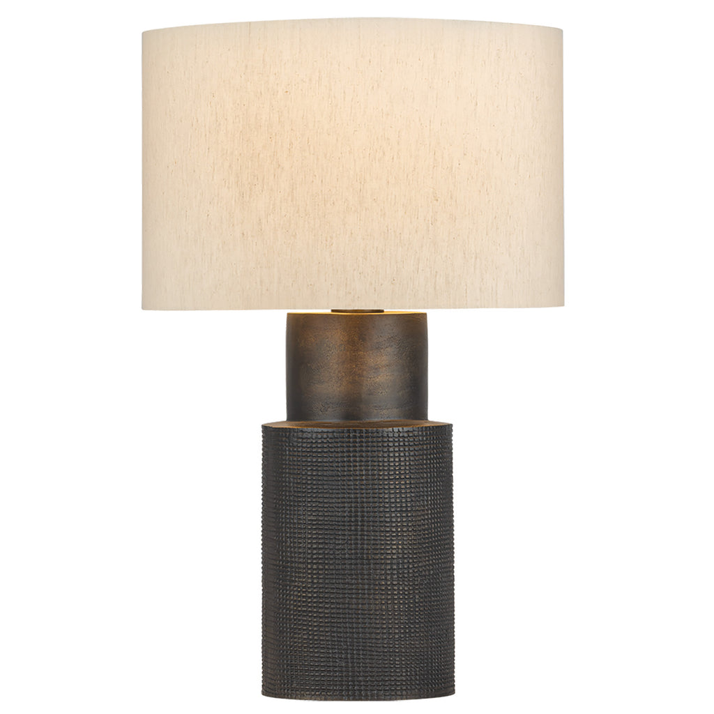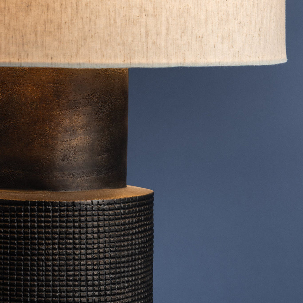 Handcrafted in India, the Hudson Valley Lighting Farmingdale table lamp taps into the trend for artisanal pieces. The cast aluminum base features a stacked, cylindrical shape with a highly textural grid pattern and exposed edge detailing. A smooth neck provides a break in texture, while the natural linen shade softens the overall look. Dark Bronze hardware coordinates with the metalwork of this striking lamp.