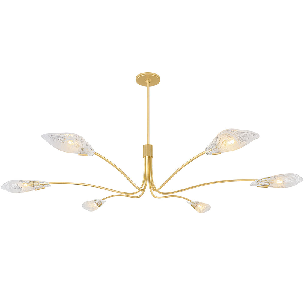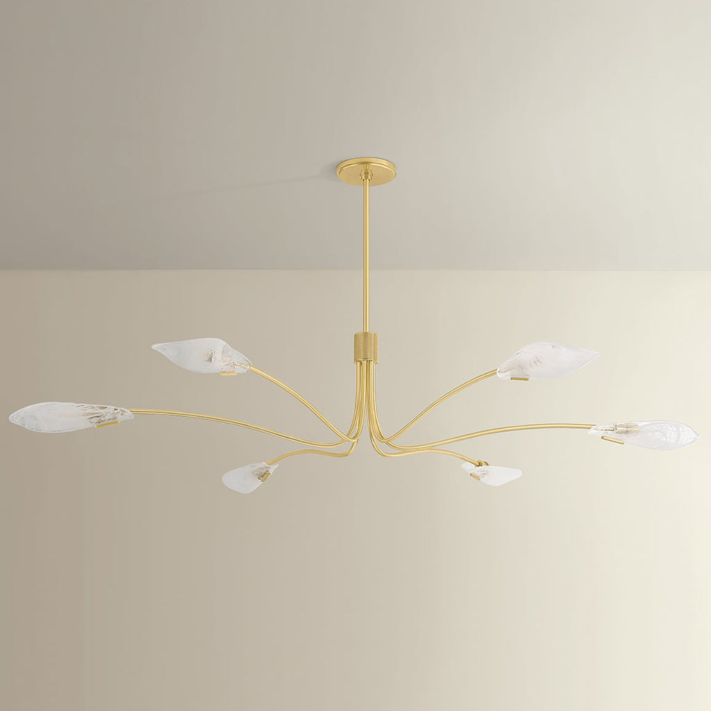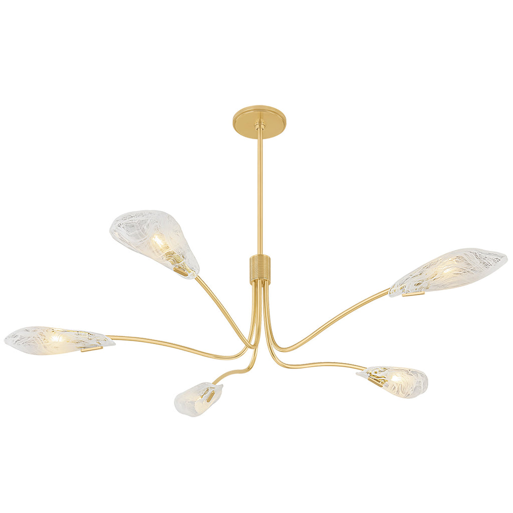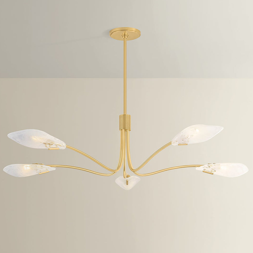 Inspired by the shape of calla lilies, the sprightly Hudson Valley Lighting Tenafly chandelier features piastre glass shades that bloom outward. A reeded central detail adds texture, referencing a string-bound floral bouquet. To complement the ethereal glass, the slender arms are elongated and curved. Finished in Aged Brass, Tenafly is available with 5 or 6 lights.