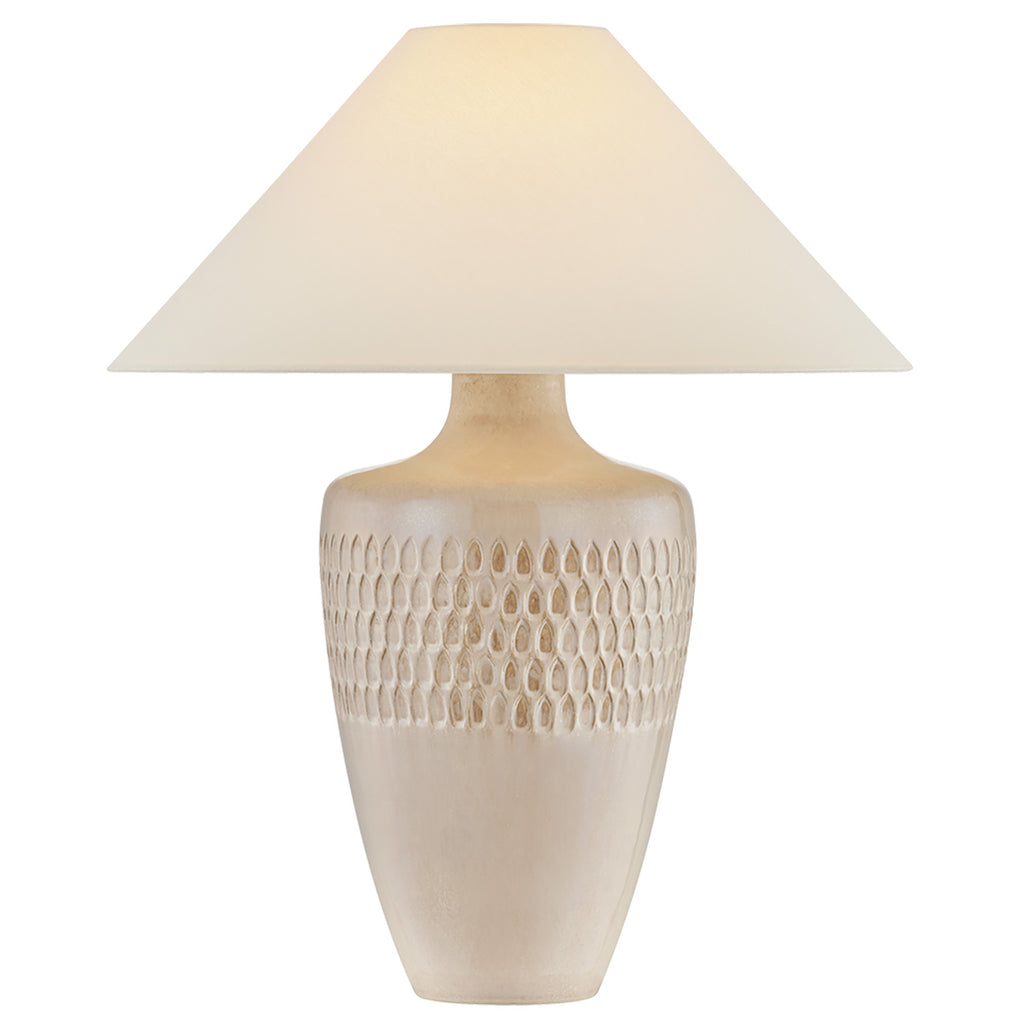 The neutral reactive glaze, botanically-inspired indentations, and classic urn shape of the Hudson Valley Lighting Valleydale lamp make for a soothing modern staple. Rows of tear-shaped ‘leaves’ set the primary base pattern while understated texture and painterly interest stem from the Reactive Manchado Glaze. To complete this calming lamp, an off-white linen shade adds a soft, elegant finish.