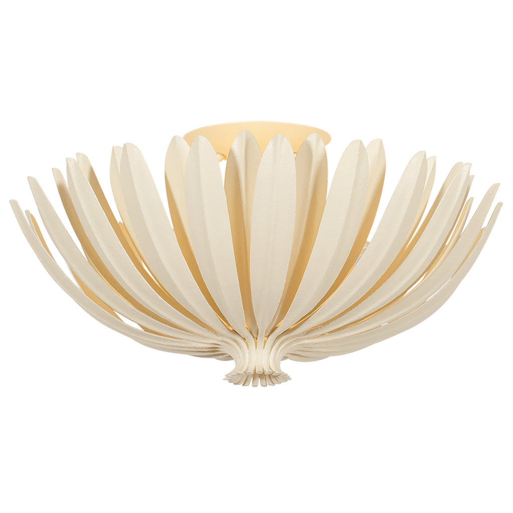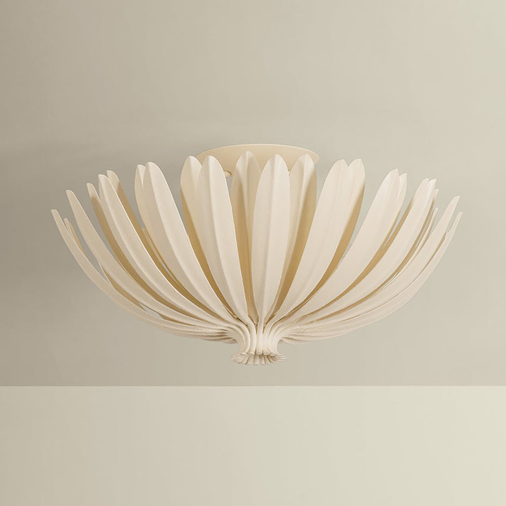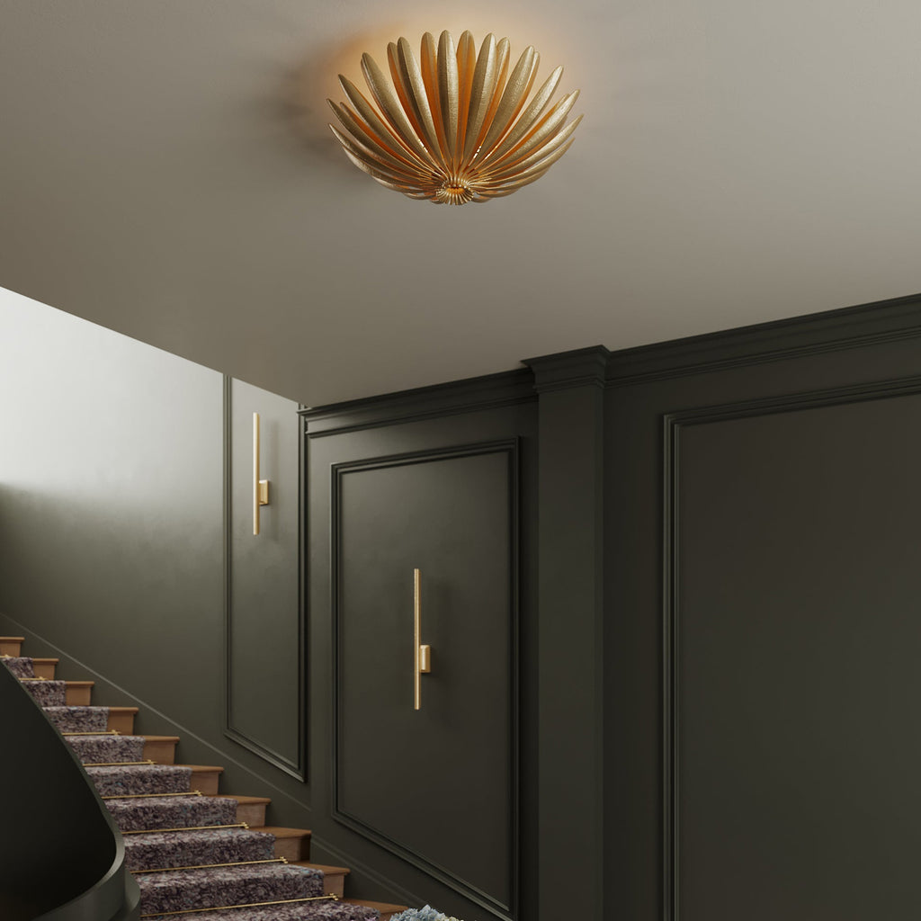 Leaning into a botanical motif, the Hudson Valley Lighting Whitfield family is defined by elongated leaf-like metal pieces that form a glowing shade around the light source. As light emanates outwards, it filters through the layered foliage. Available as a 1-light wall sconce, a semi-flush mount with 3 lights, and three sizes of chandelier, Whitfield comes in a Vintage Gold Leaf finish or our new Cream Plaster finish, a soft alternative to white.