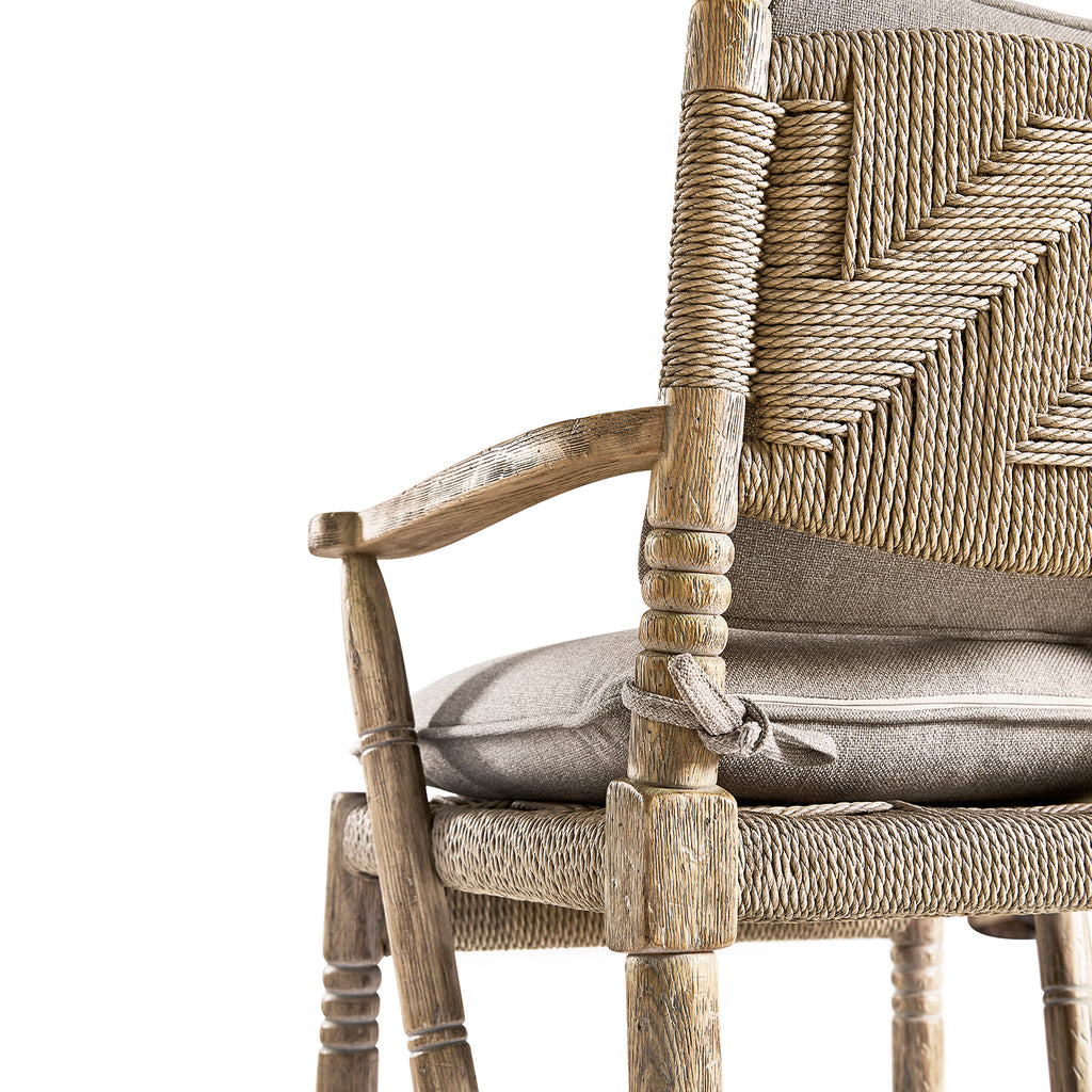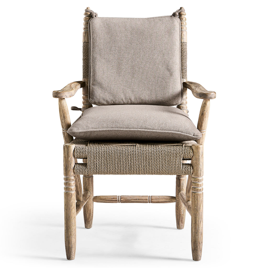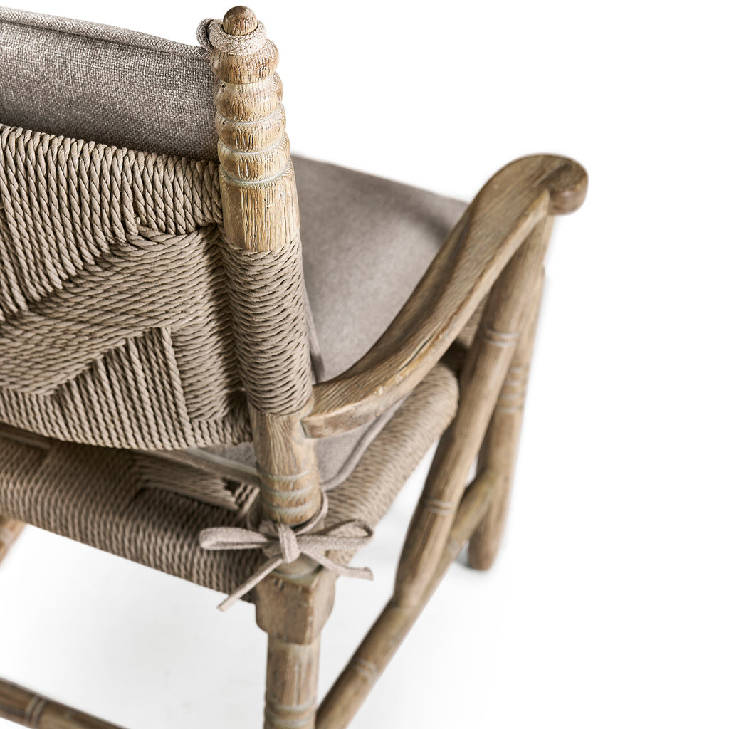 The Sagehill Rush Seat Arm Chair is a charming addition to any dining or living space, blending casual aesthetics with fresh style. Finished in a weathered grey oak, this chair exudes a timeless appeal. The seat and back feature a beautifully hand-woven rush pattern, adding texture and a touch of traditional artistry. Enhancing the comfort, the chair includes two removable tie-on cushions for a versatile look. Whether paired with a dining table or used as an accent chair, the Sagehill Rush Seat Side Chair brings a cozy feel to your home.