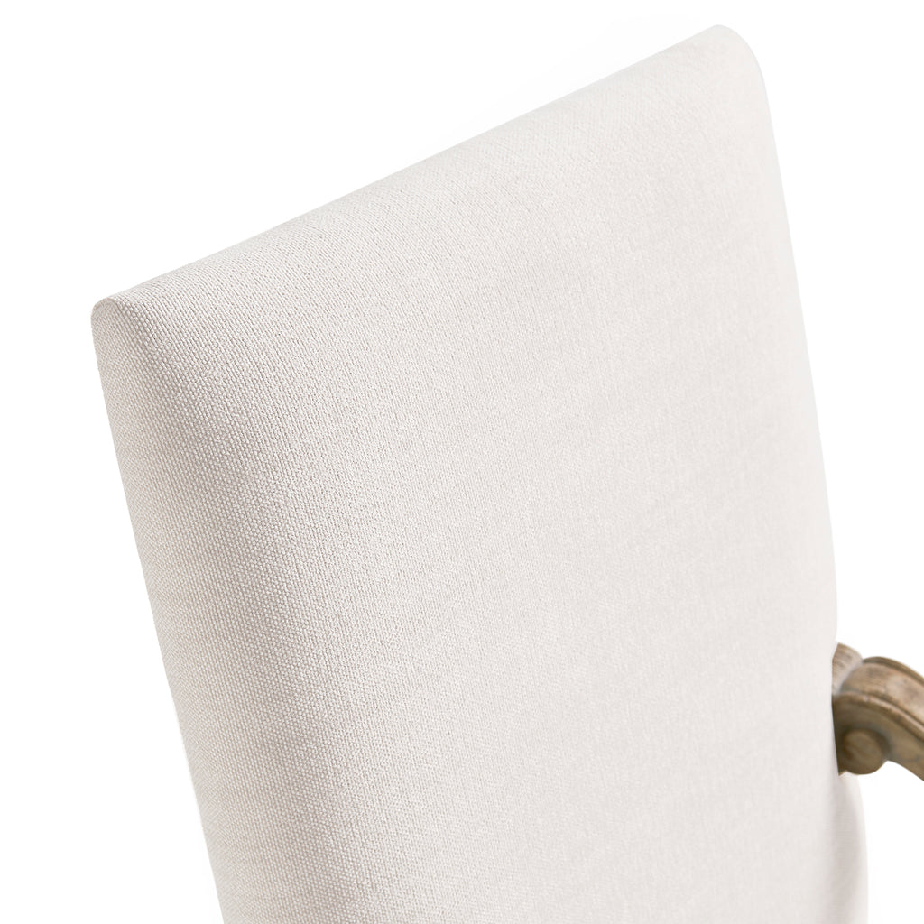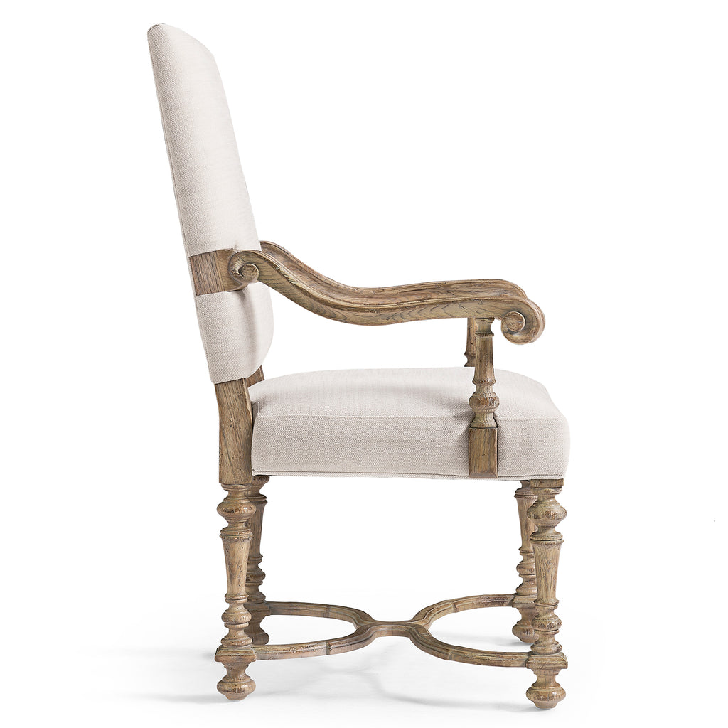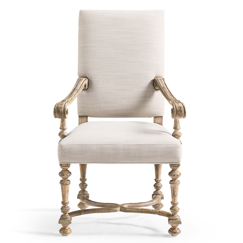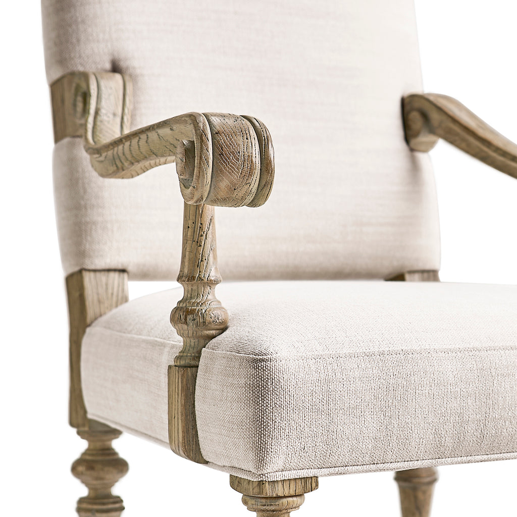 The Sagehill Upholstered Arm Chair seamlessly combines casual charm with a refined elegant style. Its beautifully turned legs and scrolled arms are finished in a weathered grey oak, offering a touch of traditional elegance while enhancing the chair's casual appeal. The seat is upholstered in a tightly woven fabric with a soft, warm ivory tone, offering a clean and versatile look that complements the natural wood tones. Perfect for everyday dining, this chair will offer style and comfort for years to come.