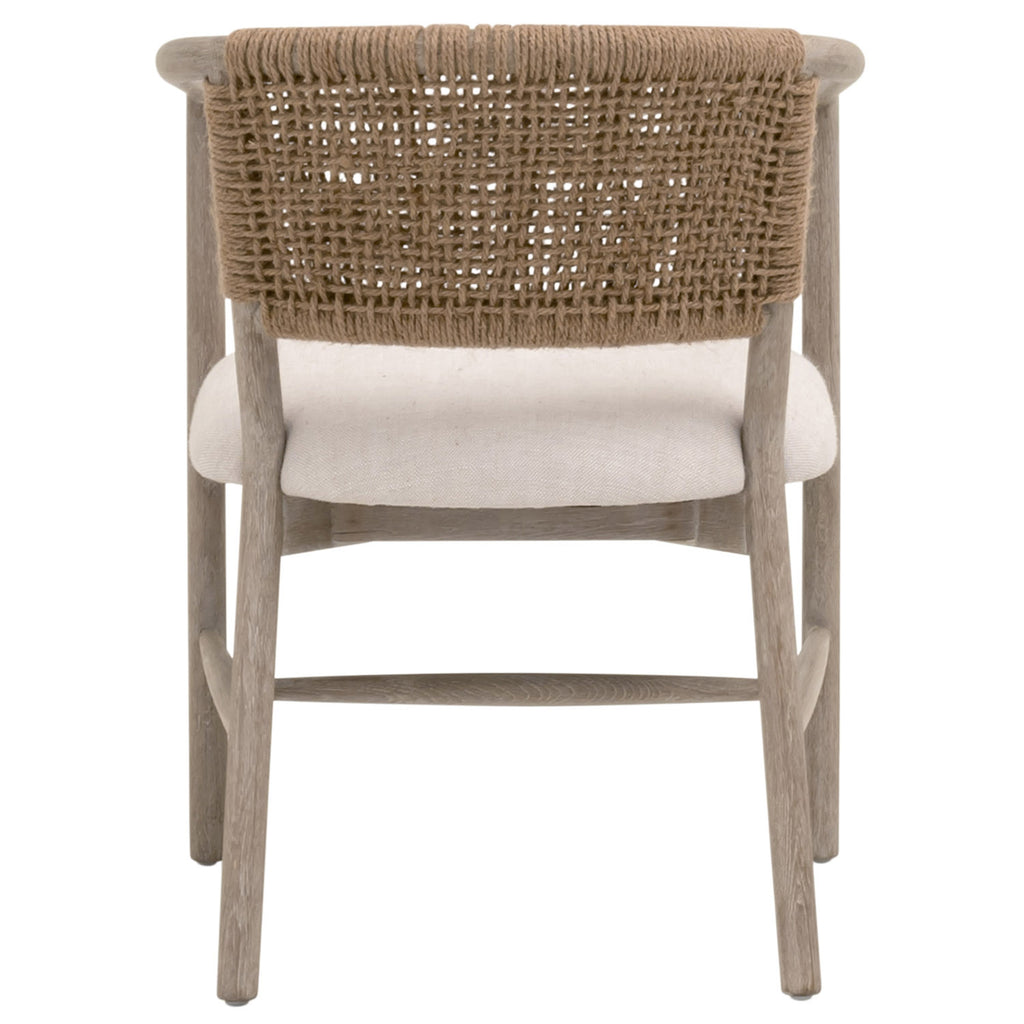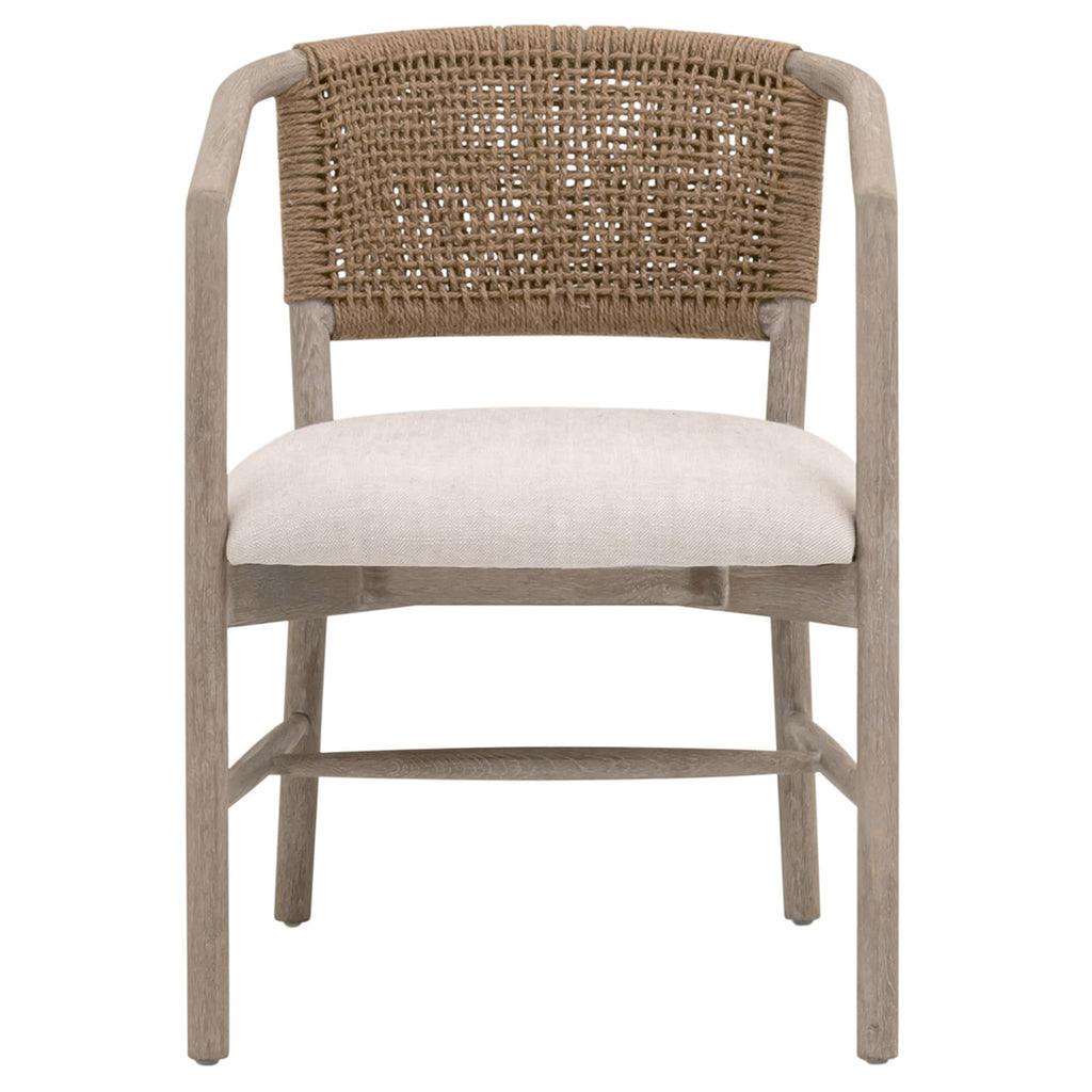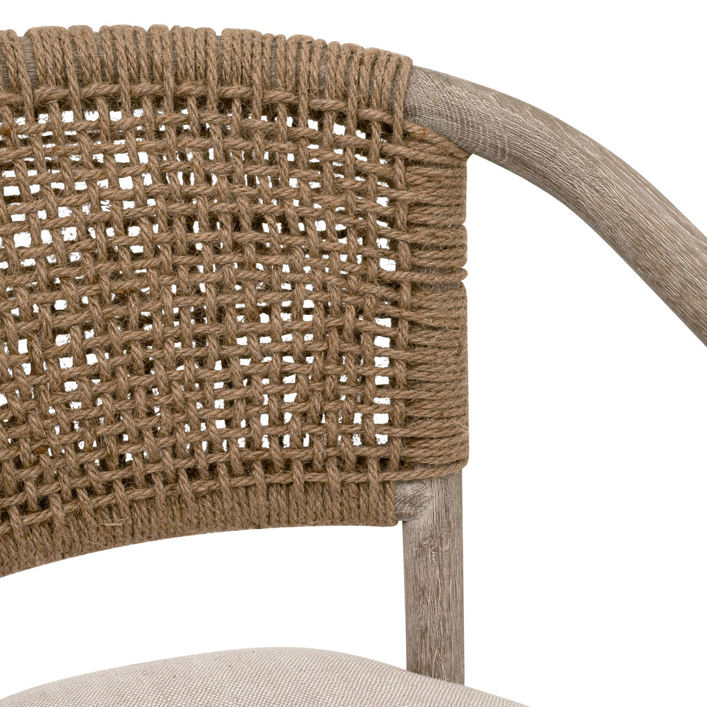 Enhance your living space with the Juxtaposition Accent Chair by Essentials For Living. This one-of-a-kind accent chair has a distinct and contrasting style, sure to be a stand-out piece in any room. Crafted with precision, this chair features a solid oak wood frame with a natural gray oak finish, embodying both durability and natural beauty. The fixed seat cushion is upholstered with bisque linen and polyester blend material. The handwoven jute twine backrest adds a touch of artistry and texture. It measures 22" wide, 24" deep, and 30.5" high, with a seat height of 19.25". This accent chair will be a captivating and functional addition to your space, offering both comfort and aesthetic appeal.