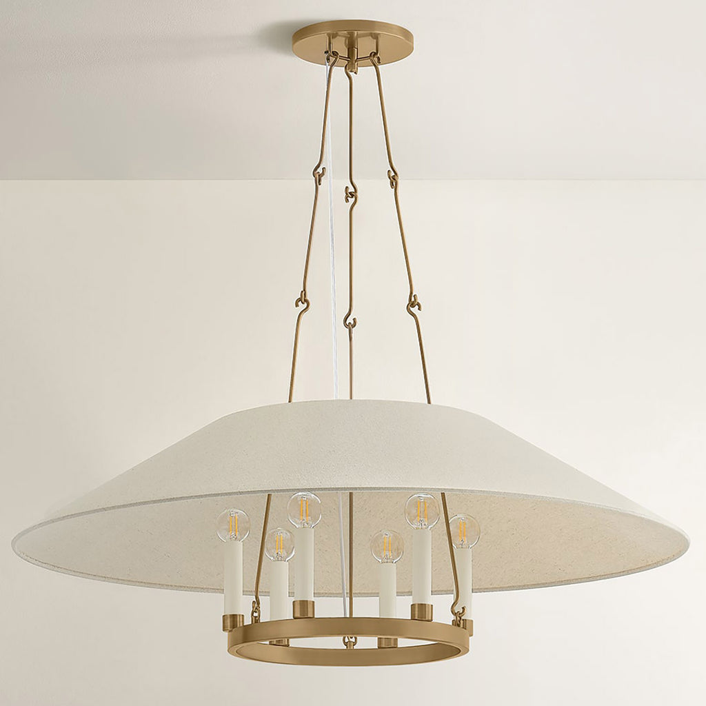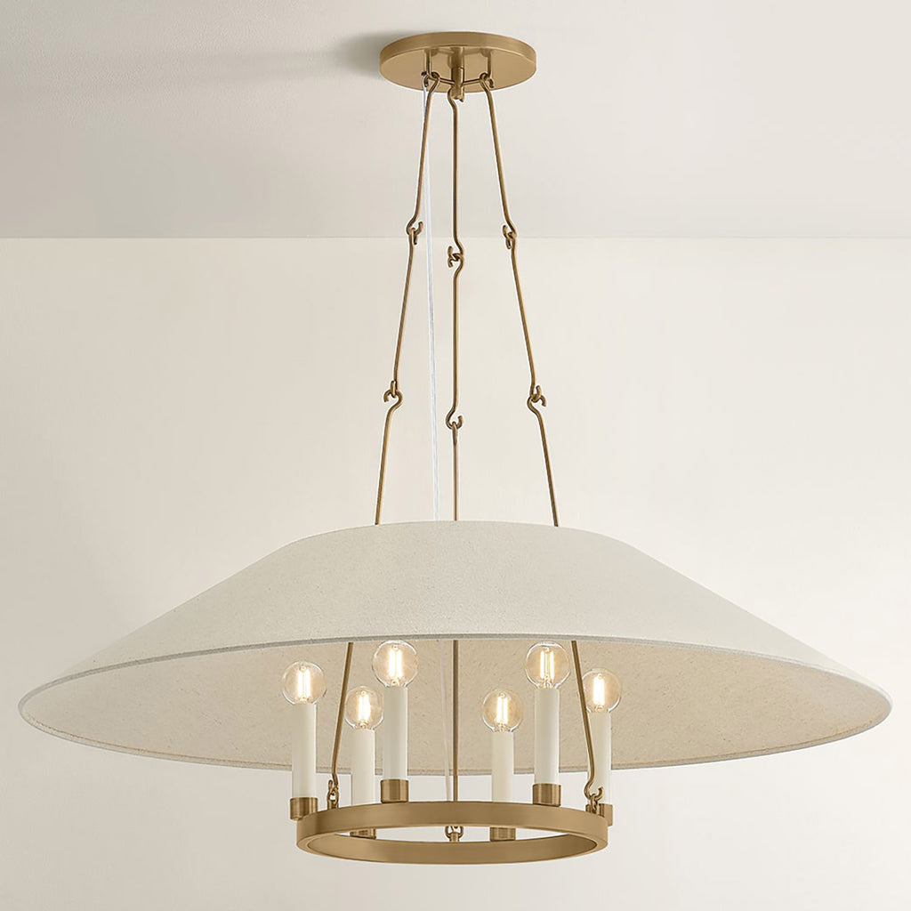 A cross between a ring chandelier and an airy lantern, Lauren Liess x Troy Lighting Archive blends familiar forms into something distinctly fresh. Candle-style lights are arranged within a metal frame, finished in Patina Brass or Bronze, and paired with cream candle sleeves that echo the soft, natural linen shade above. Available in two sizes, Archive makes an elegant statement above a dining table or gathering space.